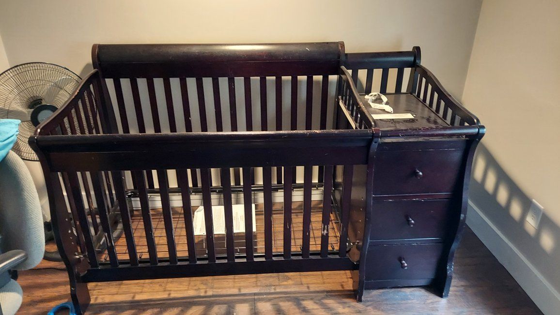 VenmoWell loved and worn crib, but still sturdy throughout its many years of faithful service. The height of the bed is adjustable. No mattresses.
