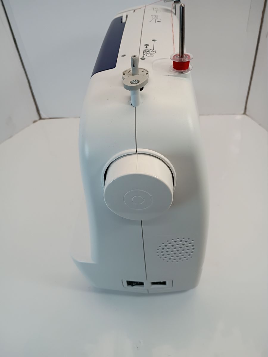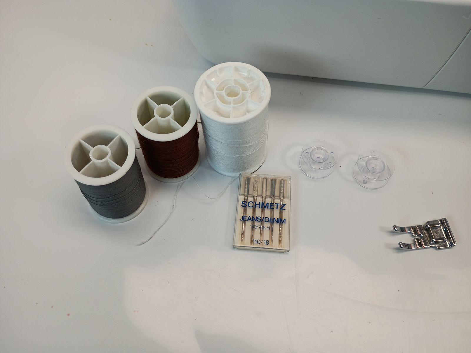 The machine comes with Case, Thread, Bobbins, Presser Feet, Needles and Foot Pedal.