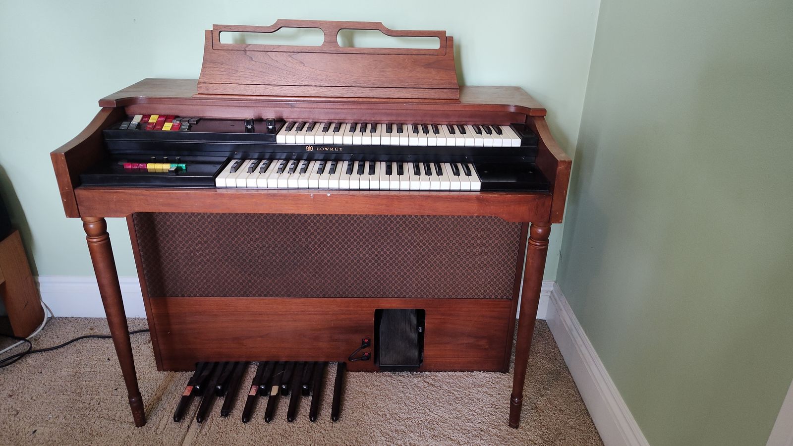 Lowrey organ with drum machine, FX loop, volume / pitch bend pedal, and 15 stops.