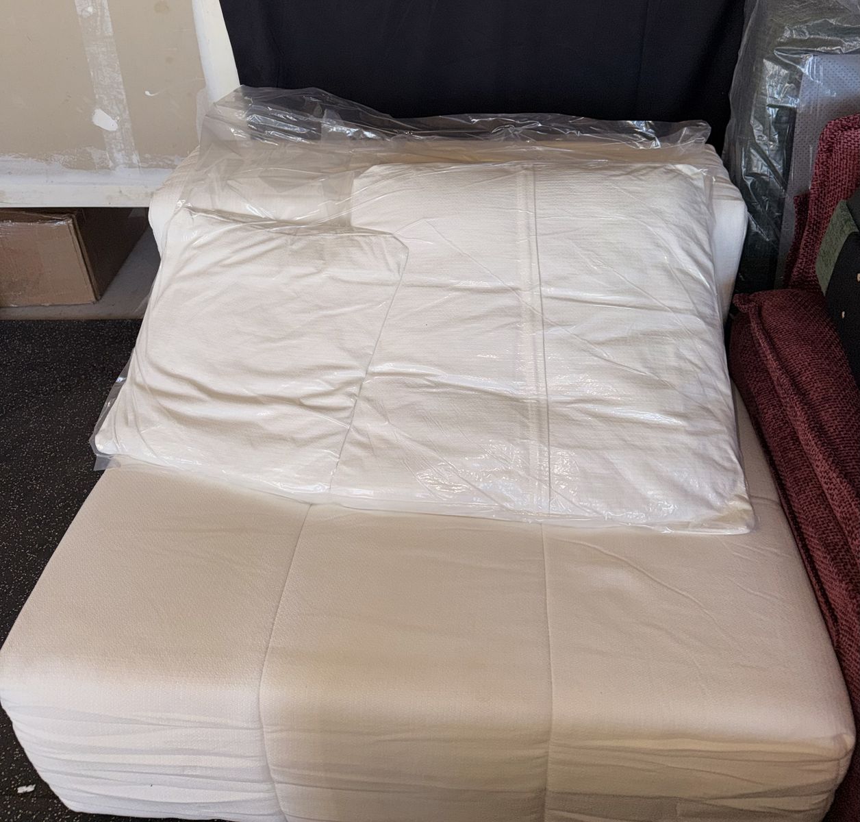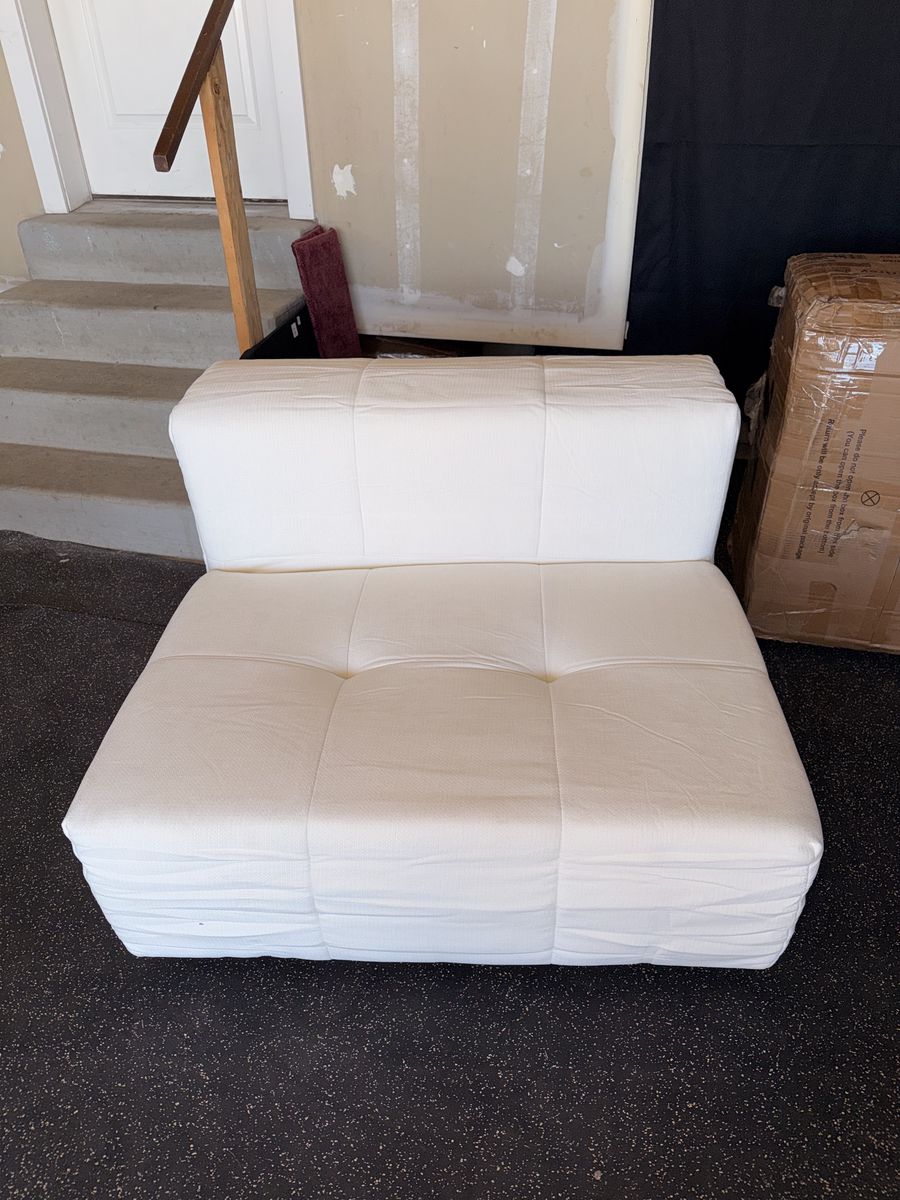ApplePayBrand new. Only removed from box to assemble for photos. Bright white color. Gorgeous and super modern. Very comfortable. Includes 2 brand new pillows in packaging.
