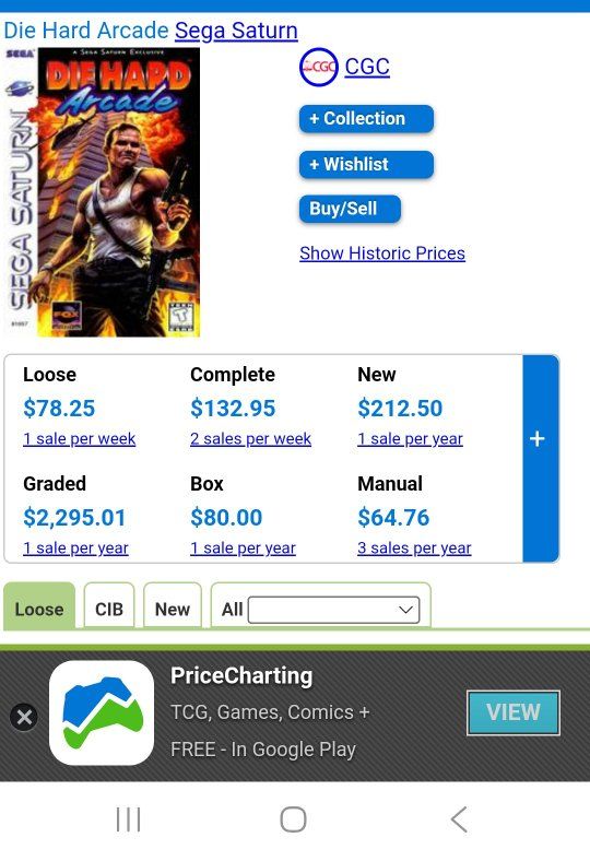 #3 Die Hard Arcade price charting shows shows $132.96, selling for $90.