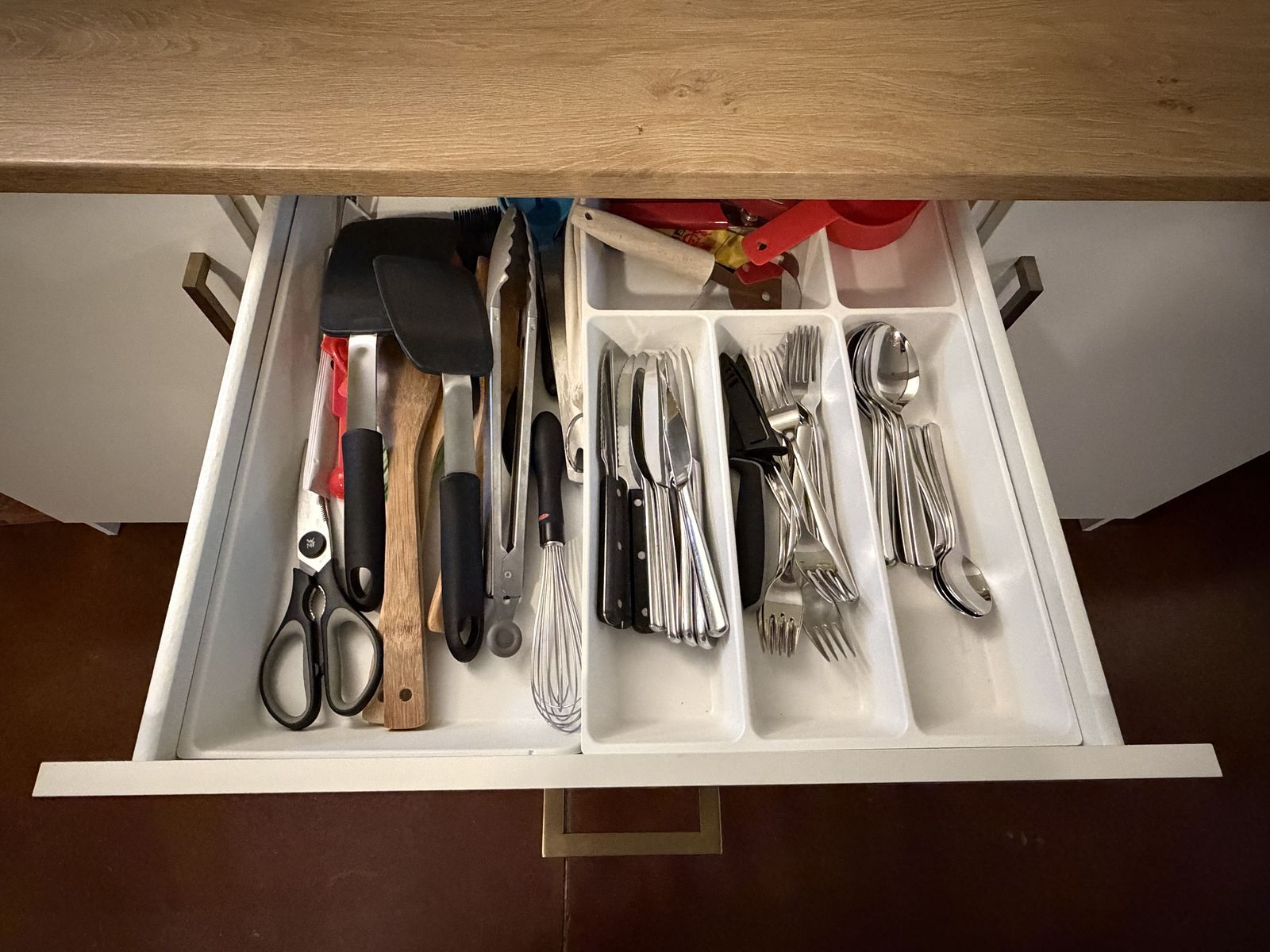 Upgraded handle hardware. STÖDJA & UPPDATERA utensil tray organizers included in drawer.