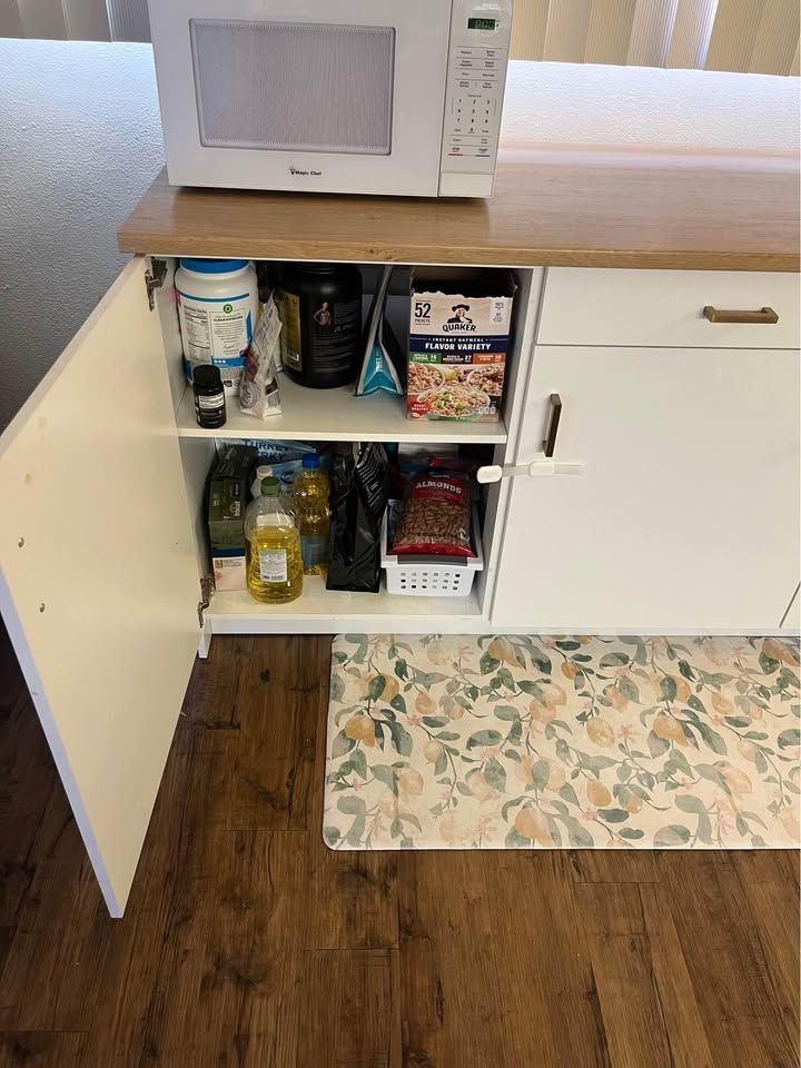 Lots of great storage and counter space making it easy to create a practical kitchen catered to your needs.The baby locks have been removed, as shown in first photo.