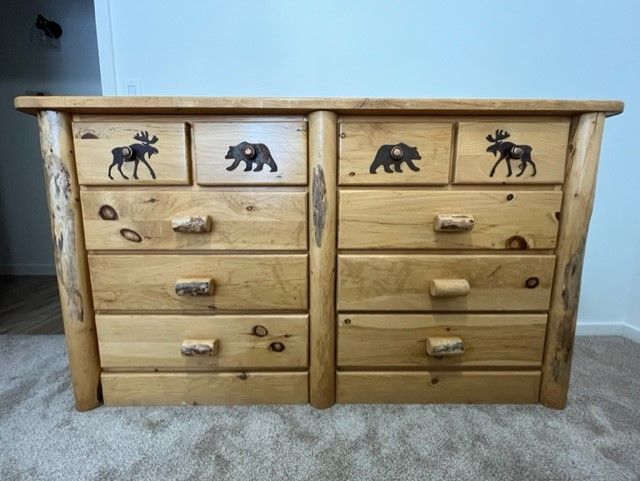 ZelleExcellent condition, heavy duty, solid wood dresser. 4 small drawers on the top row, with 3 large drawers under them on each side. All drawers in perfect condition.