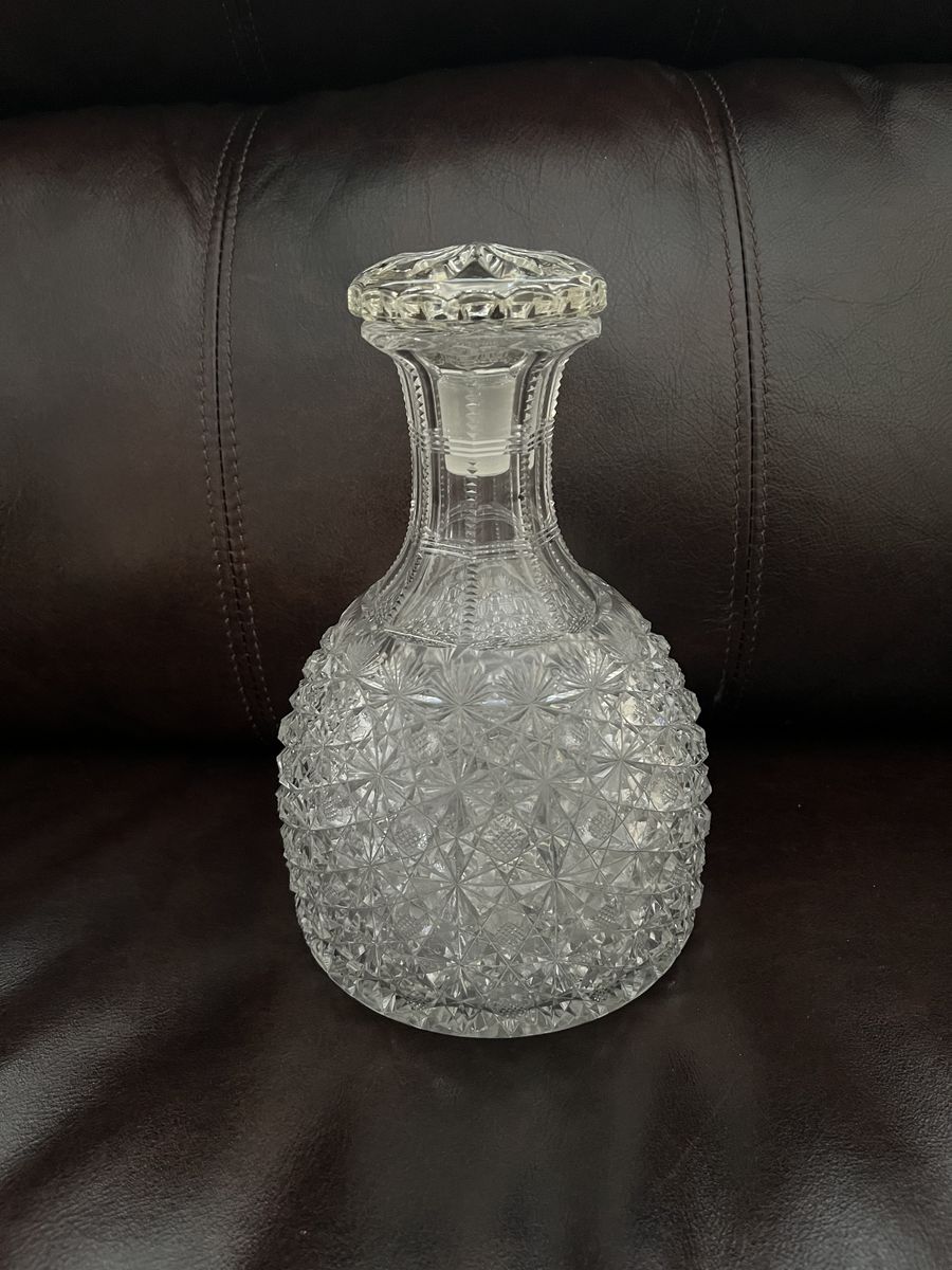 VenmoFor the person who is hard to buy for, or the person who has everything. This is such a find, to find a decanter with a stopper. This measures 8 inches tall x 5 1/2 inches wide. It is a heavy piece. I believe it was made between 1880-to the 1920's. It has a very detailed and intricate cut design in the crystal glass. There are Hobstars, fans, and diamond shapes. The neck has the zippered look. There is one tiny flea bite on the stopper and one small chip on the underside of the top rim on the decanter. With the stopper in, you can not see it. I will not ship this. Selling for a parent, so the price is firm.