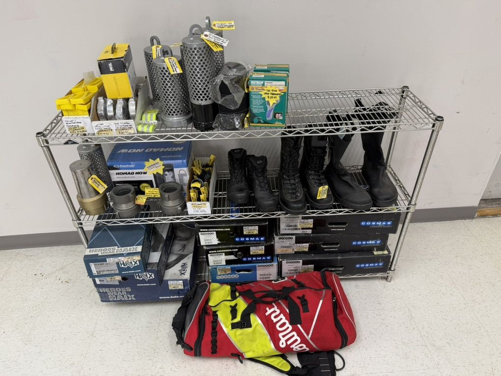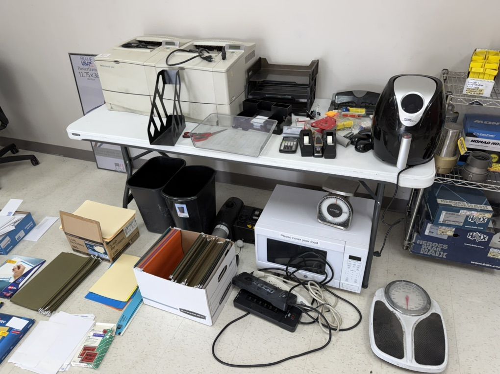 Items included: Office Desks Office Chairs Office Supplies Microwave Mini LG Fridge Firefighting Tools Firefighting Boots Landline Internet Phones More items not pictured or listed