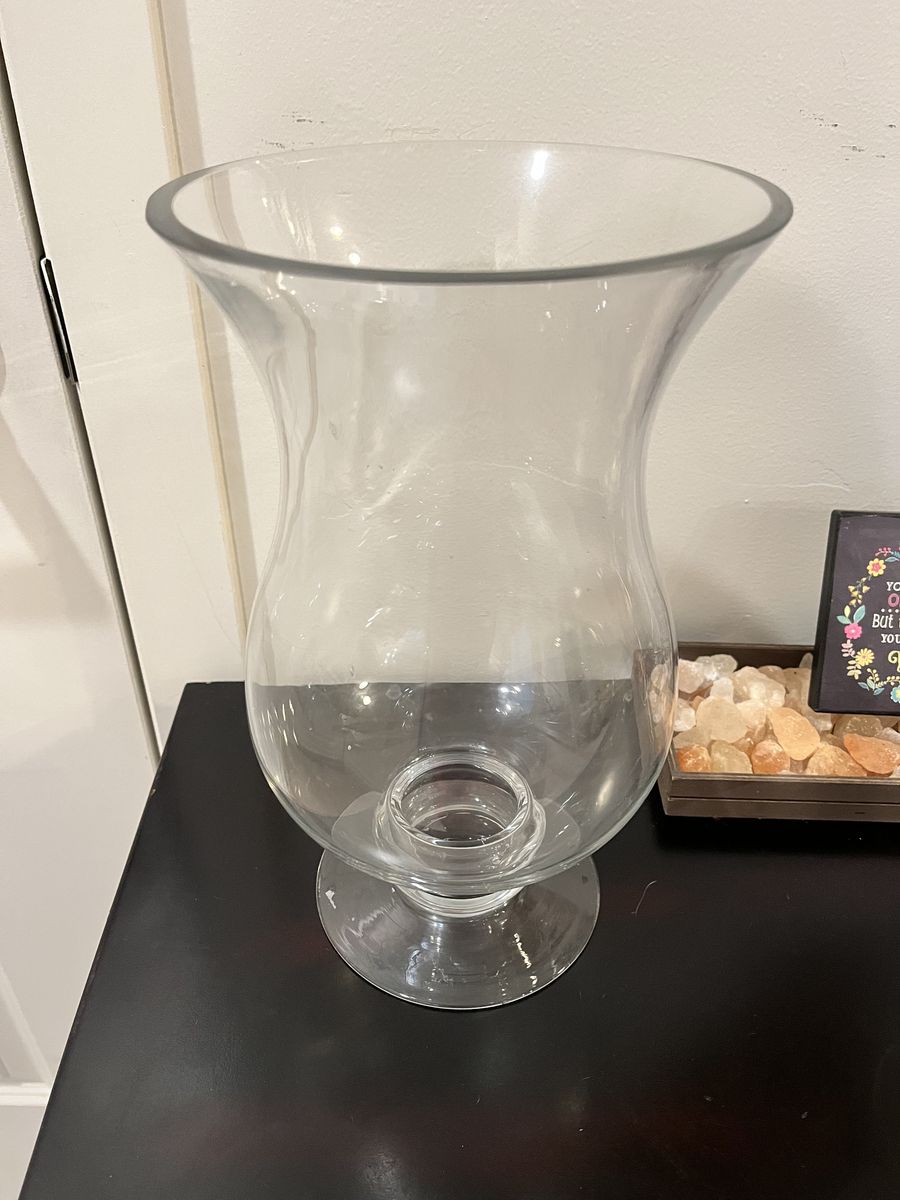 I’m selling this really pretty heavy glass vase — it has a wide 6.5” flared top and thick glass walls, so it feels super sturdy and high‑quality. It’s nice and clear with no cloudiness or scratches. Just a clean, simple piece that looks great with flowers or branches.