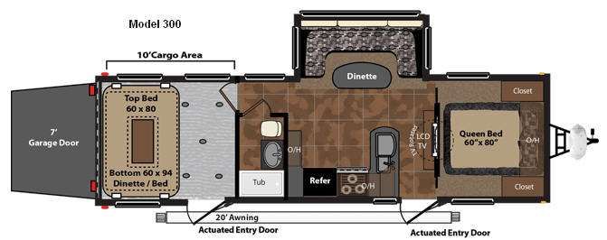 The garage space is incredibly flexible, offering dual queen bunks or the option to convert it into a dining or game area. The main living area is just as adaptable, with configurable seating and dining space to fit your needs.
