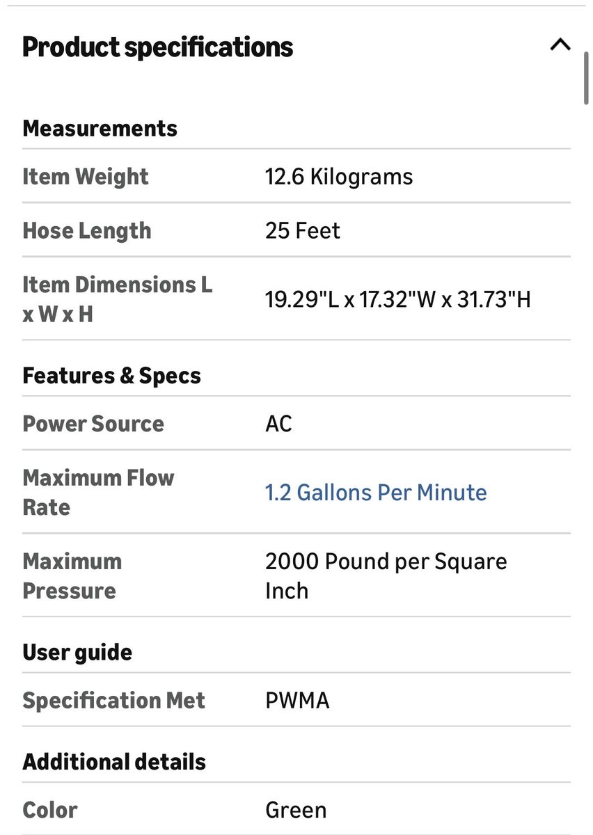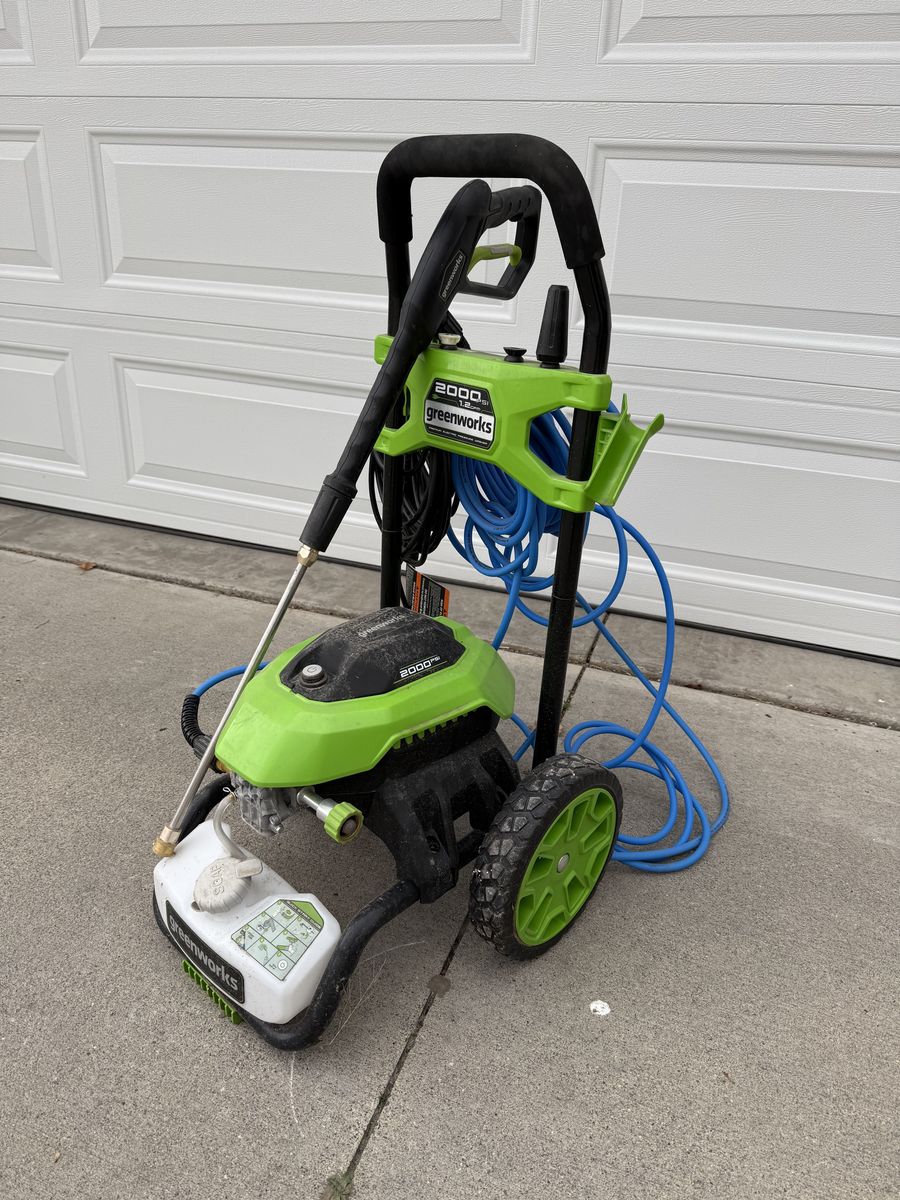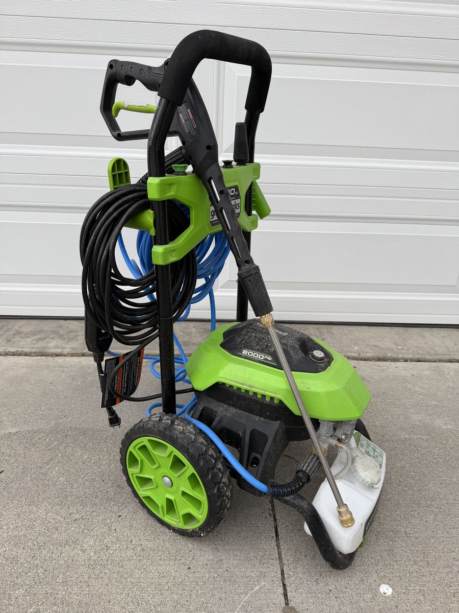 Greenworks 2000 PSI Electric pressure washer has only been used once. Bought from Costco so it has extra nozzles. See photo for more specs