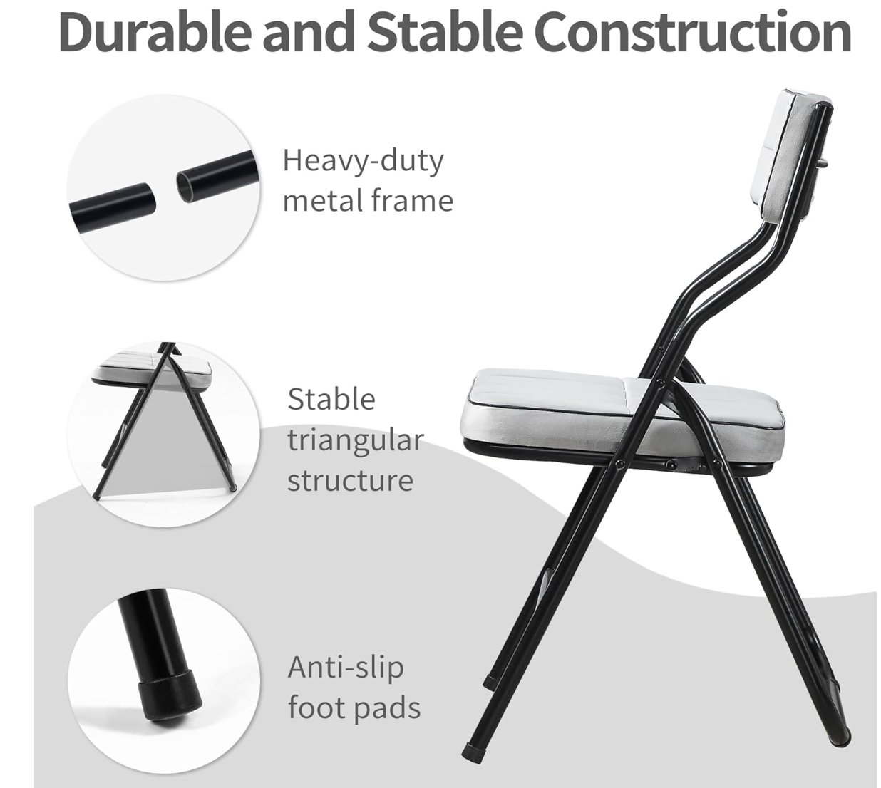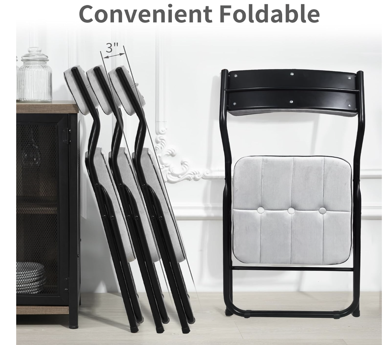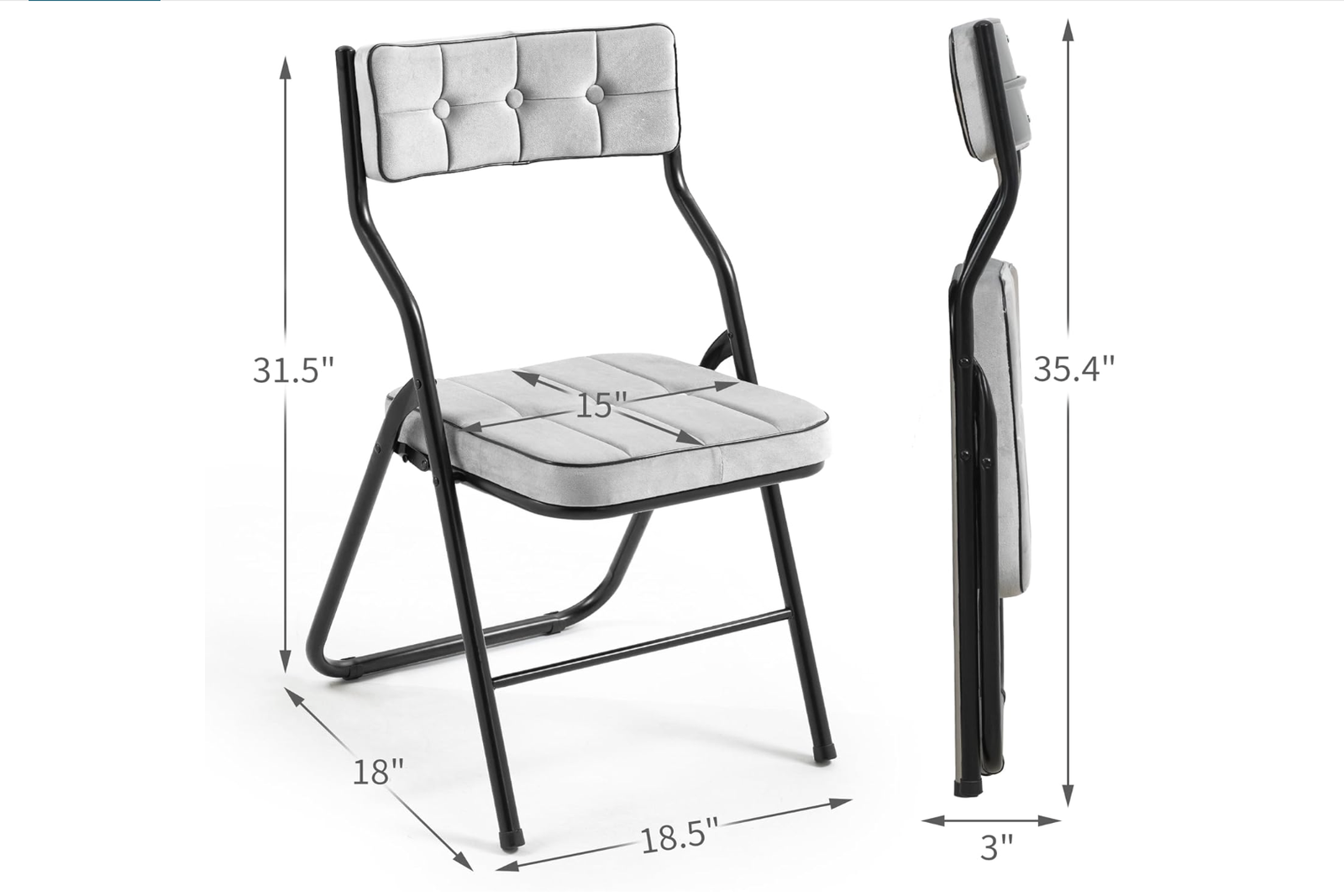 15"D x 15"W x 31.5"H Upholstered Seat and Backrest: The folding chairs with padded cushion and backrest which will relieve pressure on hips and back. For a more comfortable sitting experience. Skin-friendly and breathable velvet fabric More Comfortable Design: Enjoy optimal support with a 110° curved backrest and seat design, ensuring a comfortable experience for reading, resting, or dining. The thoughtful design caters to your back and leg comfort Convenient Foldable Design: Effortlessly transport and store these folding dining chairs with their user-friendly foldable feature. Easy to carry and compact when folded, these chairs are perfect for on-the-go seating needs without compromising style Robust Construction: Padded folding chair built with a sturdy steel frame, these foldable chairs boast a weight capacity of up to 250 lbs. The two-cross support structure enhances stability, making them reliable and durable for various occasions