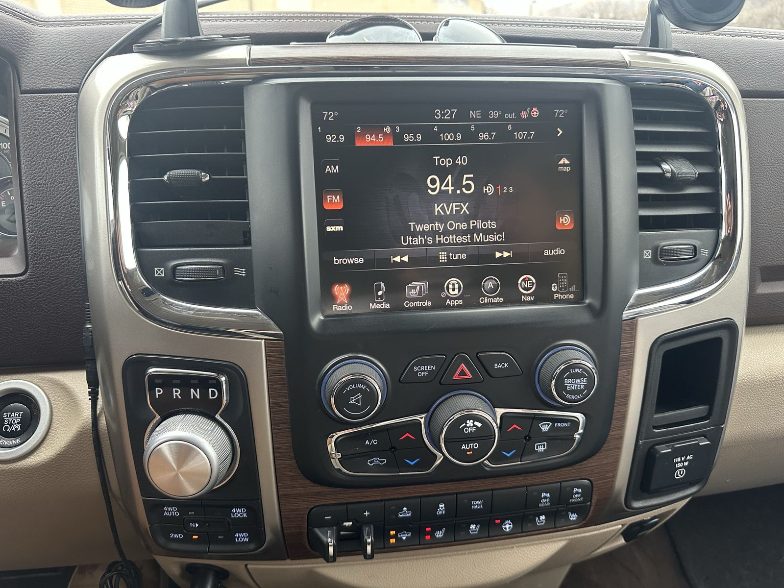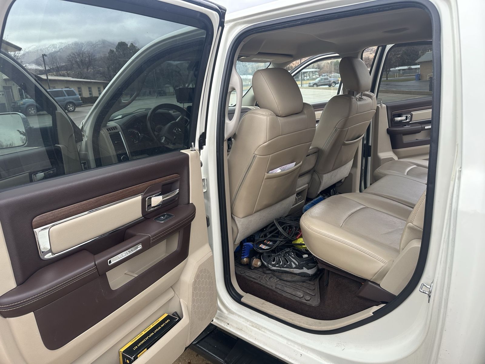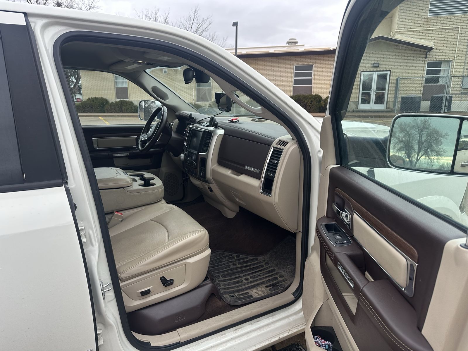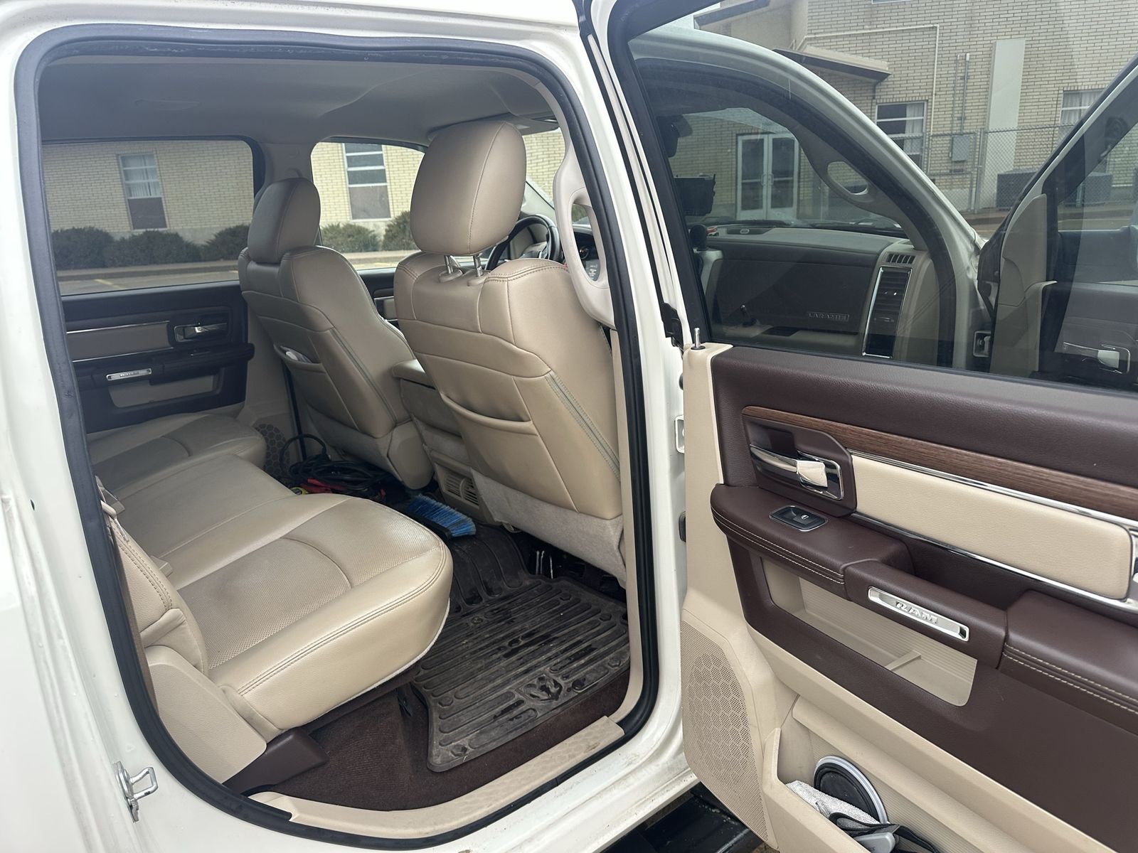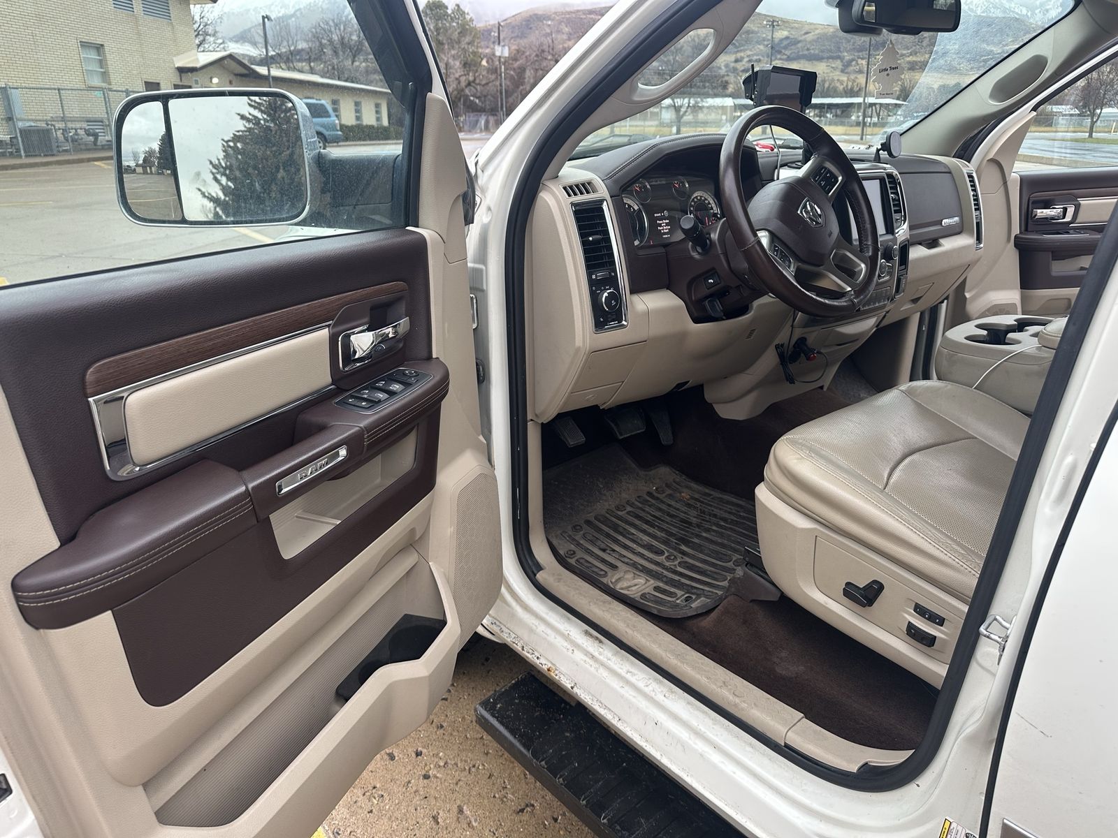 Laramie features include heated and cooled front seats, heated steering wheel, backup camera, front and rear park sensors, Alpine stereo with factory sub, power seats/windows, power sliding rear window, rain-sensing wipers, and auto headlights.