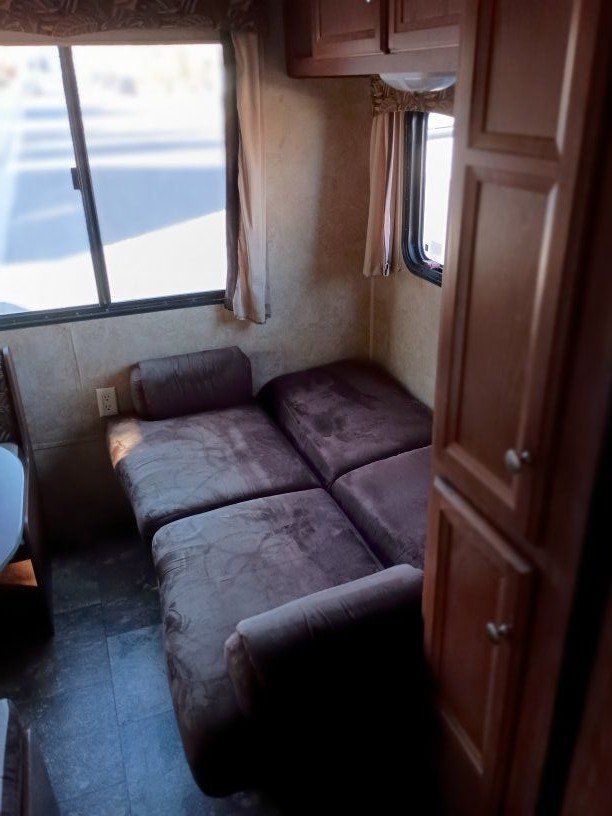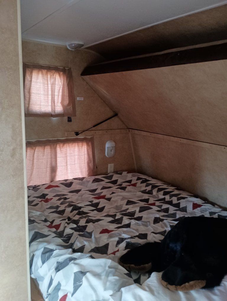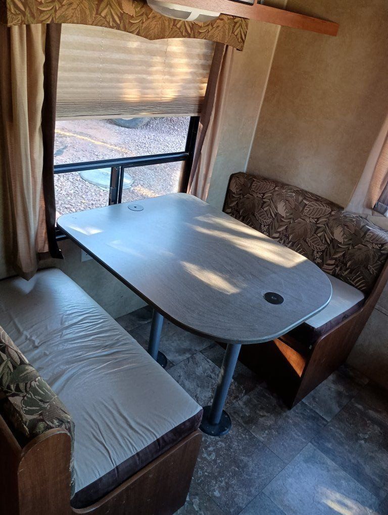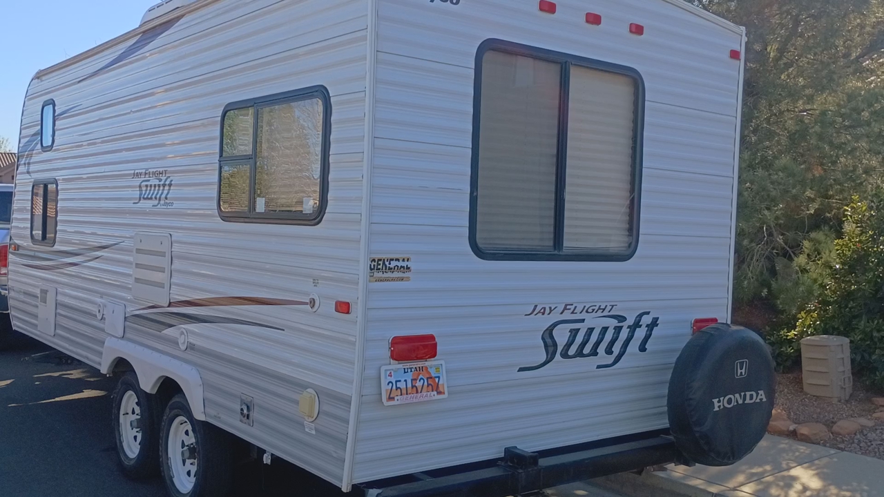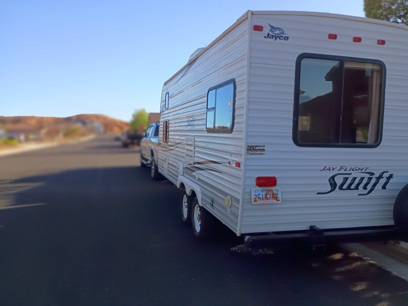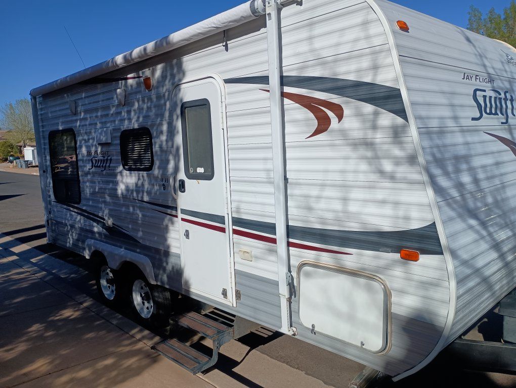 2012 Jay Flight Swift 198 RD This trailer is ideal for couples and small families. It's most appreciated and unique feature is the three large rear windows allowing for an open feeling and a beautiful view of your camp environment. Sleeping features are a comfortable front queen bed with overhead retractable single bed. The couch turns into a bed as does the dining table to provide sleeping for a total of 5 persons. The dry weight of around 3,720–3,925 lbs provides easily towing by most small pickups and SUVs. Compact Size: Being around 20–21 feet long, it is easy to maneuver, park at home, and fits into smaller, more rustic campsites that larger trailers cannot. Jayco trailers are known for being well-built. It has 48-gallon fresh water tank, a 32.5-gallon gray water tank, and a 32.5-gallon black water tank. The water heater holds an additional 6 gallons. It features a tub with the shower. New upgraded stainless steel sink was just added along with a new electric tongue lift and new awning. The soft start air conditioner will operate on only a 1600-2000 watt generator. The roof was just sealed. Lighting has been upgraded to LED throughout. Get out there and enjoy the great outdoors with this convenient and affordable camp trailer. We have loved it.