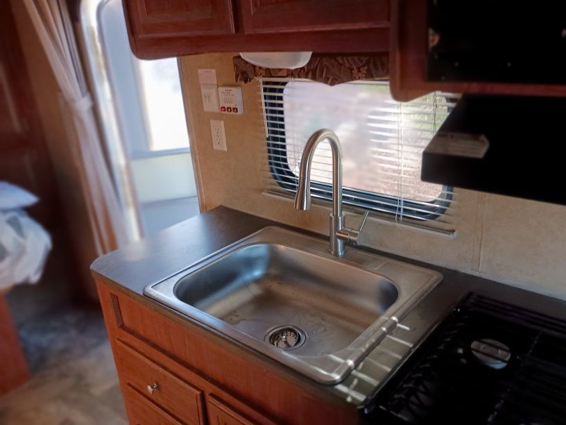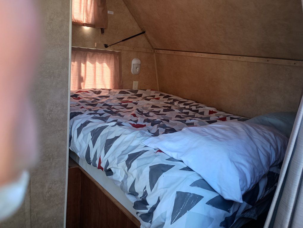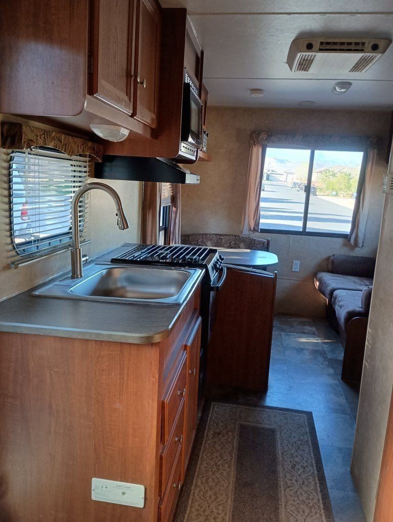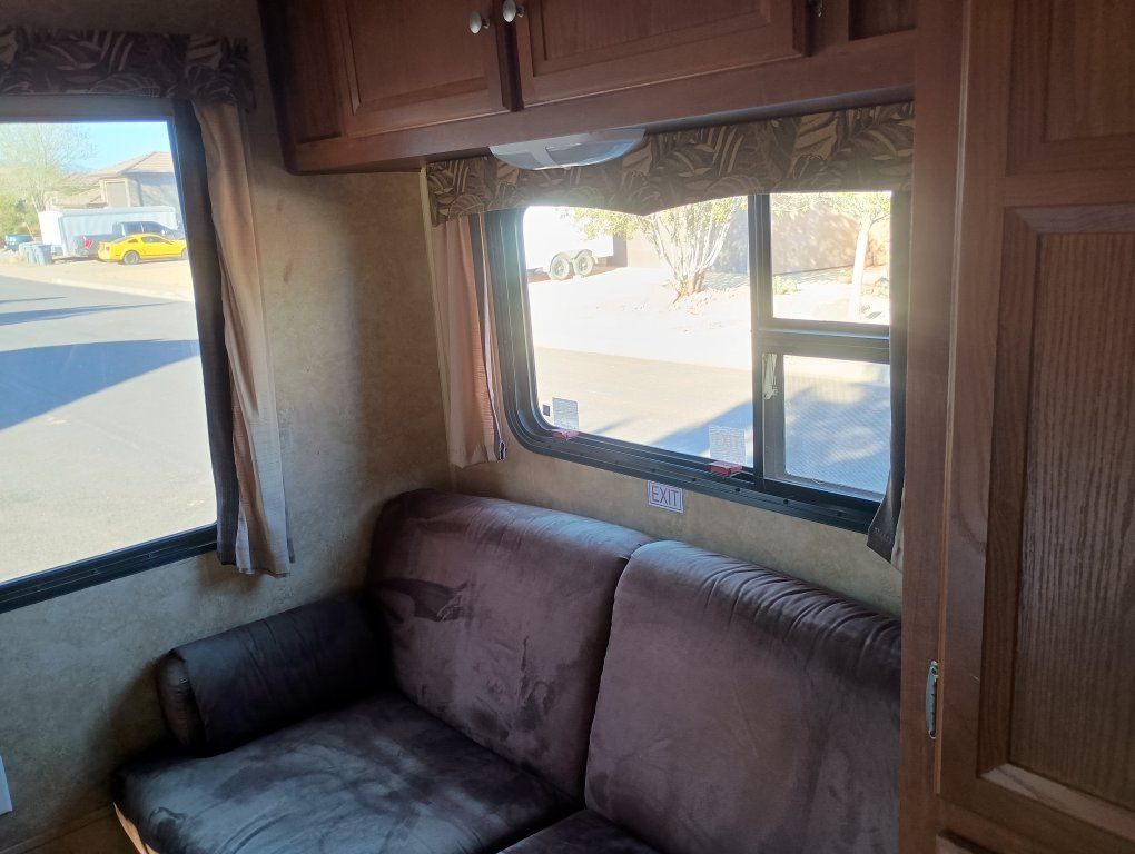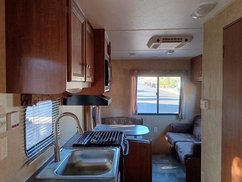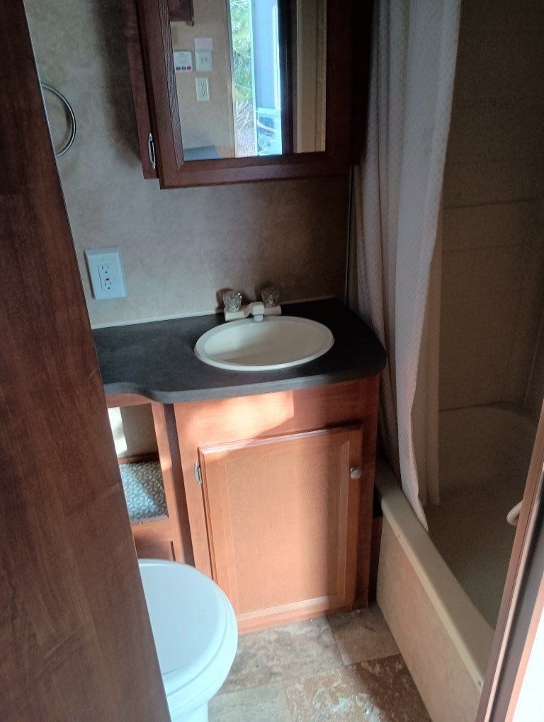2012 Jay Flight Swift 198 RD This trailer is ideal for couples and small families. It's most appreciated and unique feature is the three large rear windows allowing for an open feeling and a beautiful view of your camp environment. Sleeping features are a comfortable front queen bed with overhead retractable single bed. The couch turns into a bed as does the dining table to provide sleeping for a total of 5 persons. The dry weight of around 3,720–3,925 lbs provides easily towing by most small pickups and SUVs. Compact Size: Being around 20–21 feet long, it is easy to maneuver, park at home, and fits into smaller, more rustic campsites that larger trailers cannot. Jayco trailers are known for being well-built. It has 48-gallon fresh water tank, a 32.5-gallon gray water tank, and a 32.5-gallon black water tank. The water heater holds an additional 6 gallons. It features a tub with the shower. New upgraded stainless steel sink was just added along with a new electric tongue lift and new awning. The soft start air conditioner will operate on only a 1600-2000 watt generator. The roof was just sealed. Lighting has been upgraded to LED throughout. Get out there and enjoy the great outdoors with this convenient and affordable camp trailer. We have loved it.