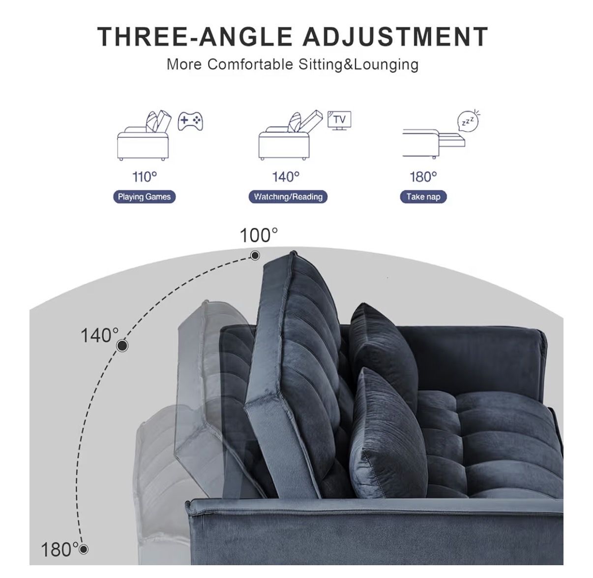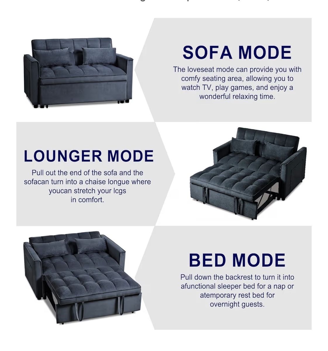 This item is a modern furniture piece designed for multi-functional use in living rooms or apartments. It typically features: 3-in-1 Design: Functions as a loveseat, a pull-out sleeper bed, and a reclining sofa. Material: Upholstered in soft velvet fabric, often available in colors like black or gray. Adjustable Comfort: Includes an adjustable backrest and often comes with matching pillows. Practical Features: Some versions include side storage pockets for items like remotes or magazines.