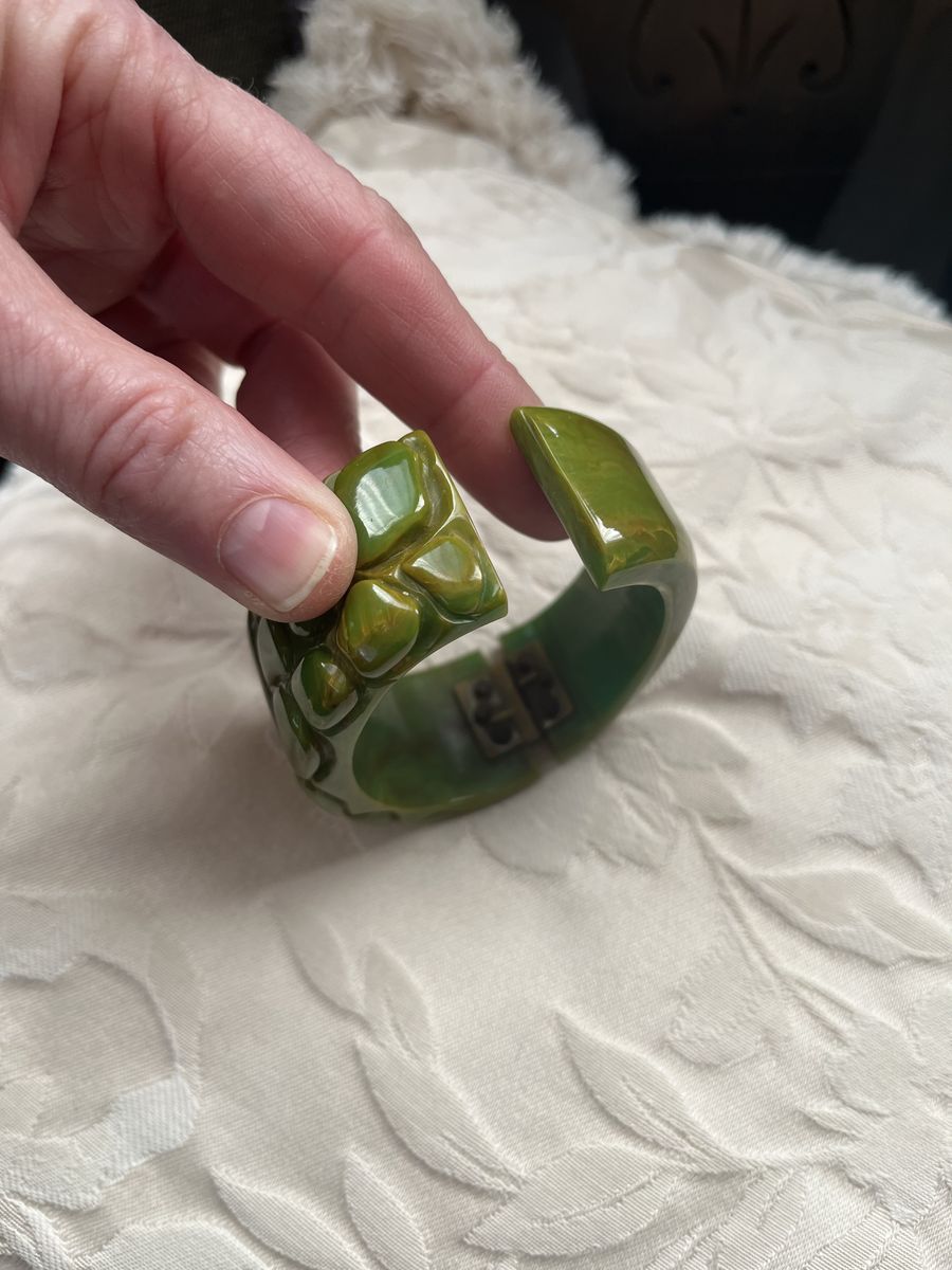 VenmoThis bracelet is stunning! The carving brings out other colors in the bakelite like golds and browns. Own a piece of history no one else will have. Bracelet measures 1 1/4 inches across. It is quite a nice quality statement piece. Selling for a parent. Price is firm.