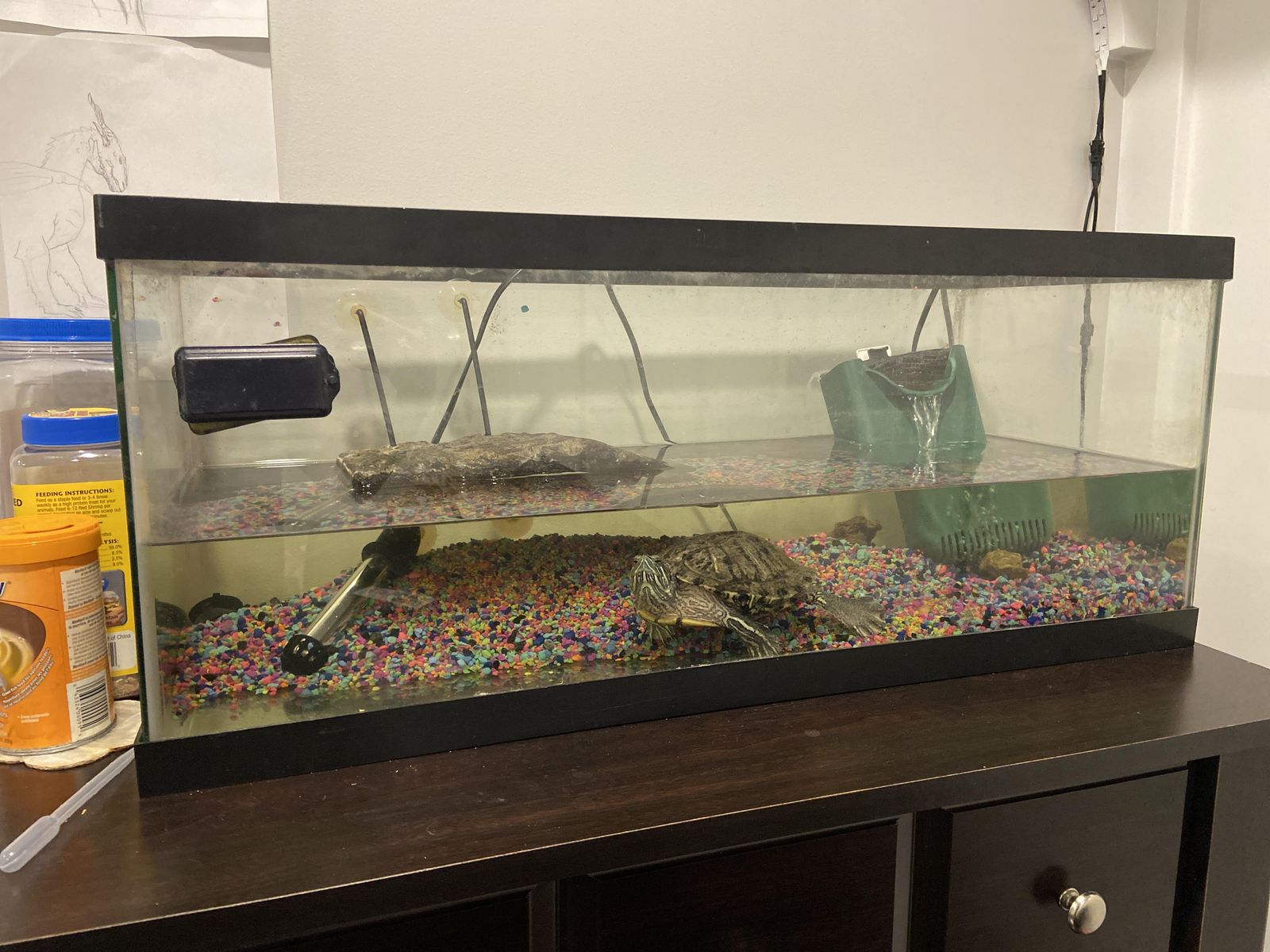The dimensions of the tank are 30" long, 12" wide, and 12" tall. The turtle is about 6" long and 10 million ft² of cuteness!