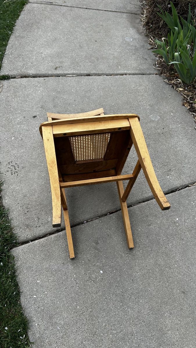 This is a vintage wooden side chair with a cane (woven rattan) seat and a single solid wood slat back. Measures about 16” wide across the widest part of seat and about 37” tall. Cash at pick up in Highland Alpine area.