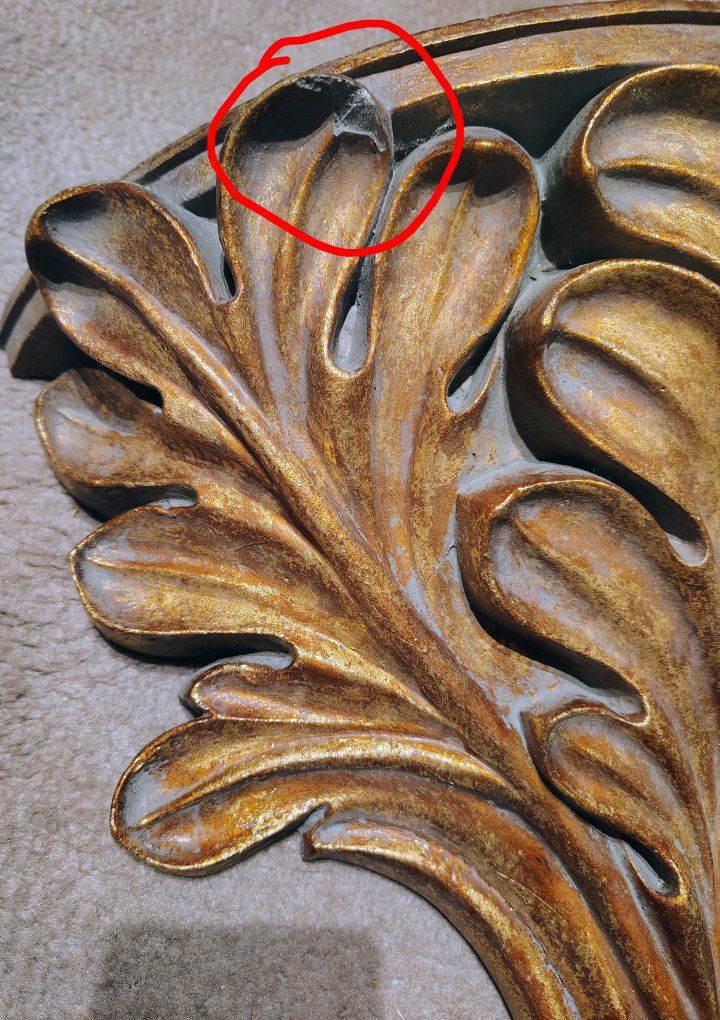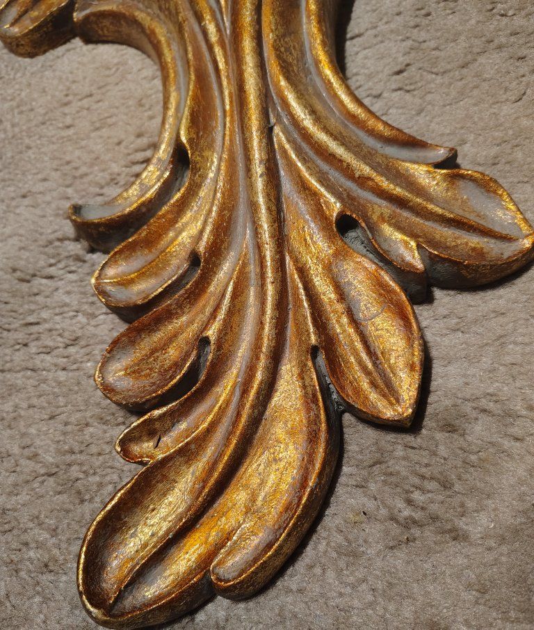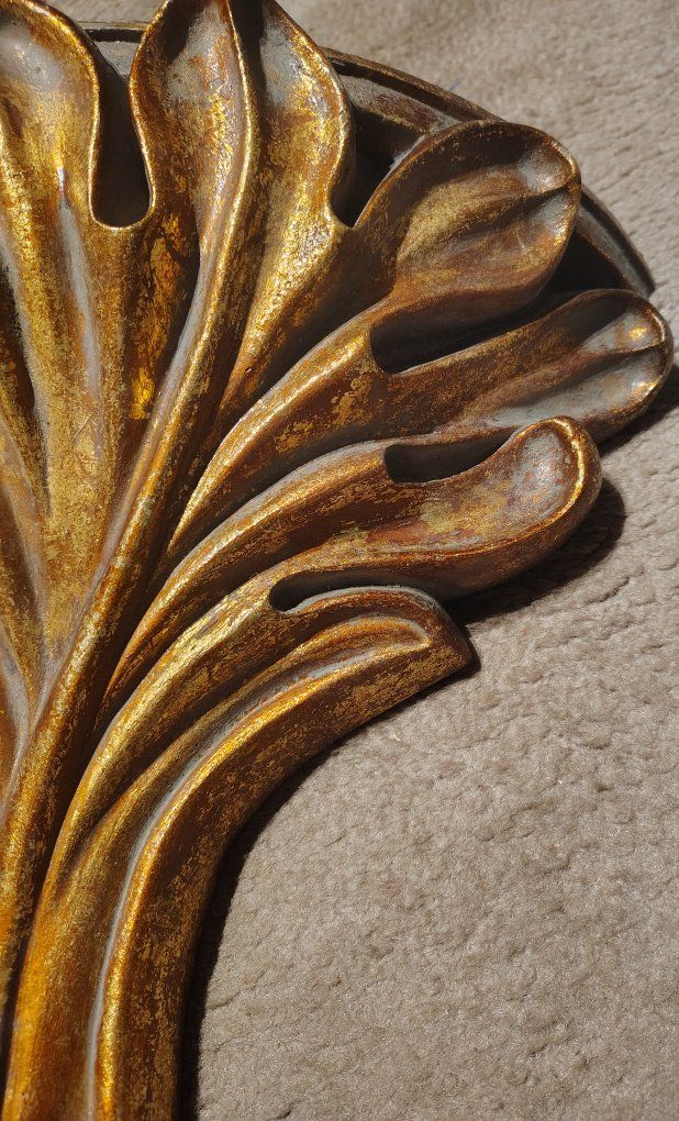 A vintage gold gilt wall shelf/sconce associated with Hollywood Regency or Italian Rococo styles from the mid-to-late 20th century. Design: Features a sculptural, oversized leaf motif, often identified as a fig leaf, palm leaf, or acanthus leaf. Style: It follows the Serge Roche style, known for dramatic, nature-inspired plaster or wood carvings with a metallic finish. Material & Finish: Resin with a dark gold or antique gilt finish to give them an aged, opulent look. Dimensions: 17ʺW × 7.5ʺD × 20.25ʺH There is a chip on the leaf at the upper left hand side of the sconce (see photo with red circle.)