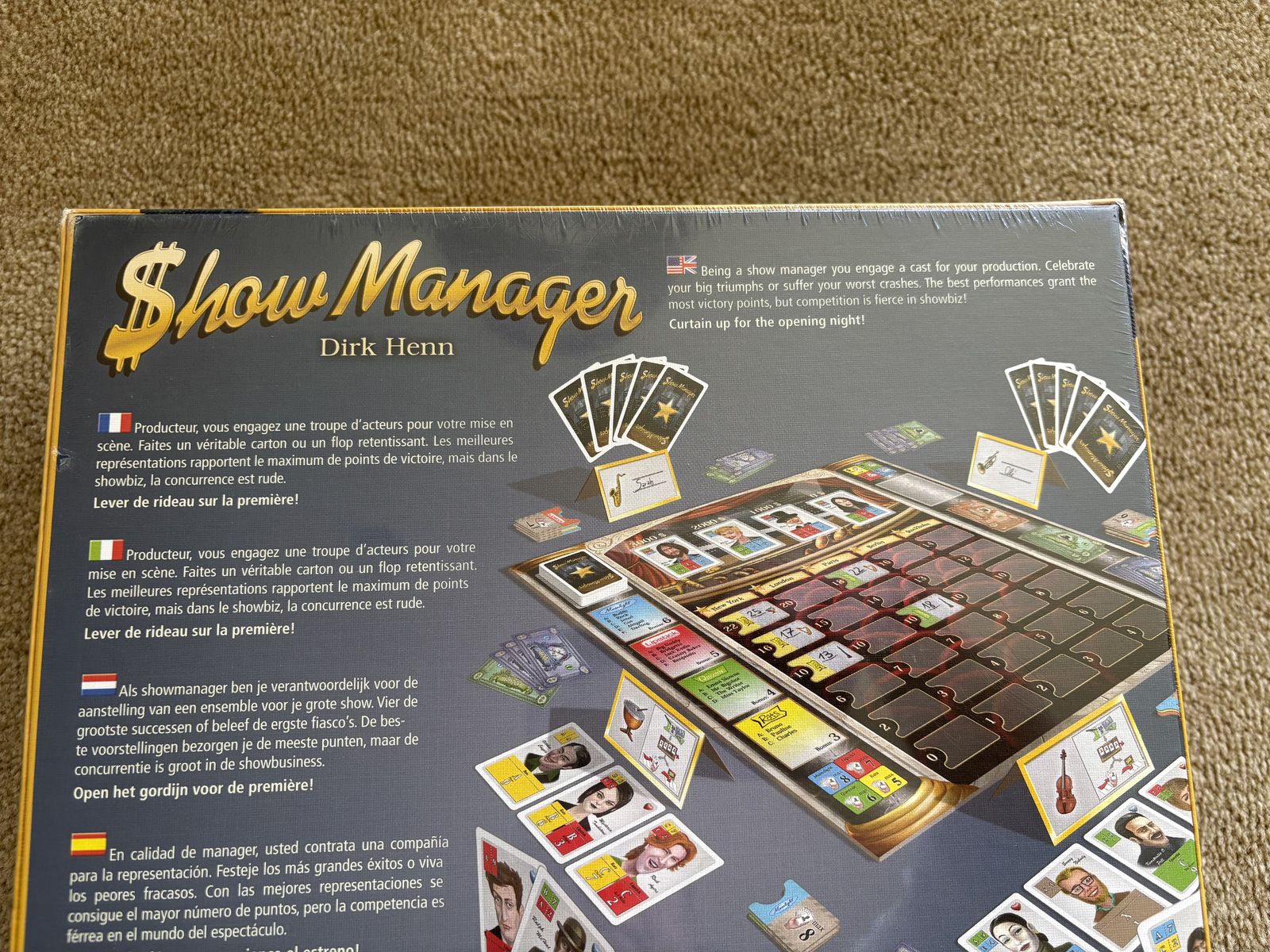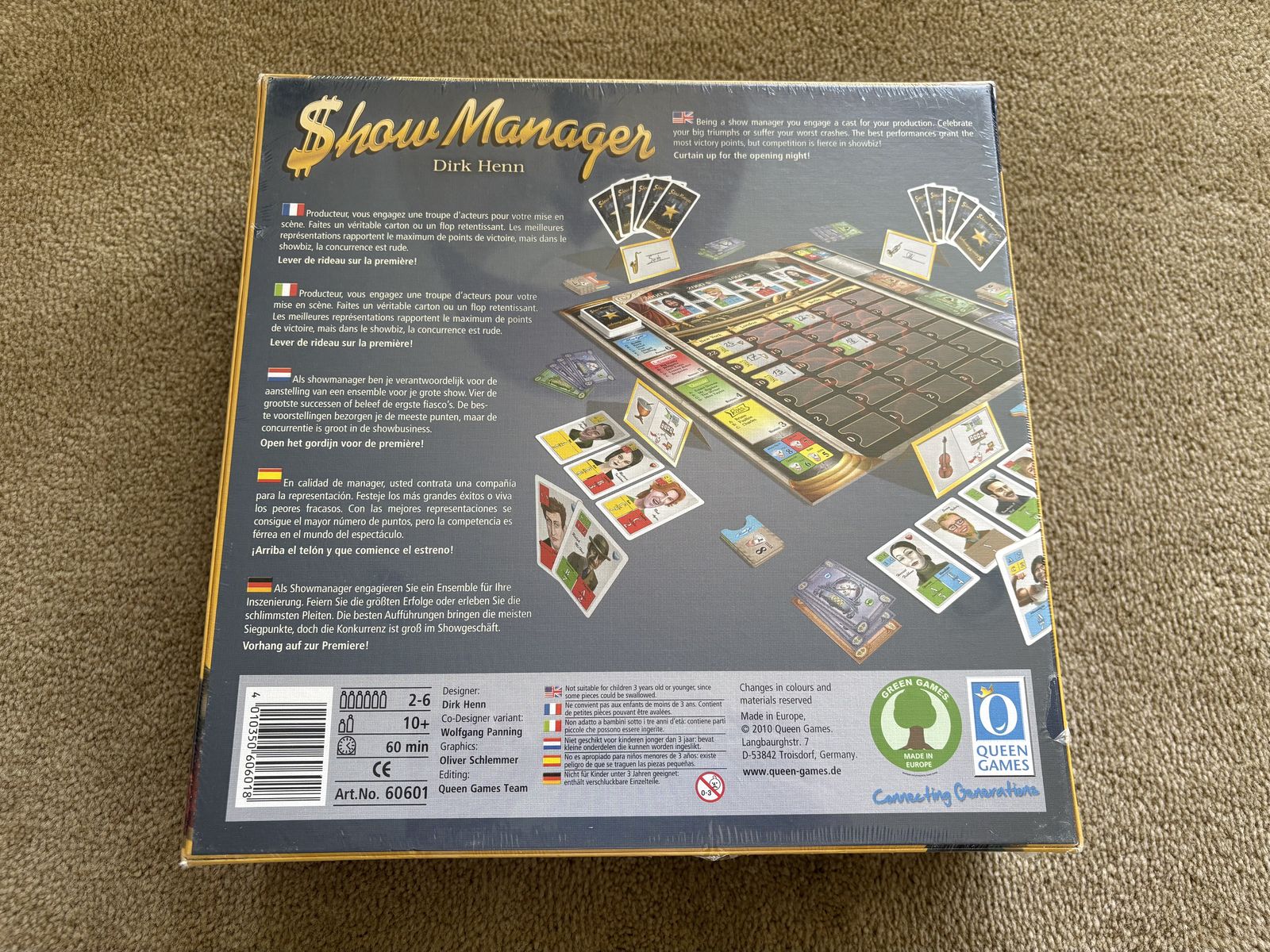 NEW (sealed in plastic) Show Manager Board Game. Put together the best cast and production for opening night! By Dirk Henn, Queen Games, 2010. 2-6 players, ages 10+. Made in Germany. Hard to find game! New, unopened condition. Plastic torn in a couple of spots, corner slightly worn (see photos). Text only. Cash or Venmo. Discount on multiple items.