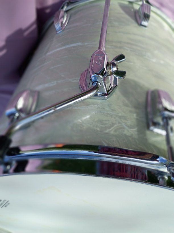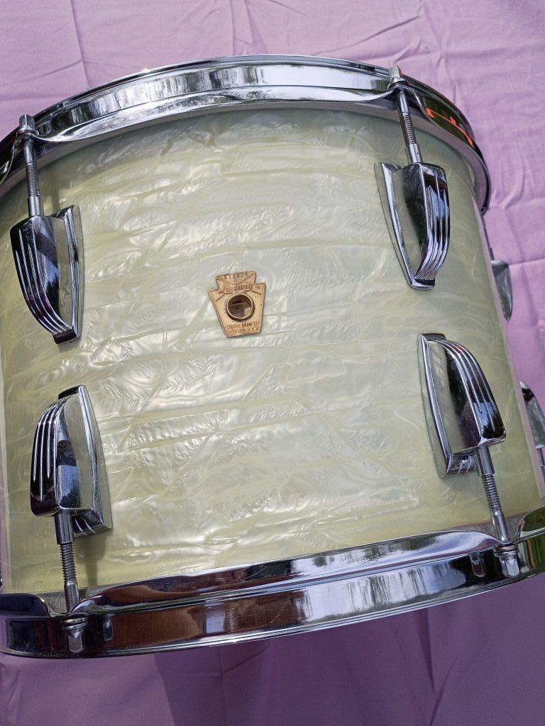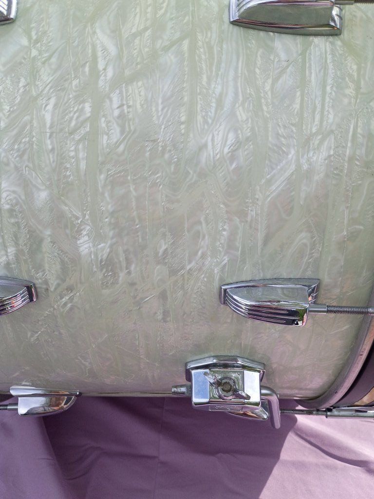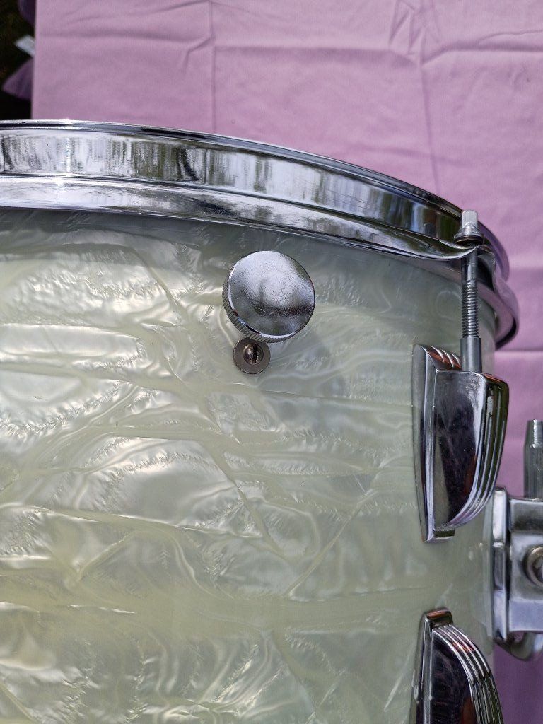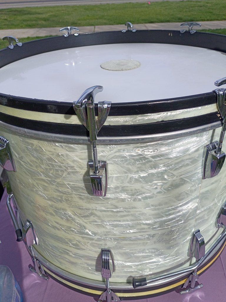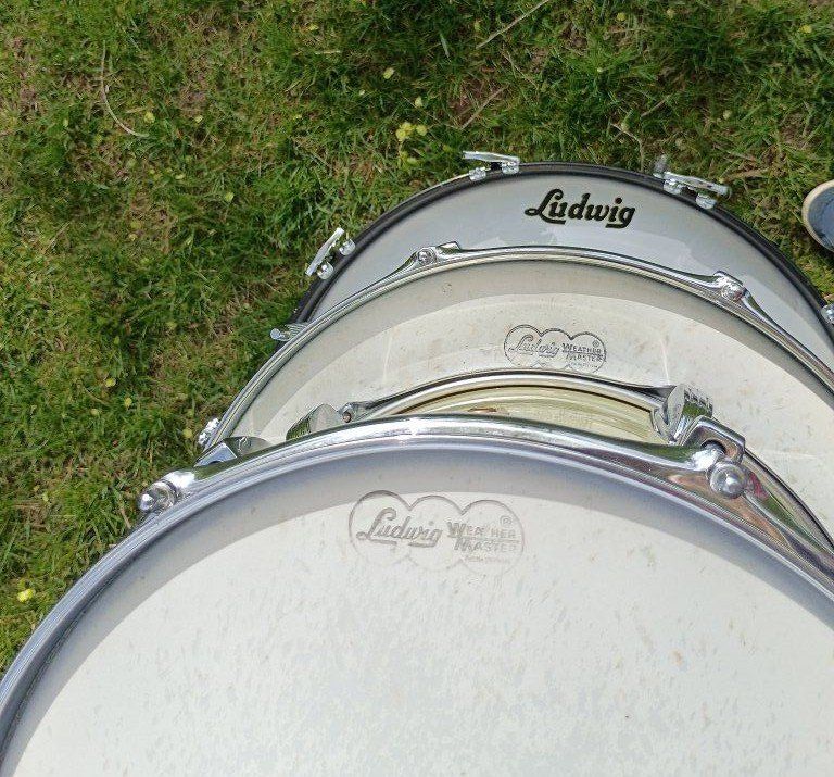 Venmo1968 Ludwig Maple Classic Drum Set White Marine Pearl, comes with iconic Ludwig Supraphonic 400 Snare. The set is in excellent condition, no scratches, scuffs, no modifications... complete, intact, same as when they left the Ludwig factory Tuesday and Wednesday March 26 and 27, 1968. They still have original heads. Maple shells have painted white interiors; date stamps are still readable. Keystone badges, with close serial numbers. Bass drums hoops are in excellent shape. There is some yellowing as is the case with all 59 year old shells, this can be can be reversed with the "Retro Brighenting" process...Google it.