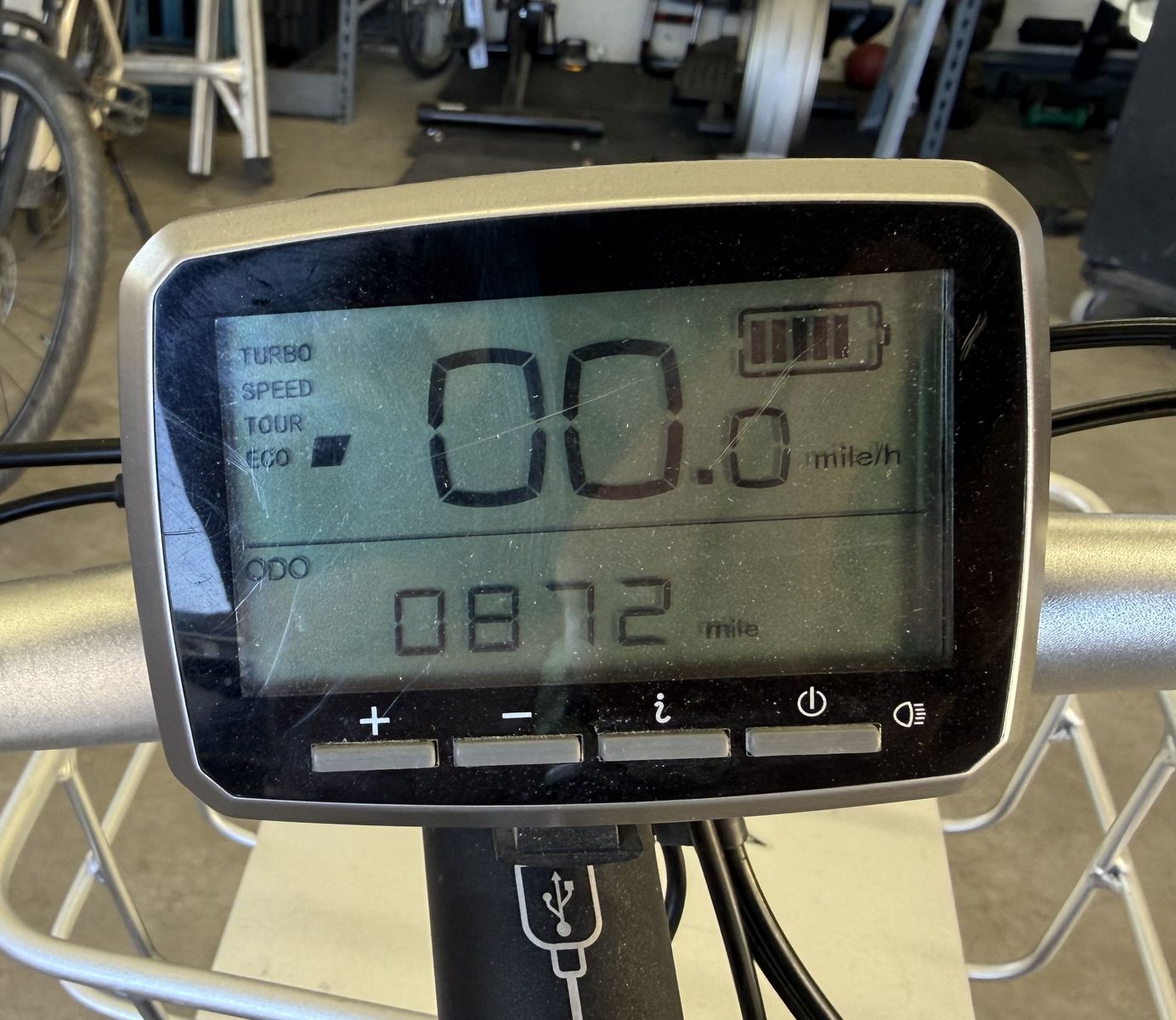 ~872 miles, runs perfectly with no issues. Battery holds a strong charge and gets great range.