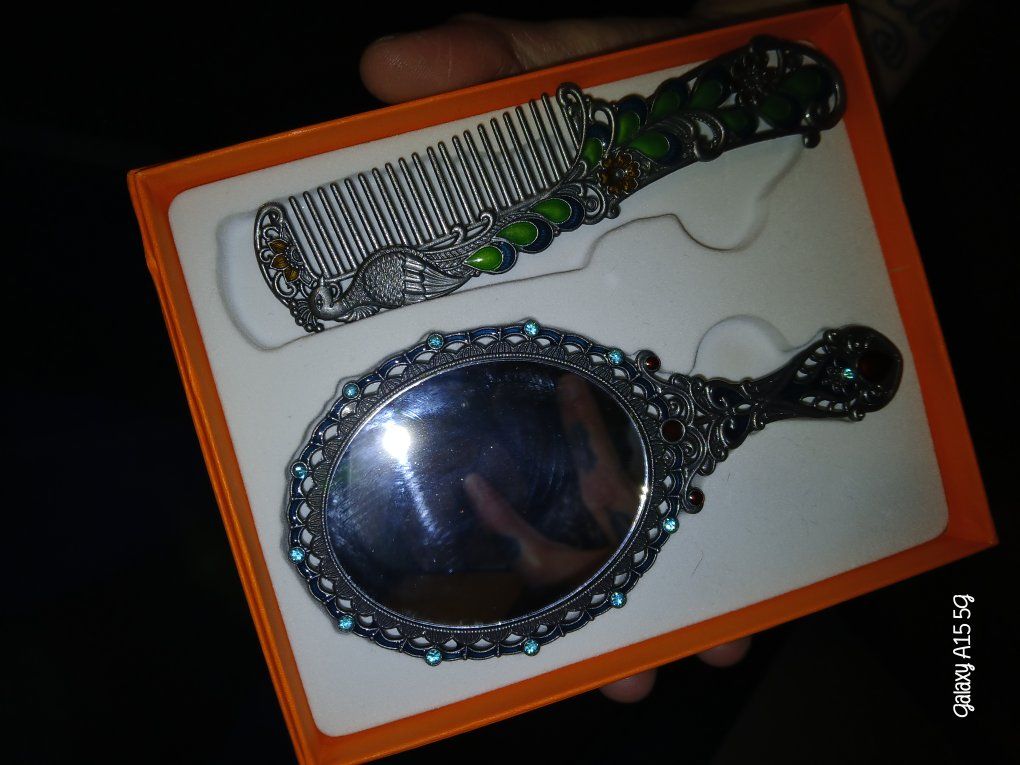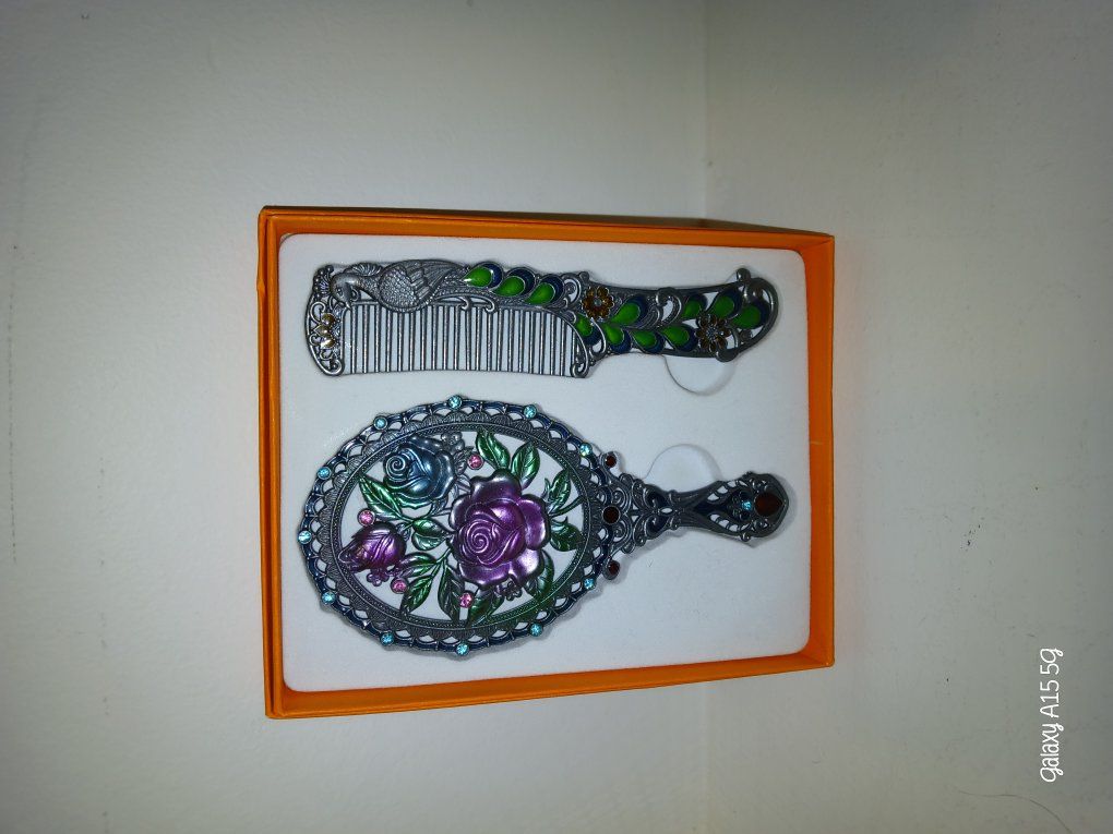 ZelleThis stunning 2-piece vanity set features a beautifully detailed handheld mirror and matching hair comb. Crafted with a vintage-inspired aesthetic, the set is adorned with colorful enamel-style accents and intricate metalwork.