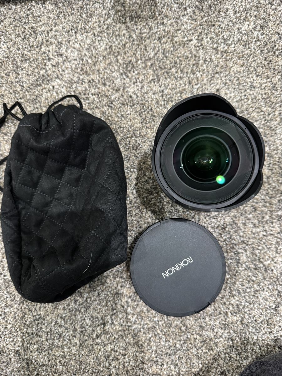 VenmoClean Rokinon camera lens. Comes with a lens hood and a soft carrying pouch. Has aperture and focus rings.