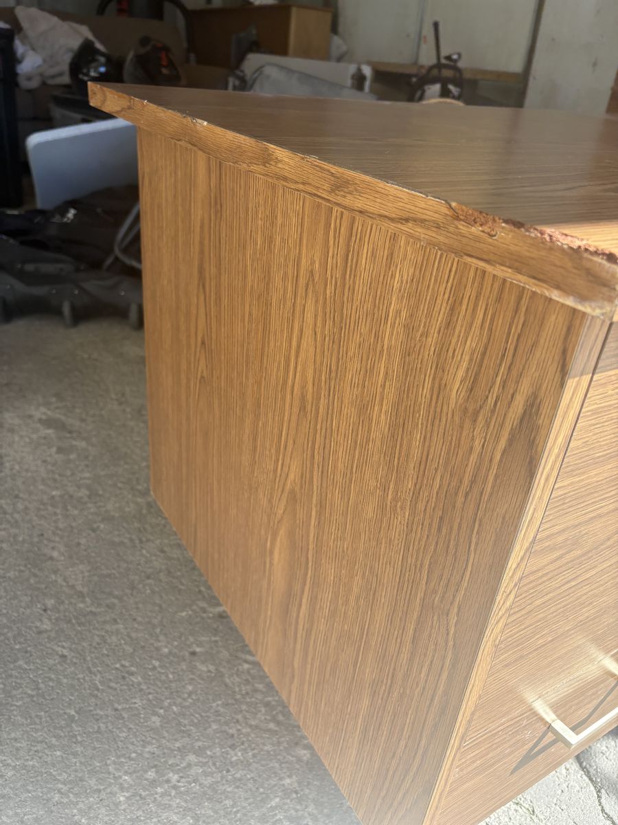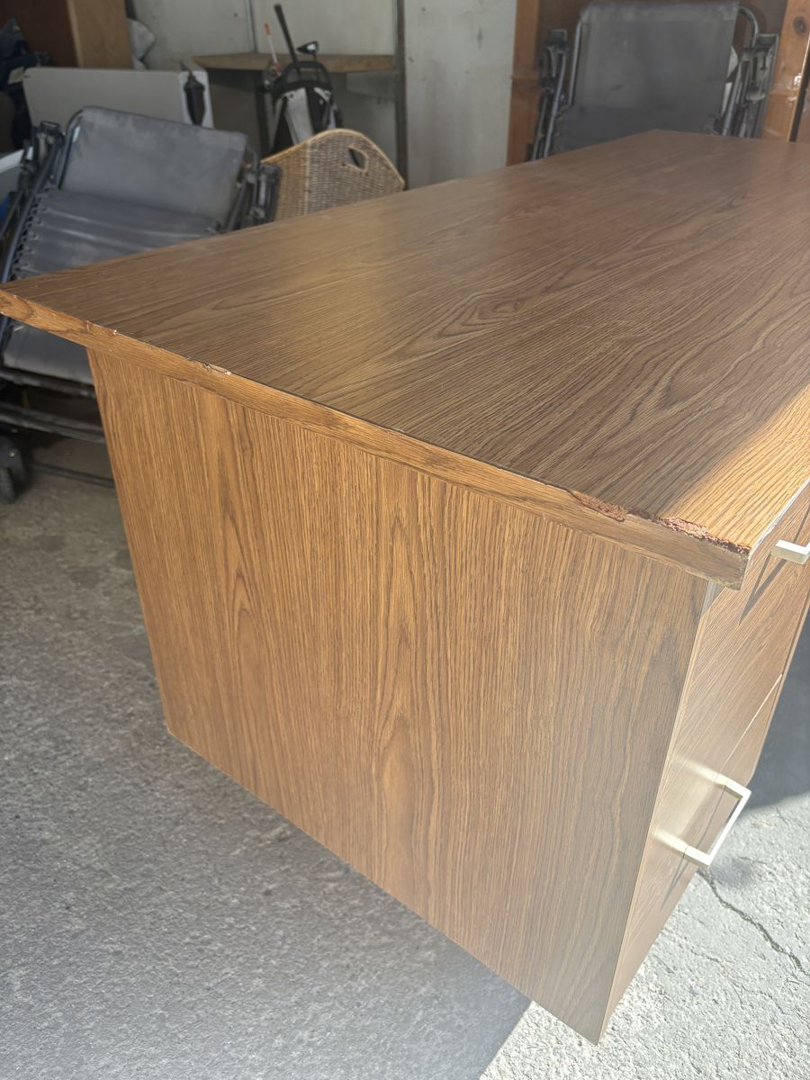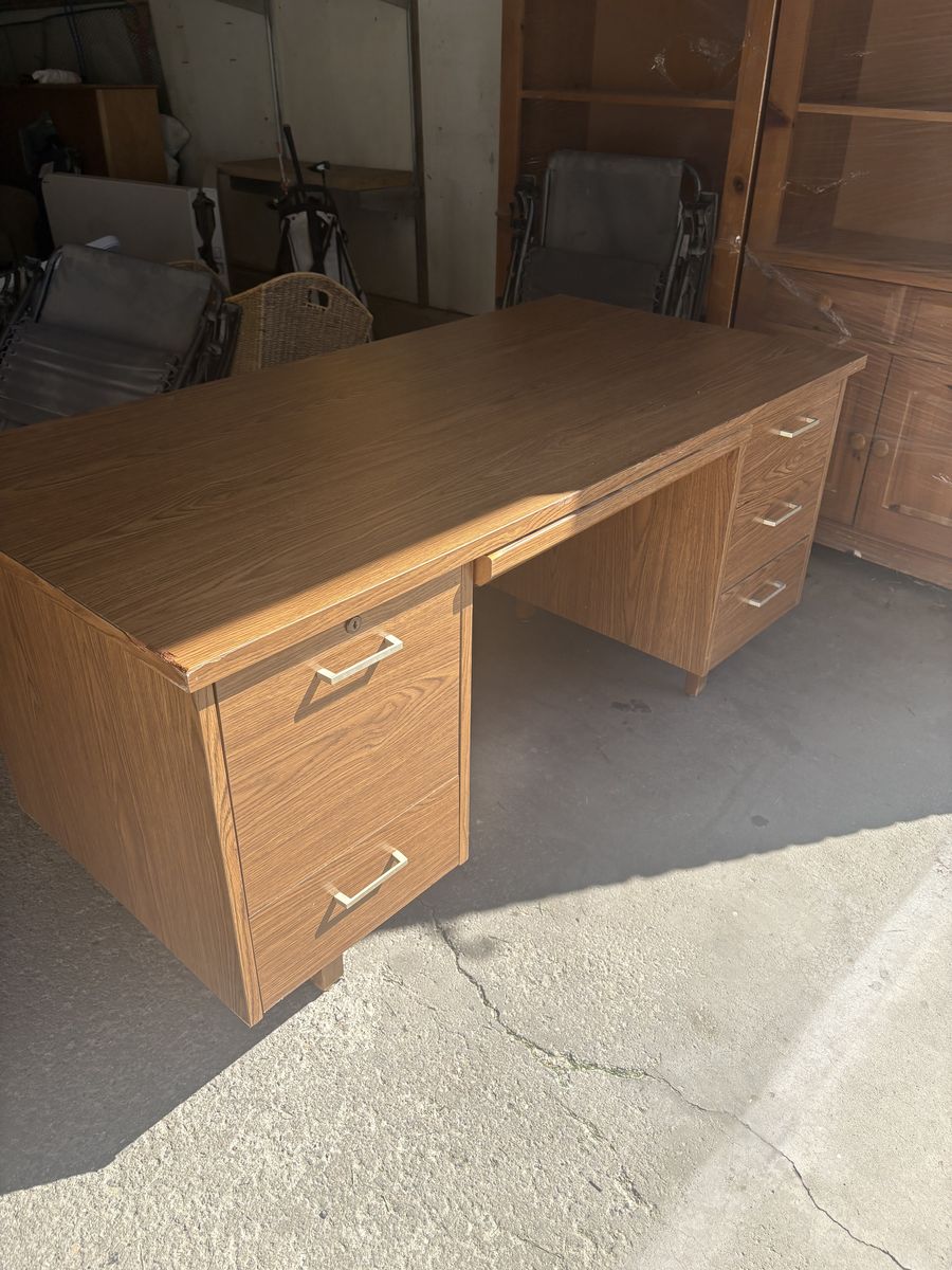 Wood desk, very sturdy and solid wood. Has some scratches and normal wear and tear
