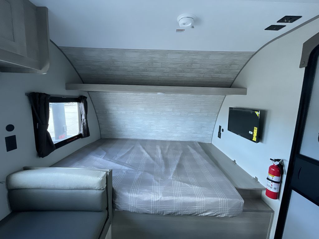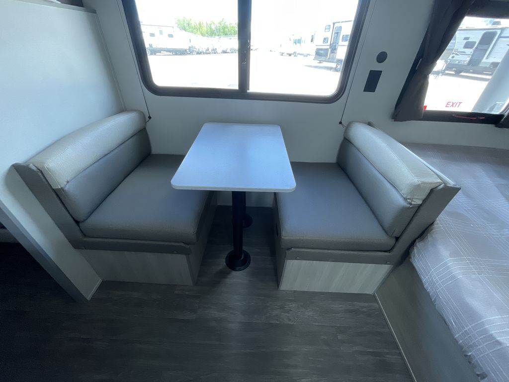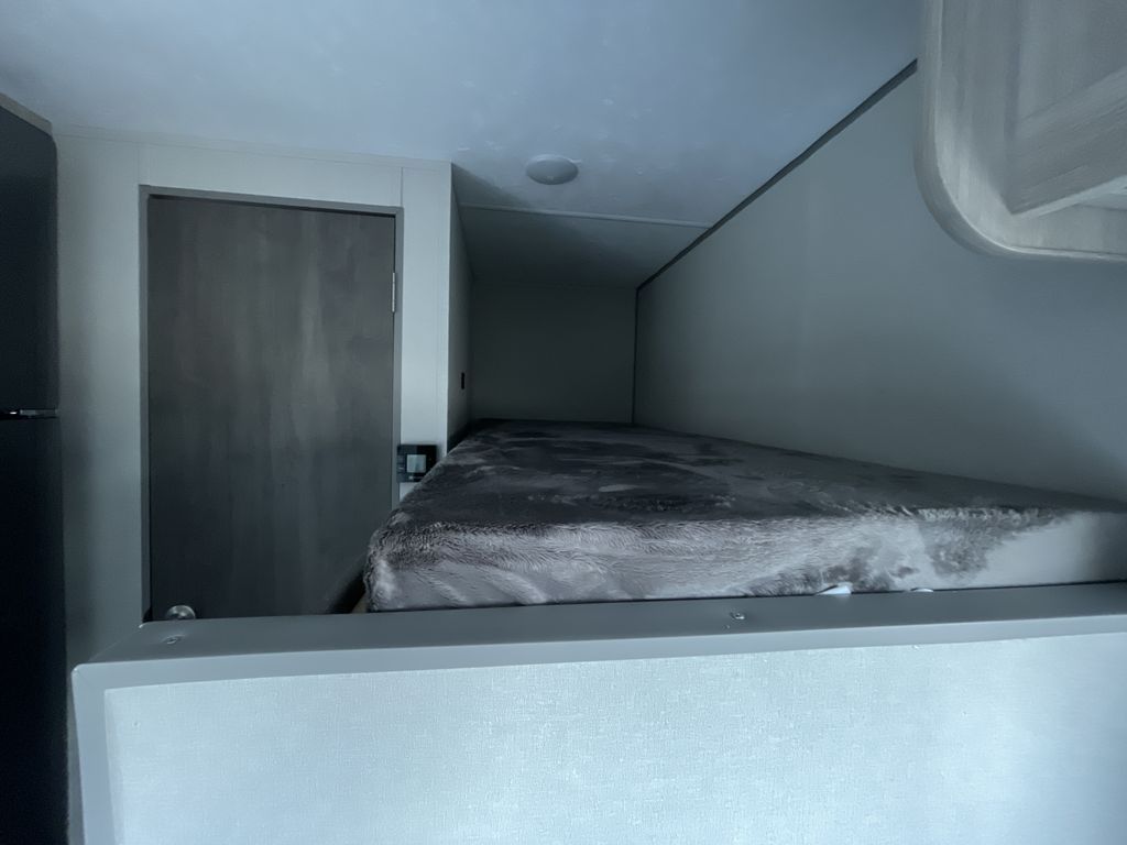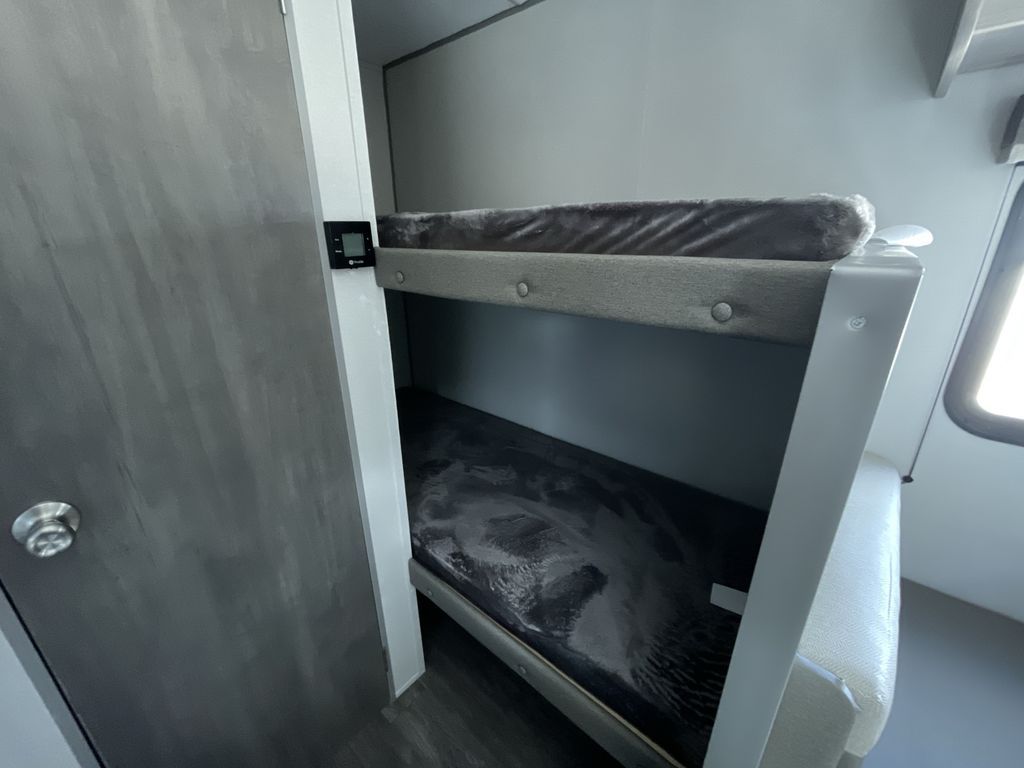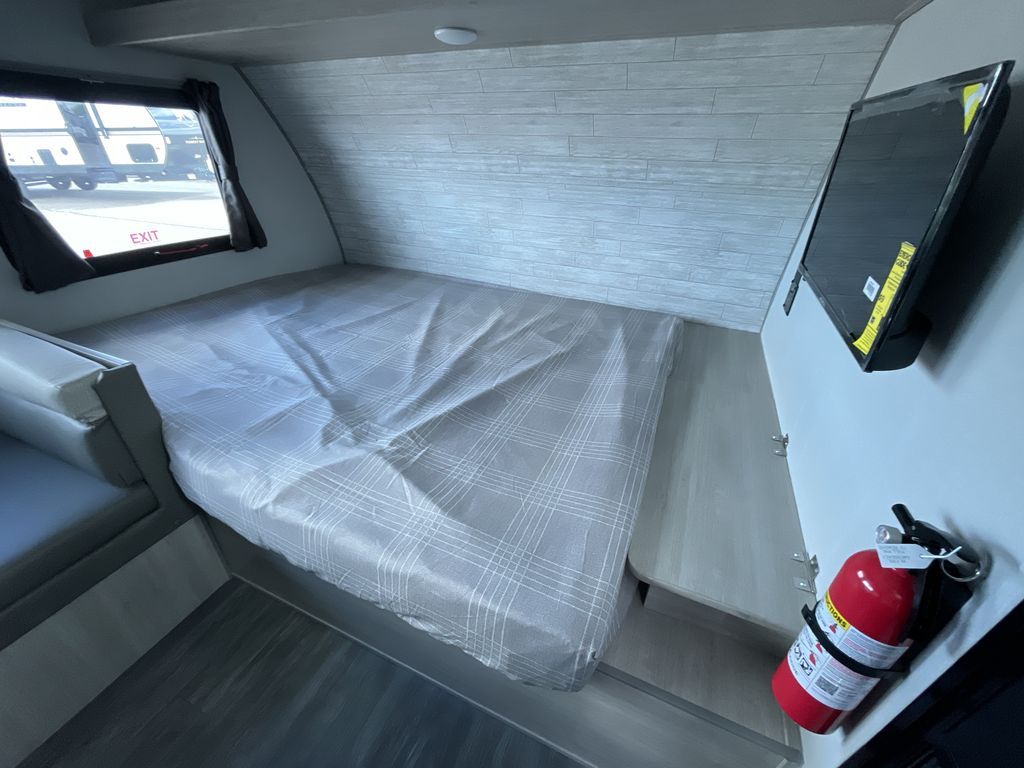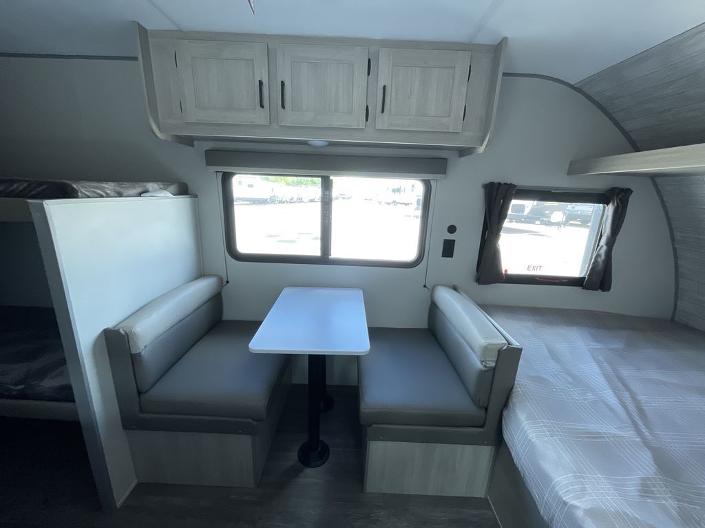 This cozy travel trailer can sleep five, so pack up and head out! You will have a queen bed up front to sleep on each night instead of an air mattress, and the little ones can take the 28" x 70" bunk beds! There is also a booth dinette here that can sleep an additional guest and is perfect for sharing meals during the day. The two burner cooktop and microwave oven means you won't have to cook over a campfire, and the private toilet and shower lets you clean up after a day outdoors. This model includes plenty of storage space, including bedroom storage, an exterior pass-through, plus additional outside storage beneath the bunks for hiking gear!