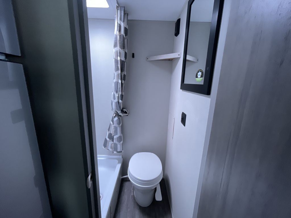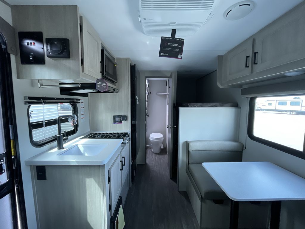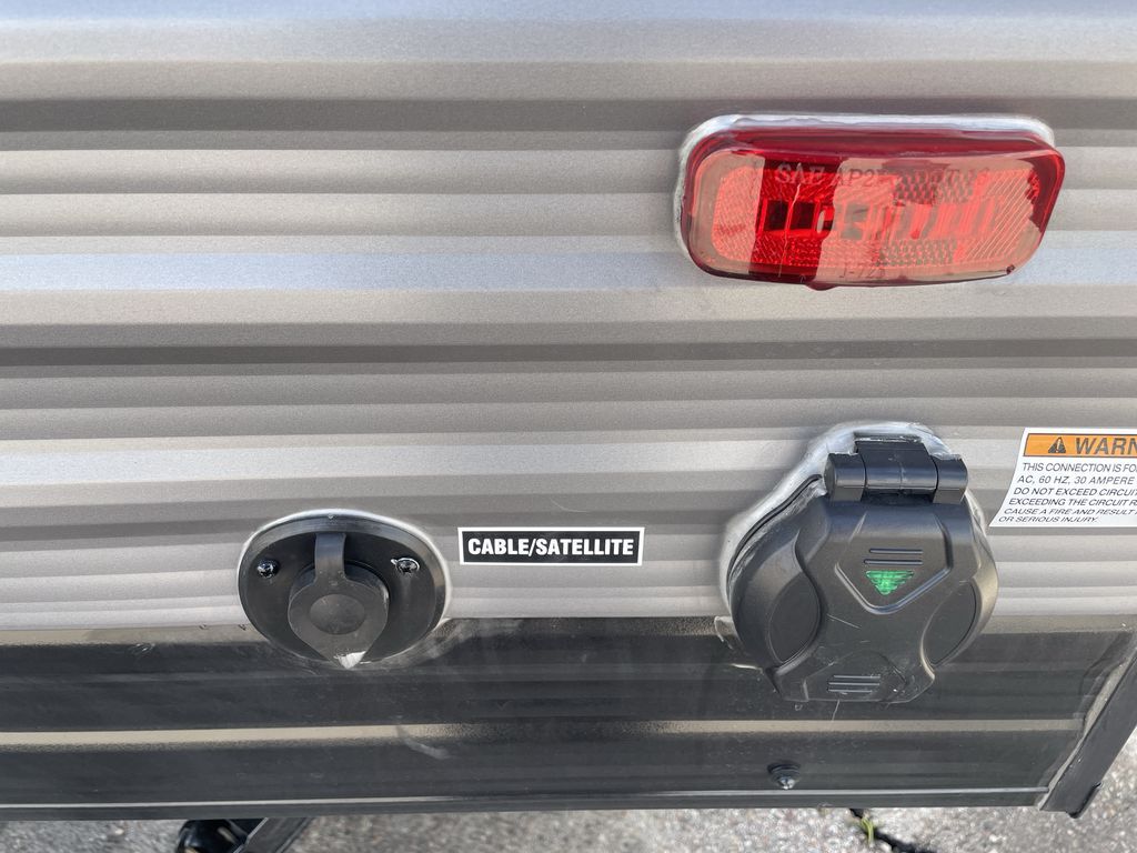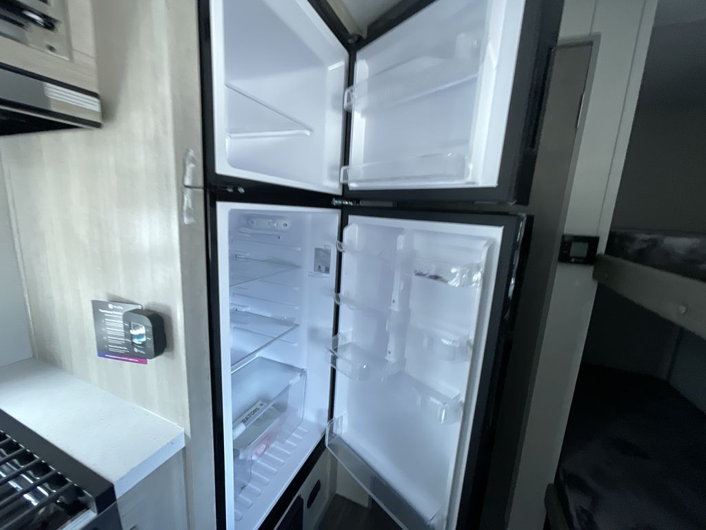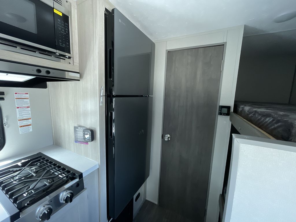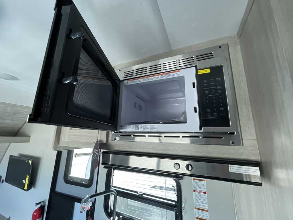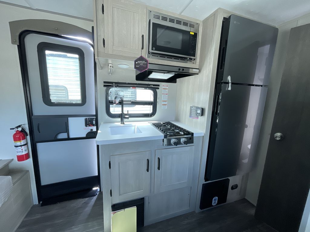This cozy travel trailer can sleep five, so pack up and head out! You will have a queen bed up front to sleep on each night instead of an air mattress, and the little ones can take the 28" x 70" bunk beds! There is also a booth dinette here that can sleep an additional guest and is perfect for sharing meals during the day. The two burner cooktop and microwave oven means you won't have to cook over a campfire, and the private toilet and shower lets you clean up after a day outdoors. This model includes plenty of storage space, including bedroom storage, an exterior pass-through, plus additional outside storage beneath the bunks for hiking gear!