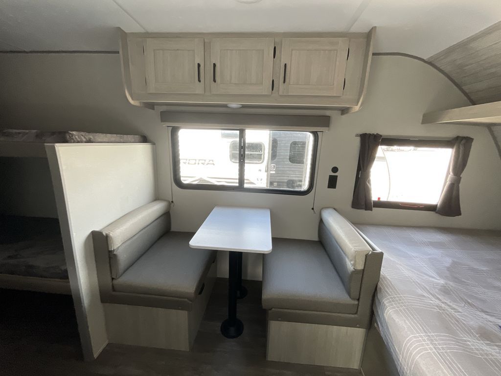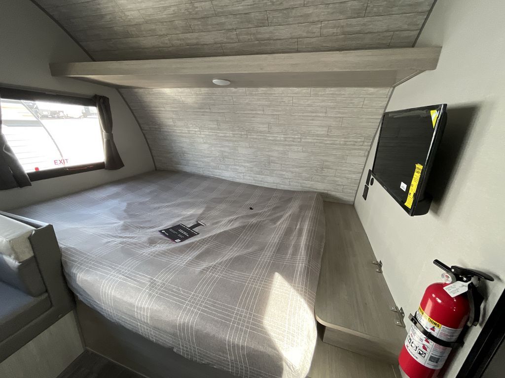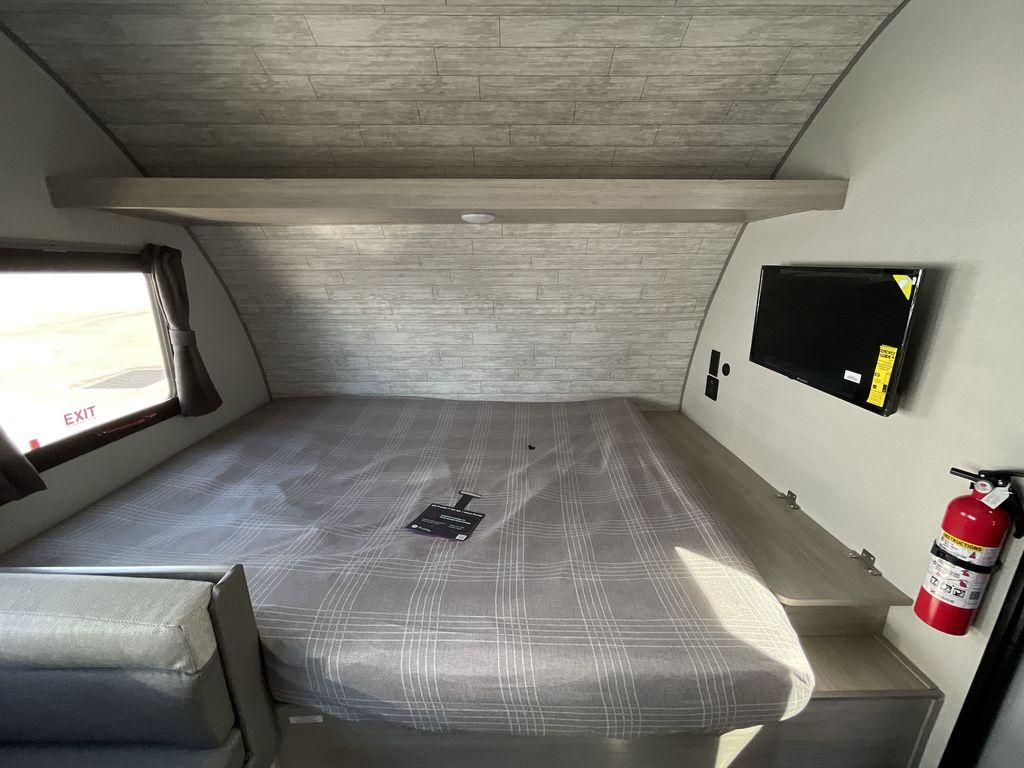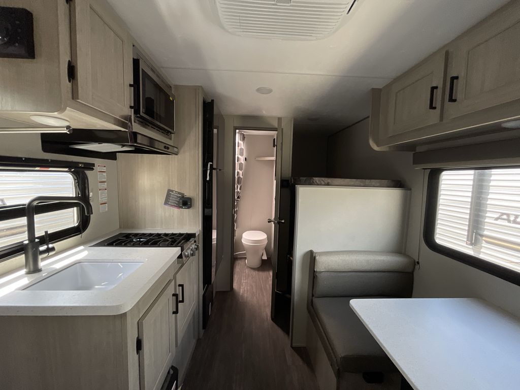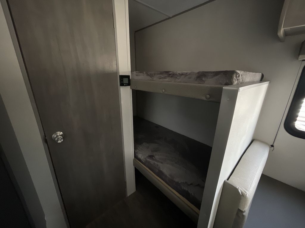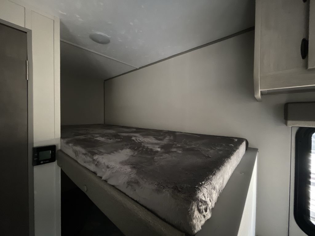 This cozy travel trailer can sleep five, so pack up and head out! You will have a queen bed up front to sleep on each night instead of an air mattress, and the little ones can take the 28" x 70" bunk beds! There is also a booth dinette here that can sleep an additional guest and is perfect for sharing meals during the day. The two burner cooktop and microwave oven means you won't have to cook over a campfire, and the private toilet and shower lets you clean up after a day outdoors. This model includes plenty of storage space, including bedroom storage, an exterior pass-through, plus additional outside storage beneath the bunks for hiking gear!