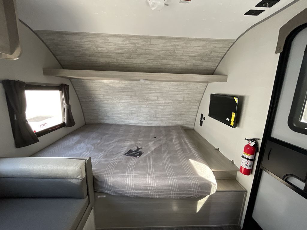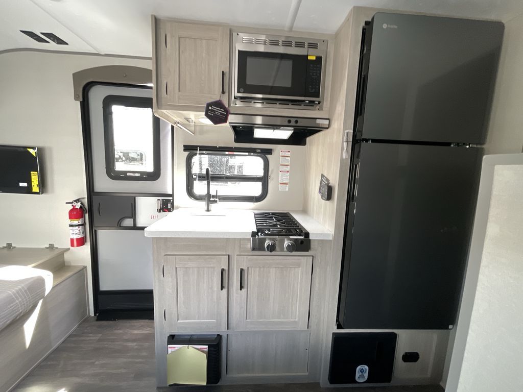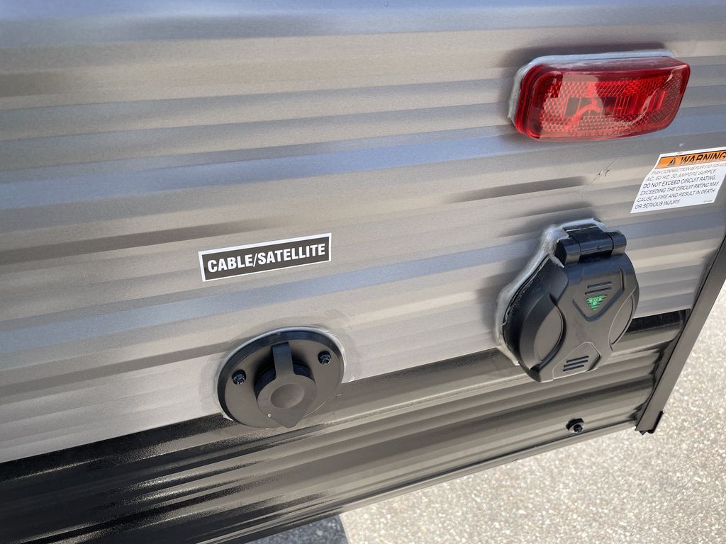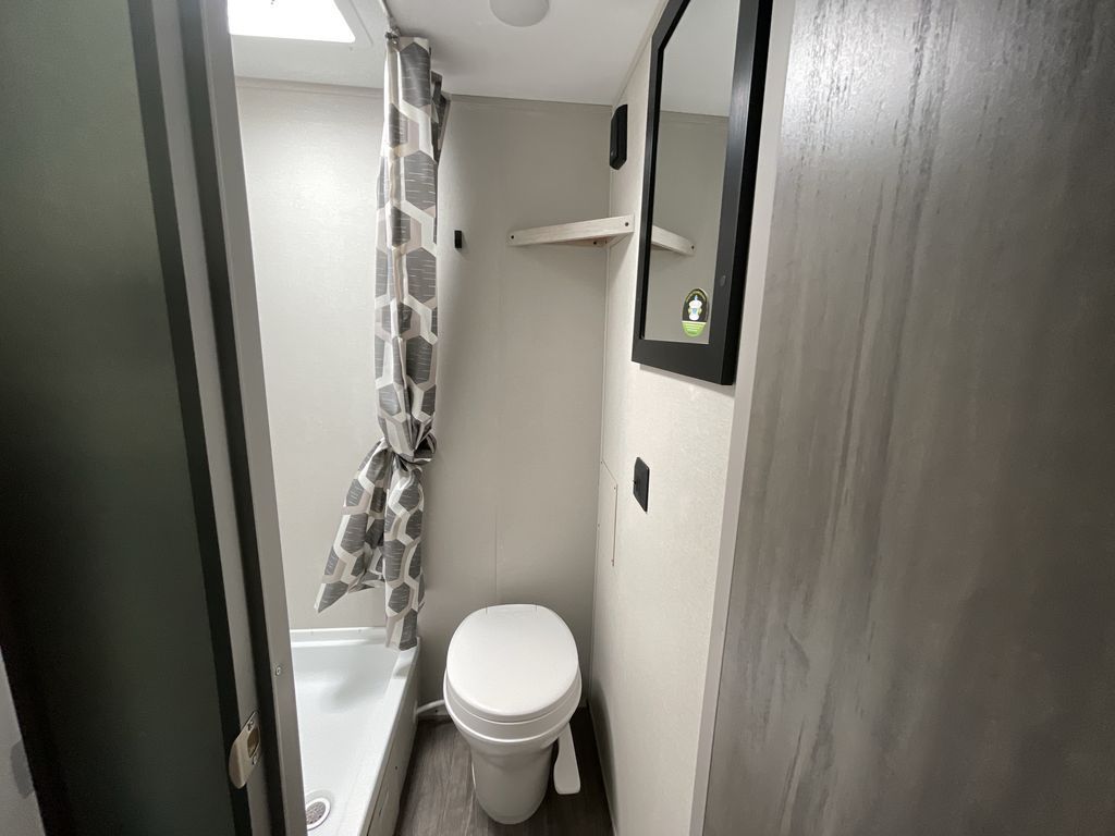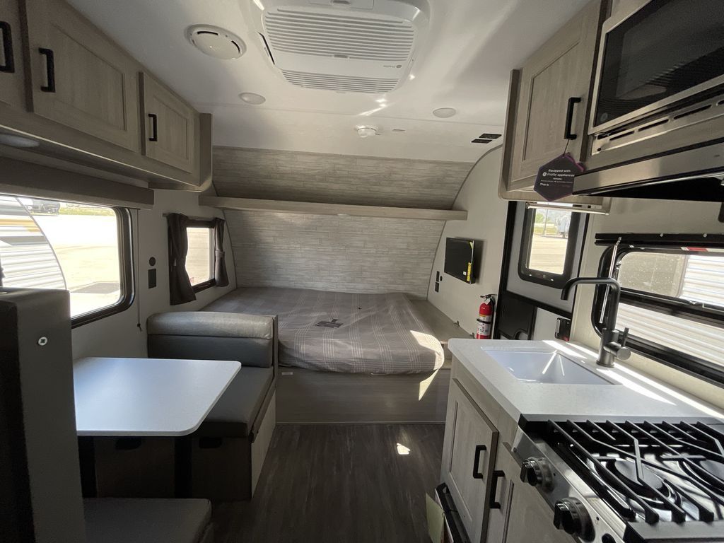 This cozy travel trailer can sleep five, so pack up and head out! You will have a queen bed up front to sleep on each night instead of an air mattress, and the little ones can take the 28" x 70" bunk beds! There is also a booth dinette here that can sleep an additional guest and is perfect for sharing meals during the day. The two burner cooktop and microwave oven means you won't have to cook over a campfire, and the private toilet and shower lets you clean up after a day outdoors. This model includes plenty of storage space, including bedroom storage, an exterior pass-through, plus additional outside storage beneath the bunks for hiking gear!