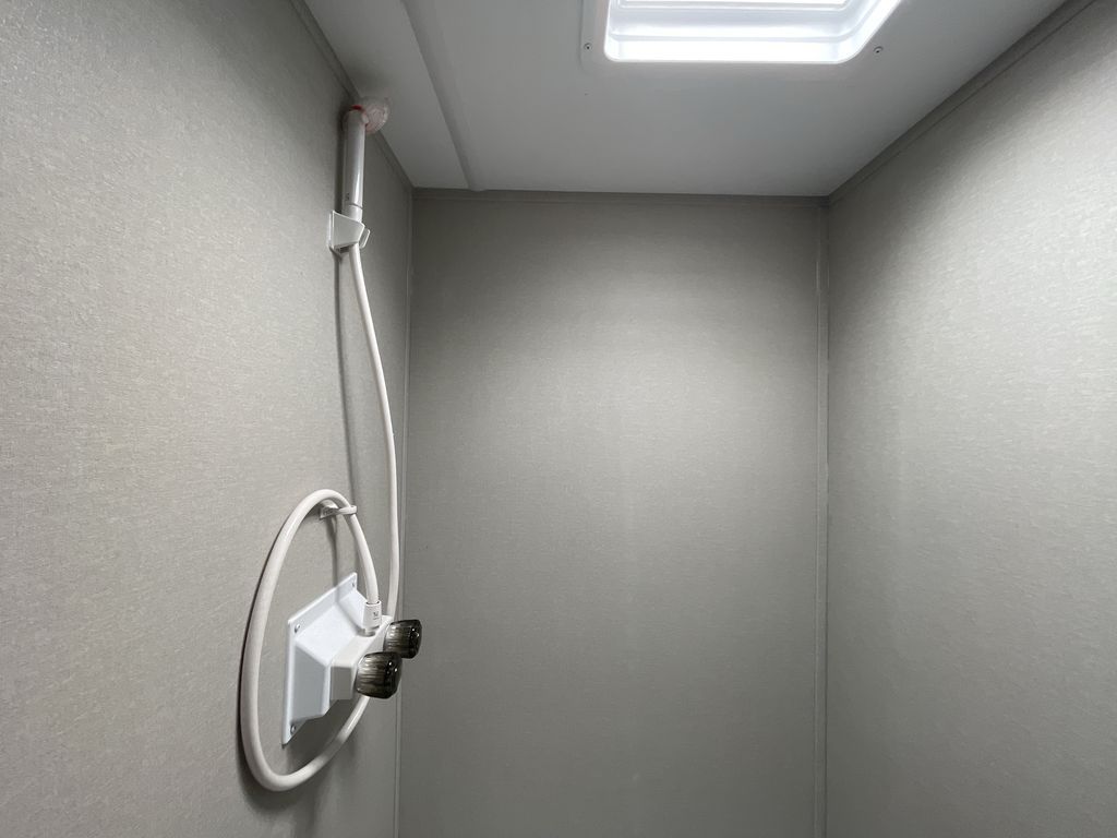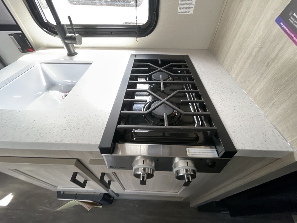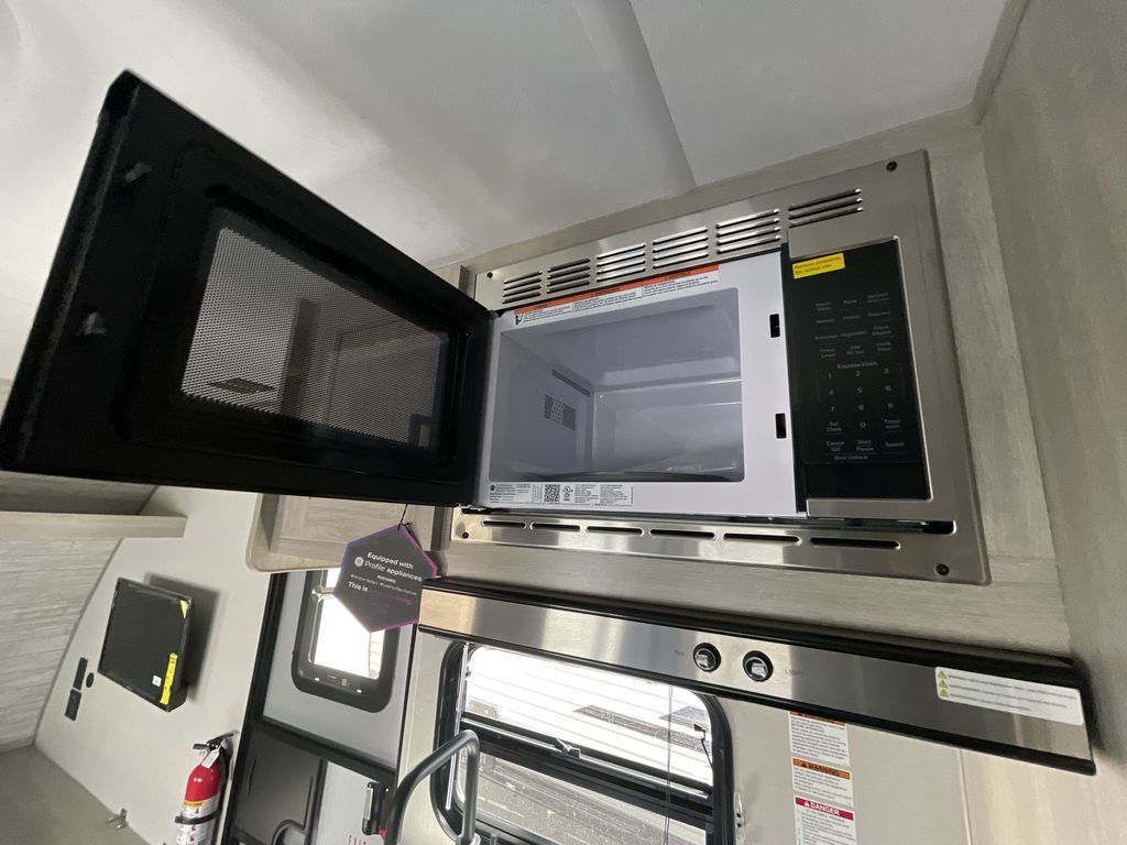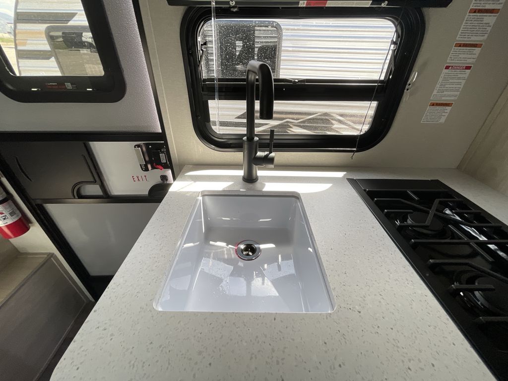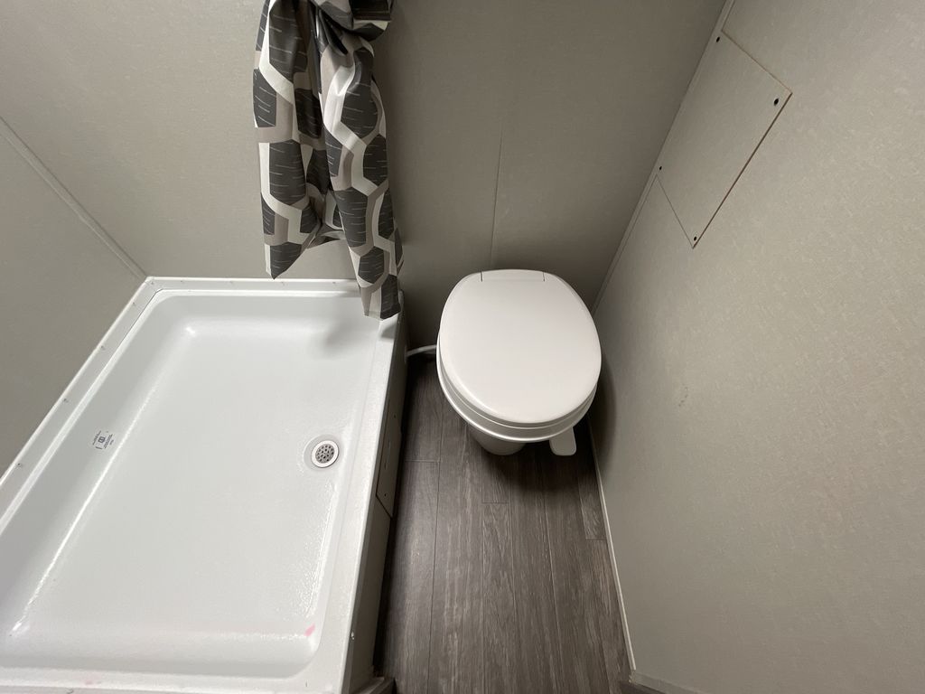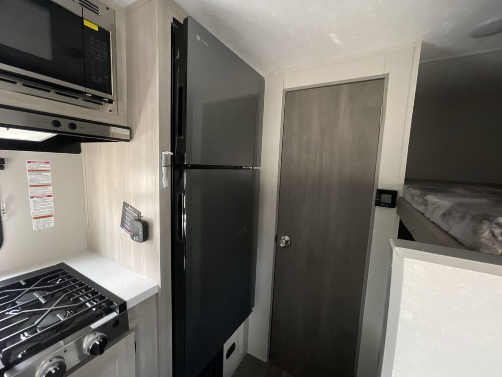 This cozy travel trailer can sleep five, so pack up and head out! You will have a queen bed up front to sleep on each night instead of an air mattress, and the little ones can take the 28" x 70" bunk beds! There is also a booth dinette here that can sleep an additional guest and is perfect for sharing meals during the day. The two burner cooktop and microwave oven means you won't have to cook over a campfire, and the private toilet and shower lets you clean up after a day outdoors. This model includes plenty of storage space, including bedroom storage, an exterior pass-through, plus additional outside storage beneath the bunks for hiking gear!