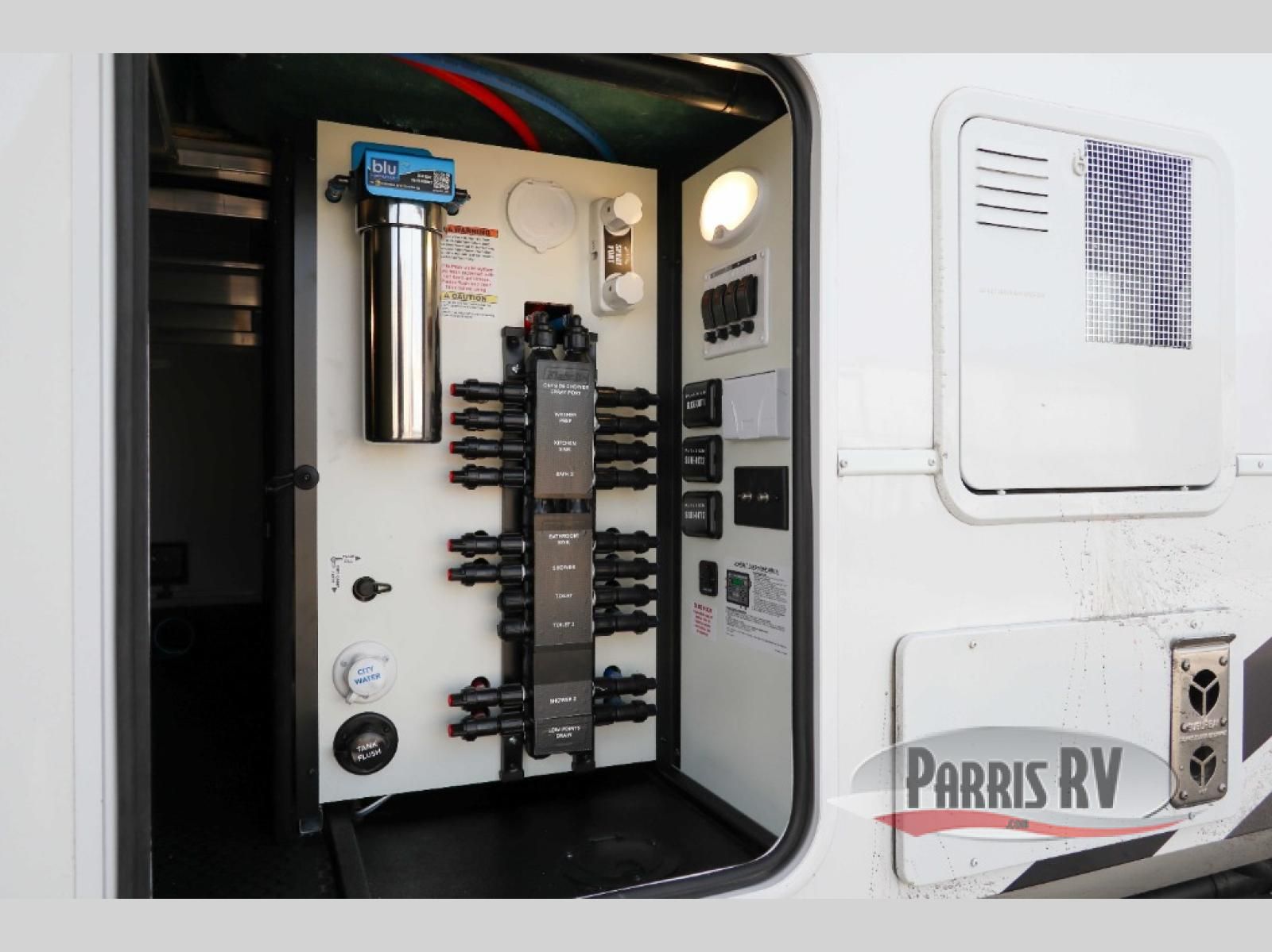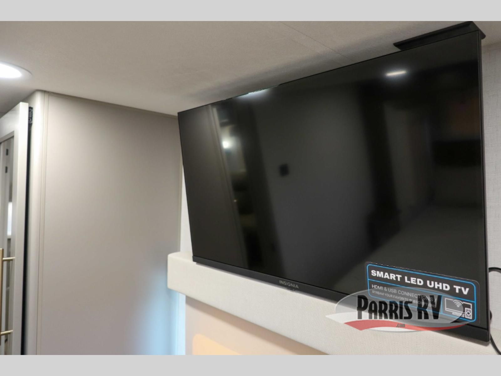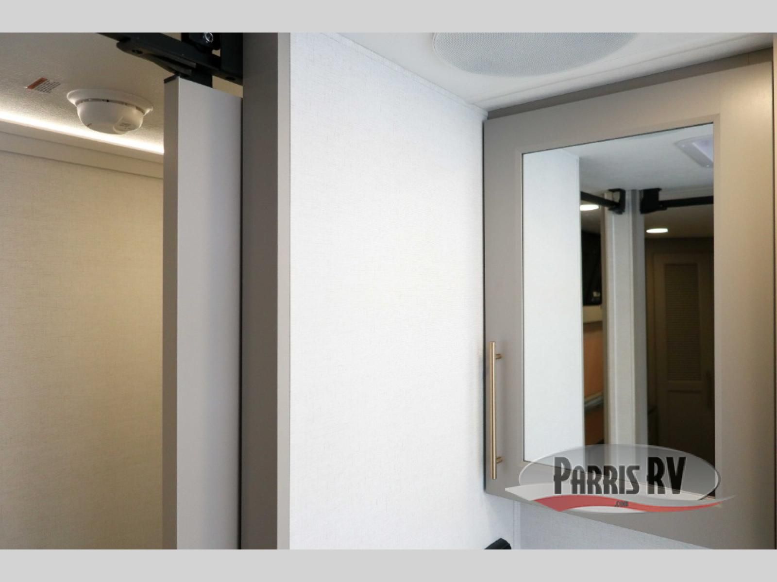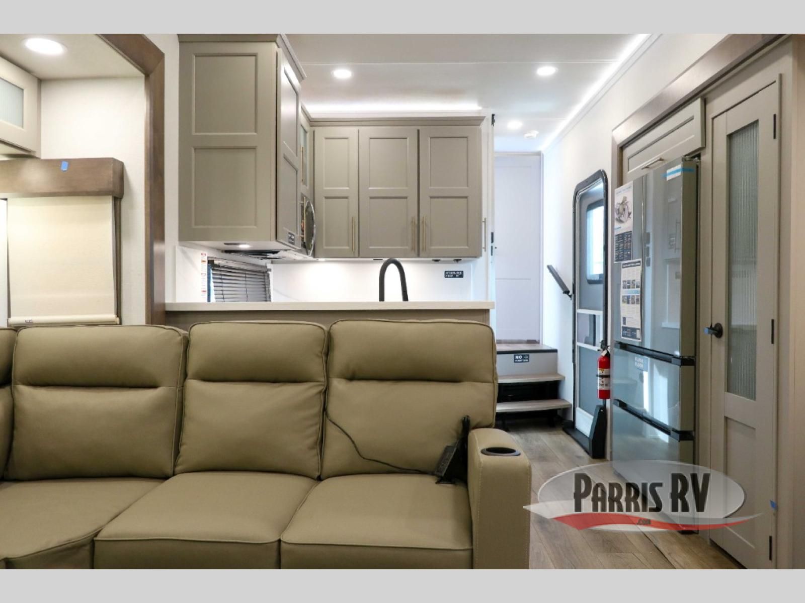 A spacious unit with sleeping for eight with plenty of choices to suit everyone! There is a front private bedroom with a king size bed that offers a large full front closet that has also been prepped for a washer and dryer if you choose that option. The front bath features a 40" x 30" shower and dual entry. Head down to the kitchen and living space at the bottom of the stairs to find a curbside slide that houses the 19 cu. ft. residential refrigerator, a pantry, and a swivel table and desk. As you continue on toward the rear of this coach, you will find a spacious living area along the roadside with a 50" Smart TV and a fireplace, a L-sofa sleeper slide, and a dual reclining loveseat. This makes a great gathering place for television watching, game playing, and even added sleeping space if needed at night. The rear private bedroom with its own private bath features a queen bed, two closets, and a Smart TV as well. The multipurpose loft area above can be accessed just before this rear bedroom entry by a ladder, and it is perfect for extra storage, or it can be used for added sleeping that the kiddos are sure to love.