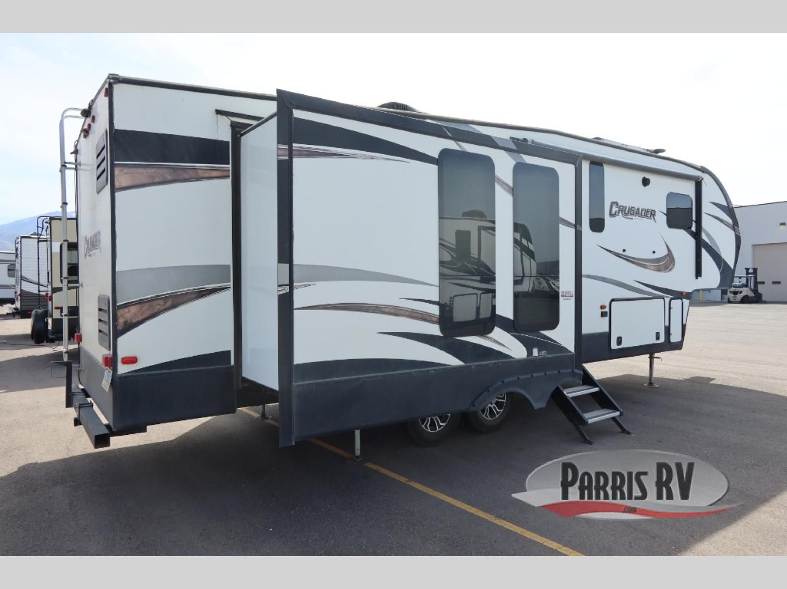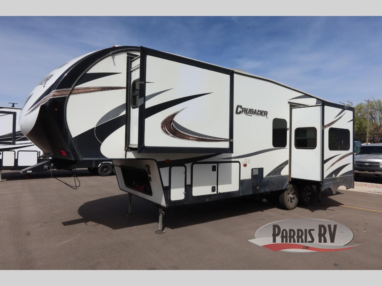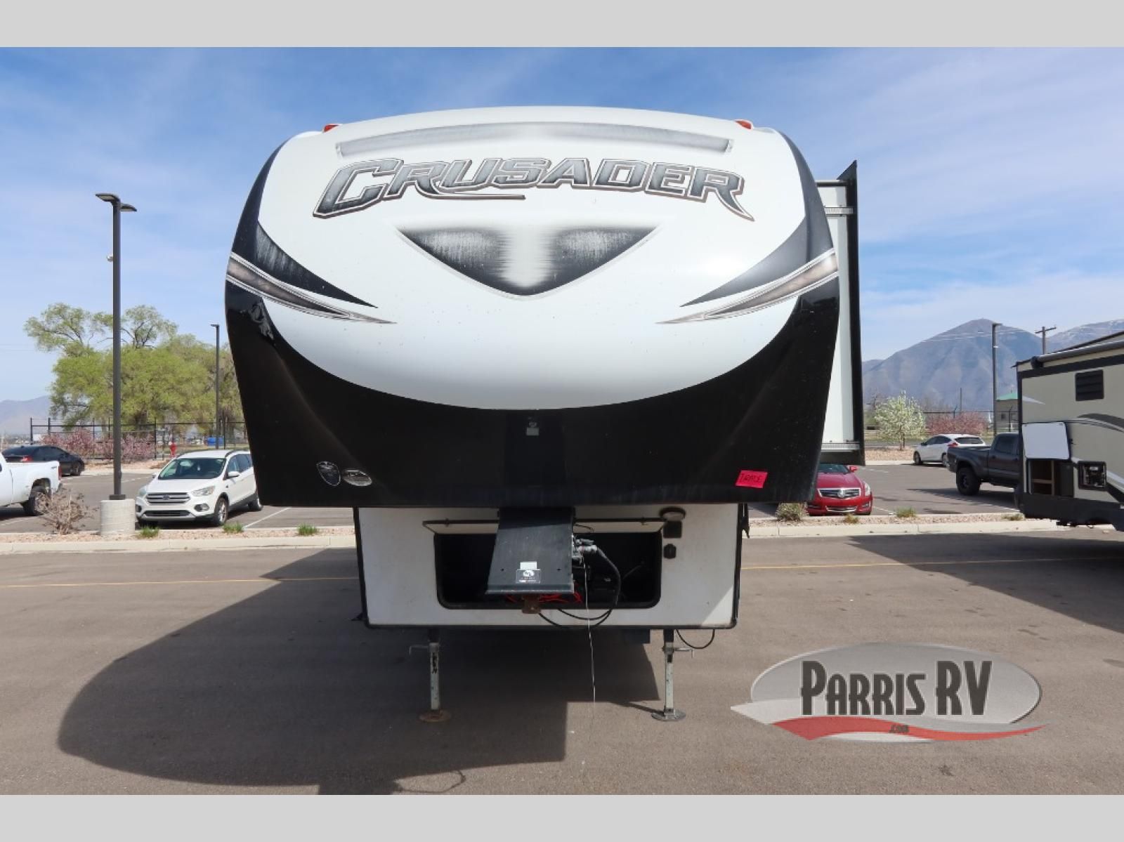 This Crusader fifth wheel contains all of the elements that you love best about your own home. Whether you have stopped to take a quick nap in the front, private bedroom or you are whipping up an afternoon snack in the rear kitchen, you will enjoy the many benefits that this unit provides. Everyone will love gathering together in the open-concept living area because the three slides that have been inserted in this unit allow it to offer extra room to keep this fifth wheel spacious and accommodating.