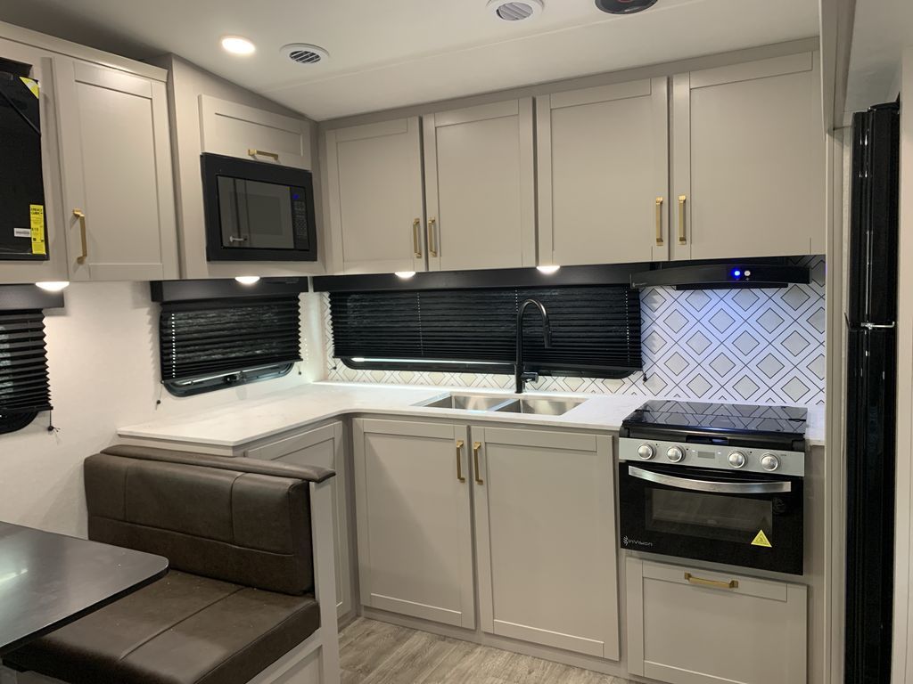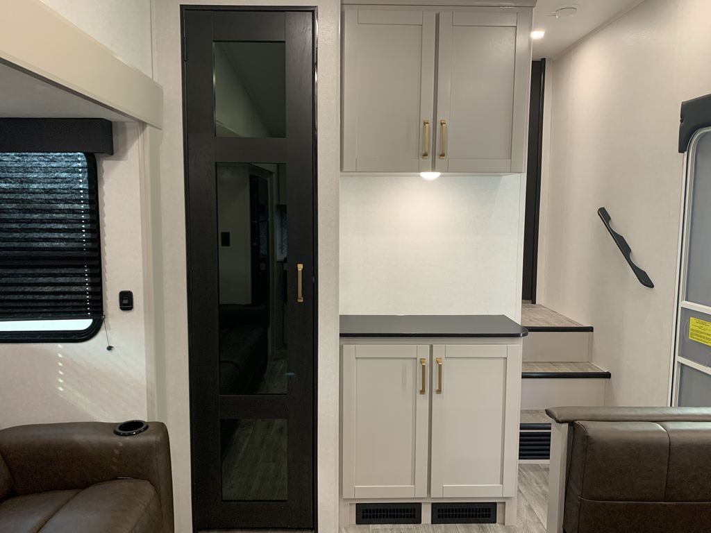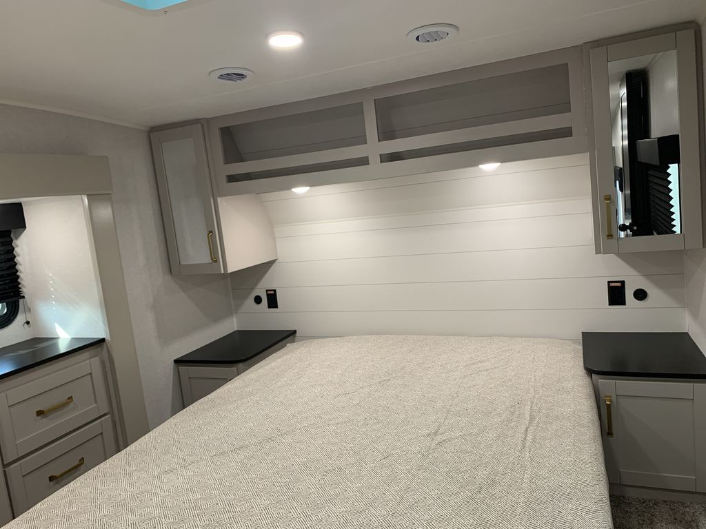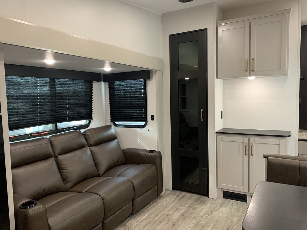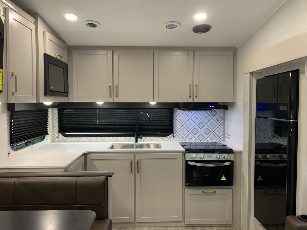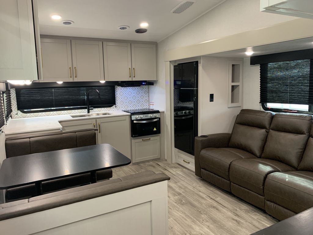 The fifth wheel you were waiting for! The spacious rear kitchen is equipped with a three-burner cooktop, microwave, booth dinette, 12V refrigerator, and sink, providing ample space for meal preparation. Overhead cabinets and a pantry provide ample storage for cookware, dishes, and other essential kitchen items. The living area features a trifold sofa, perfect for relaxation and entertainment. The full bathroom’s thoughtful design ensures that everyone has their own space, and the front bedroom is a retreat from the world, featuring a plush queen bed, a spacious wardrobe, and a closet.
