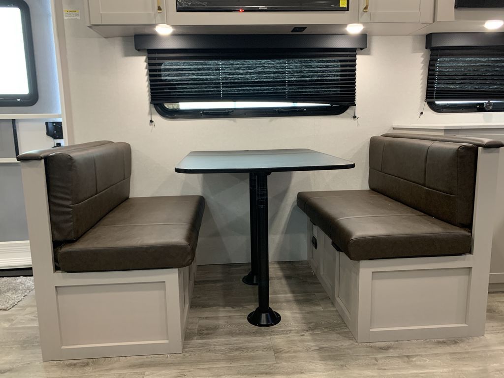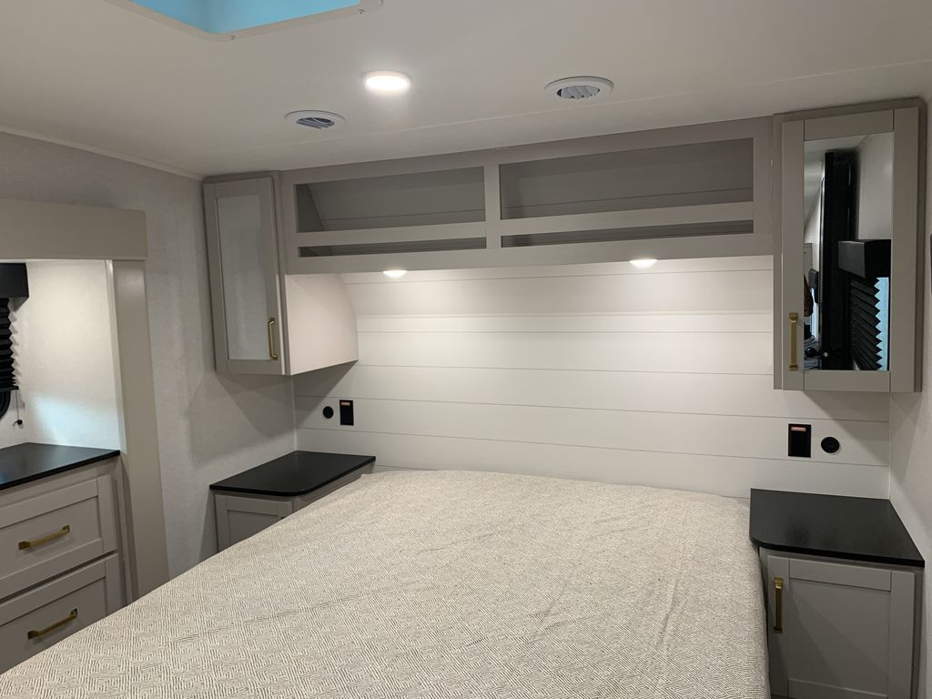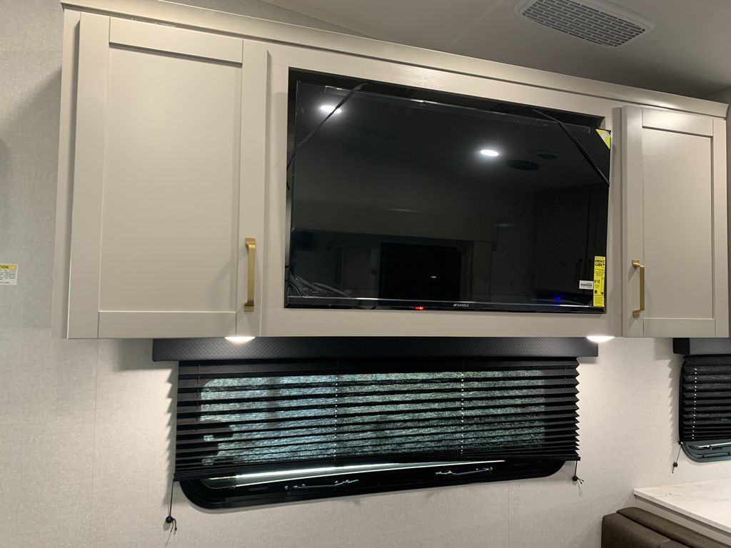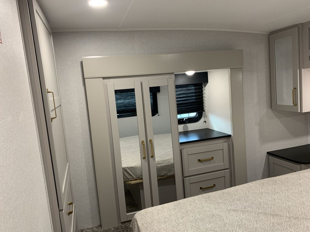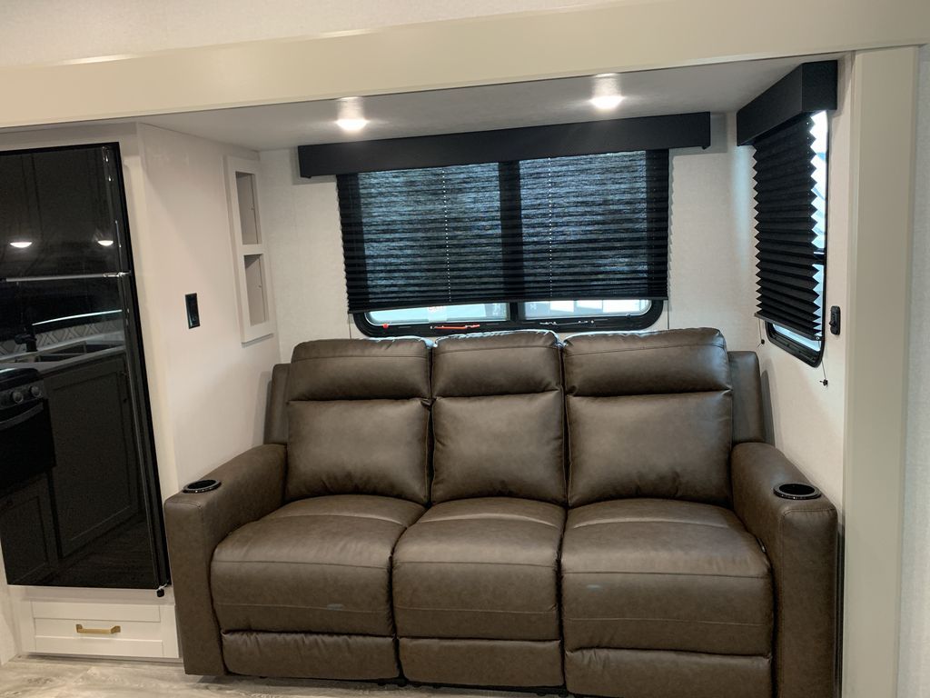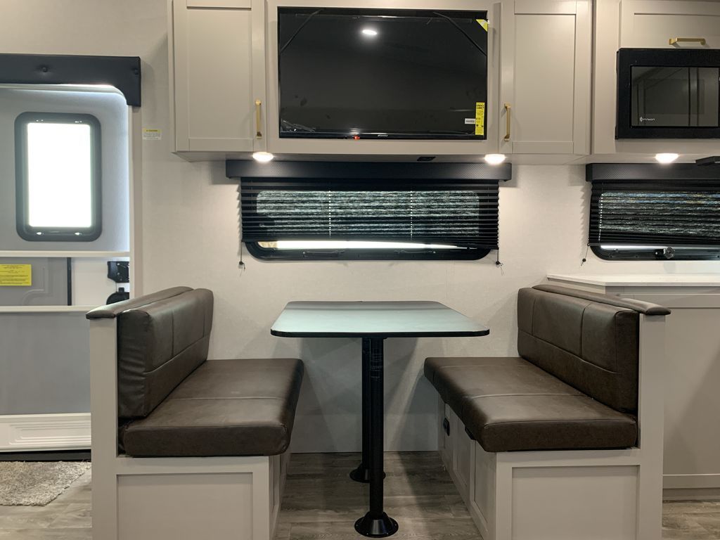 The fifth wheel you were waiting for! The spacious rear kitchen is equipped with a three-burner cooktop, microwave, booth dinette, 12V refrigerator, and sink, providing ample space for meal preparation. Overhead cabinets and a pantry provide ample storage for cookware, dishes, and other essential kitchen items. The living area features a trifold sofa, perfect for relaxation and entertainment. The full bathroom’s thoughtful design ensures that everyone has their own space, and the front bedroom is a retreat from the world, featuring a plush queen bed, a spacious wardrobe, and a closet.