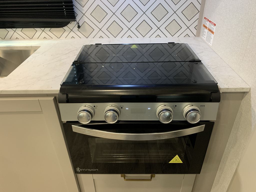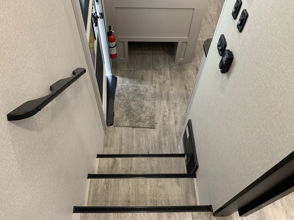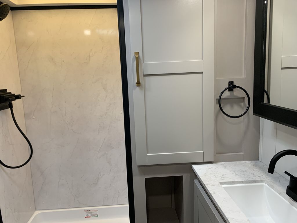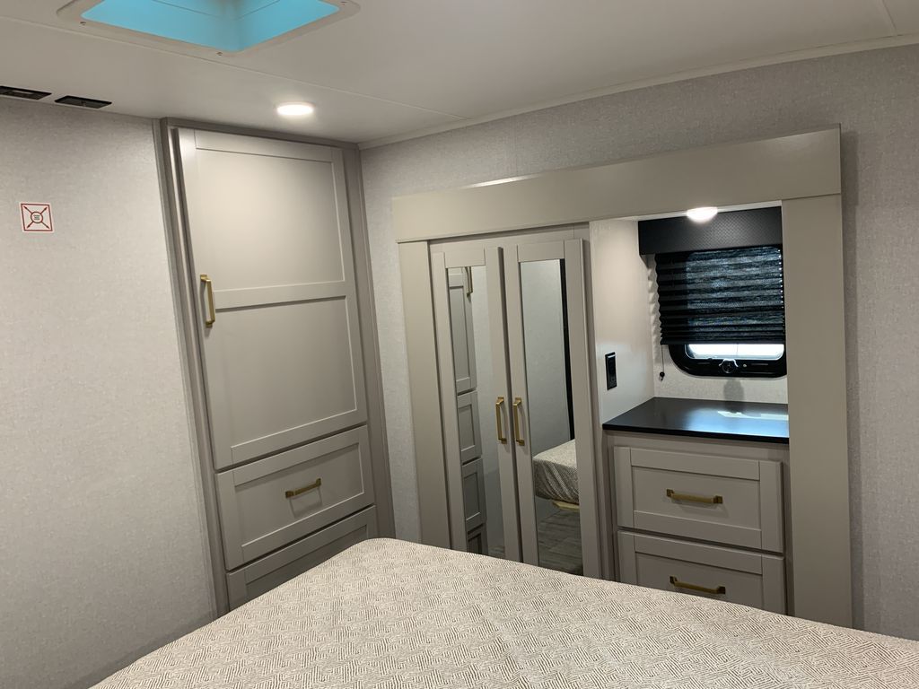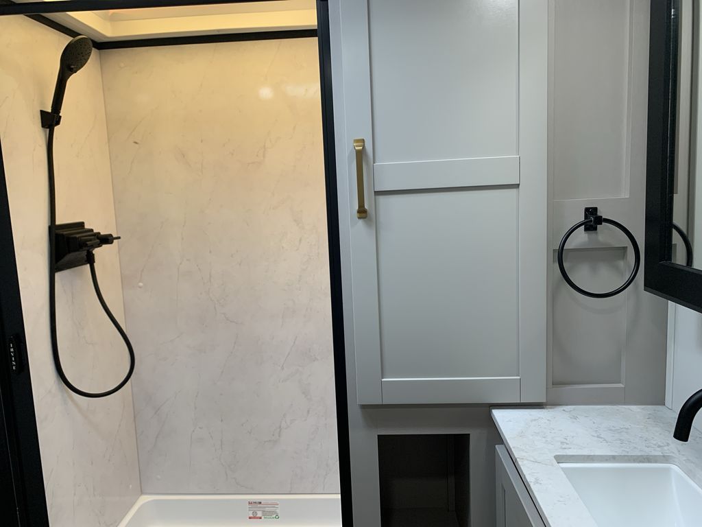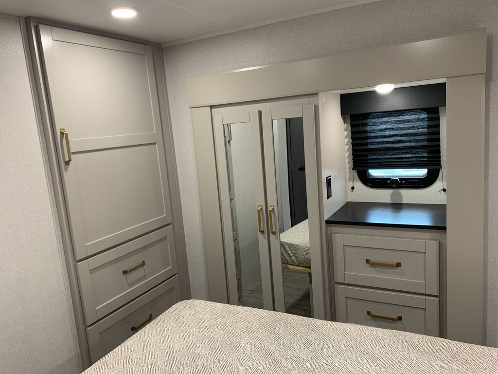 The fifth wheel you were waiting for! The spacious rear kitchen is equipped with a three-burner cooktop, microwave, booth dinette, 12V refrigerator, and sink, providing ample space for meal preparation. Overhead cabinets and a pantry provide ample storage for cookware, dishes, and other essential kitchen items. The living area features a trifold sofa, perfect for relaxation and entertainment. The full bathroom’s thoughtful design ensures that everyone has their own space, and the front bedroom is a retreat from the world, featuring a plush queen bed, a spacious wardrobe, and a closet.