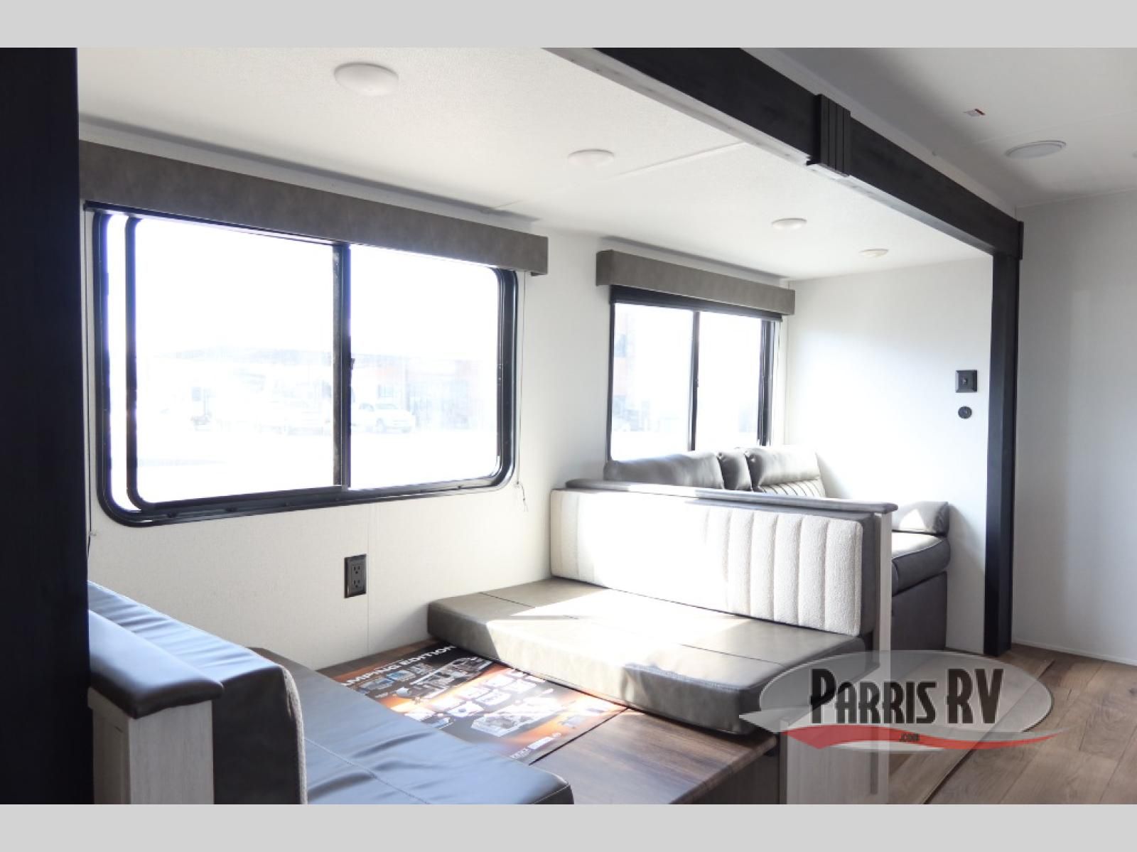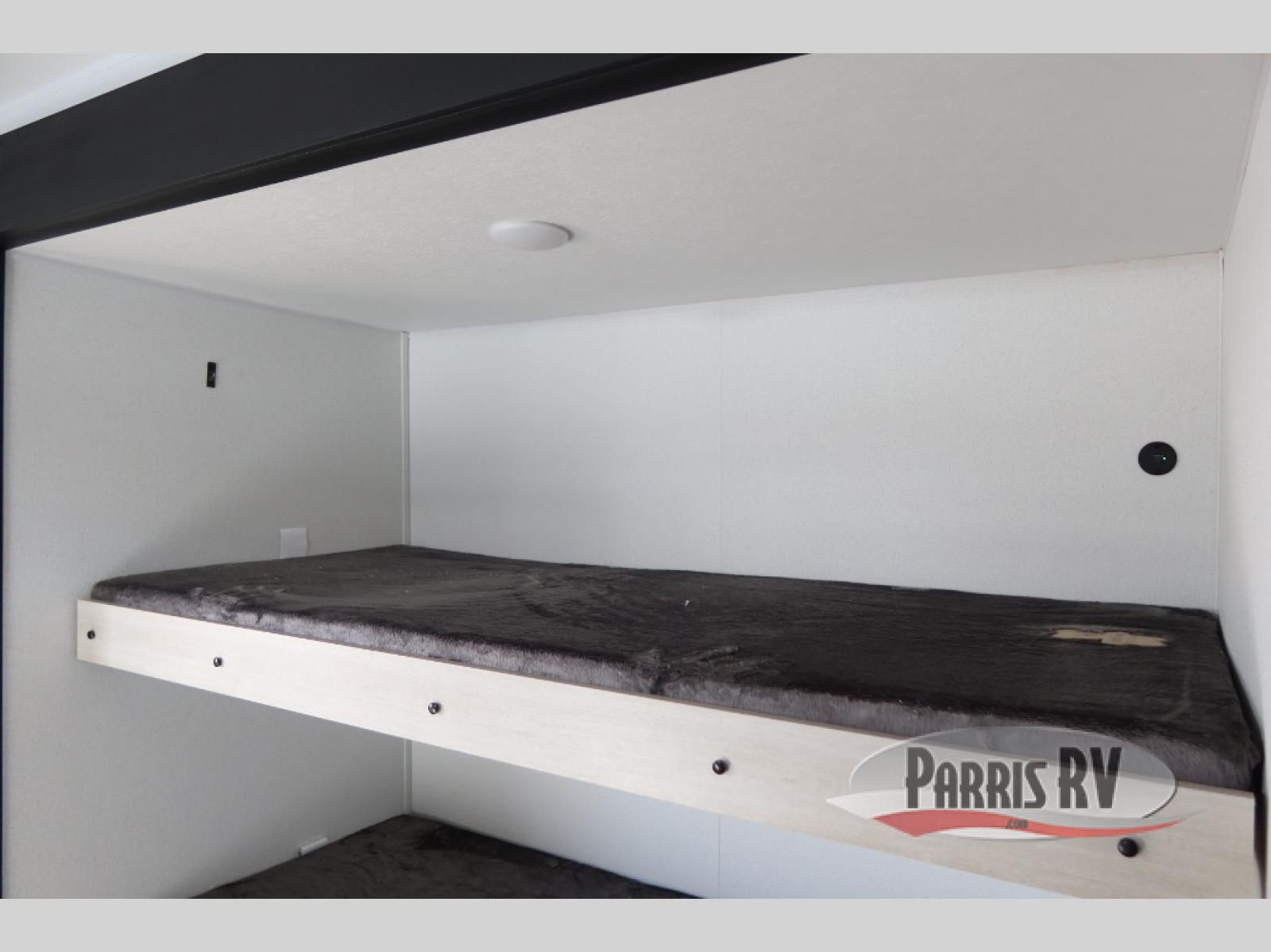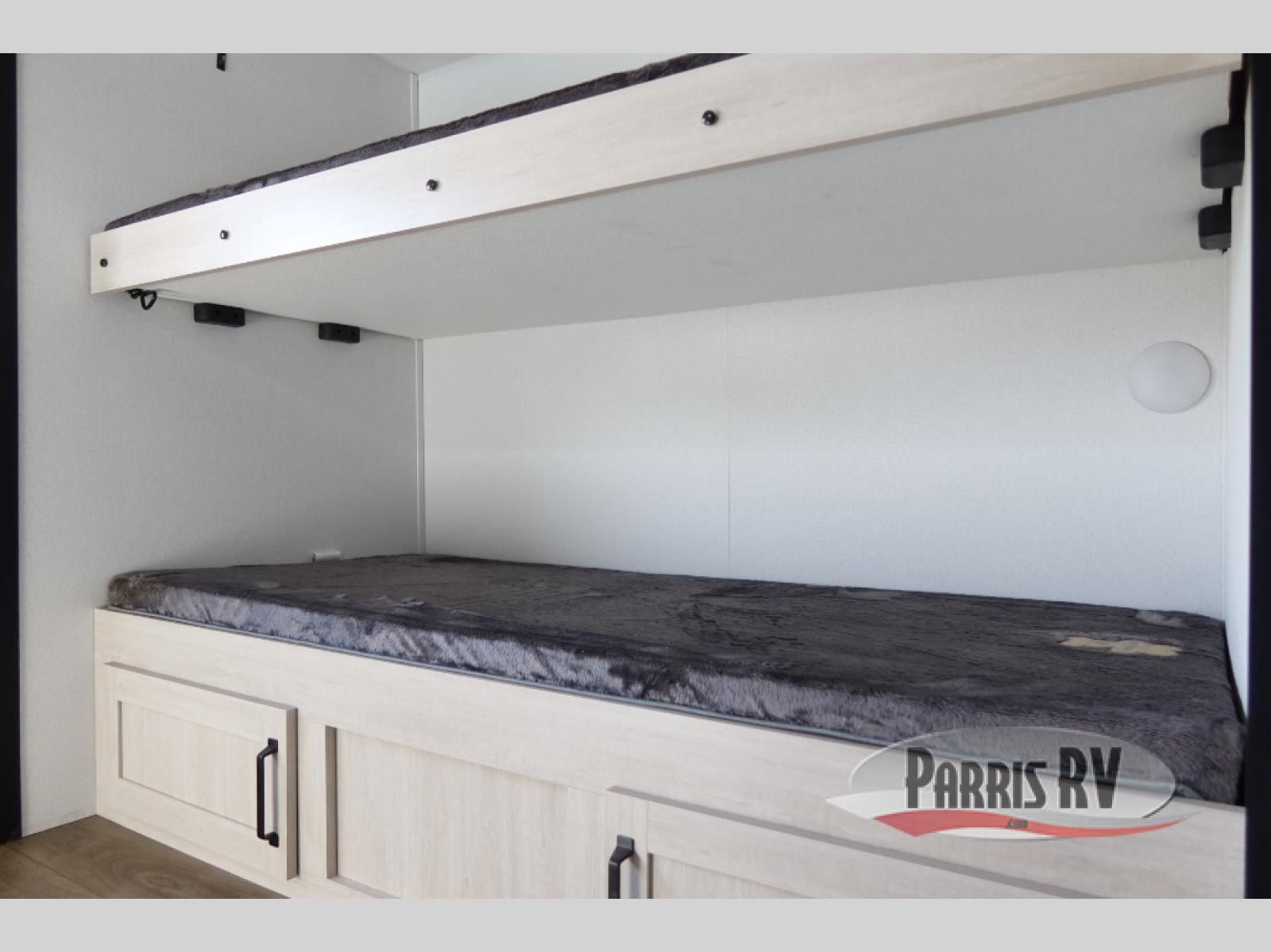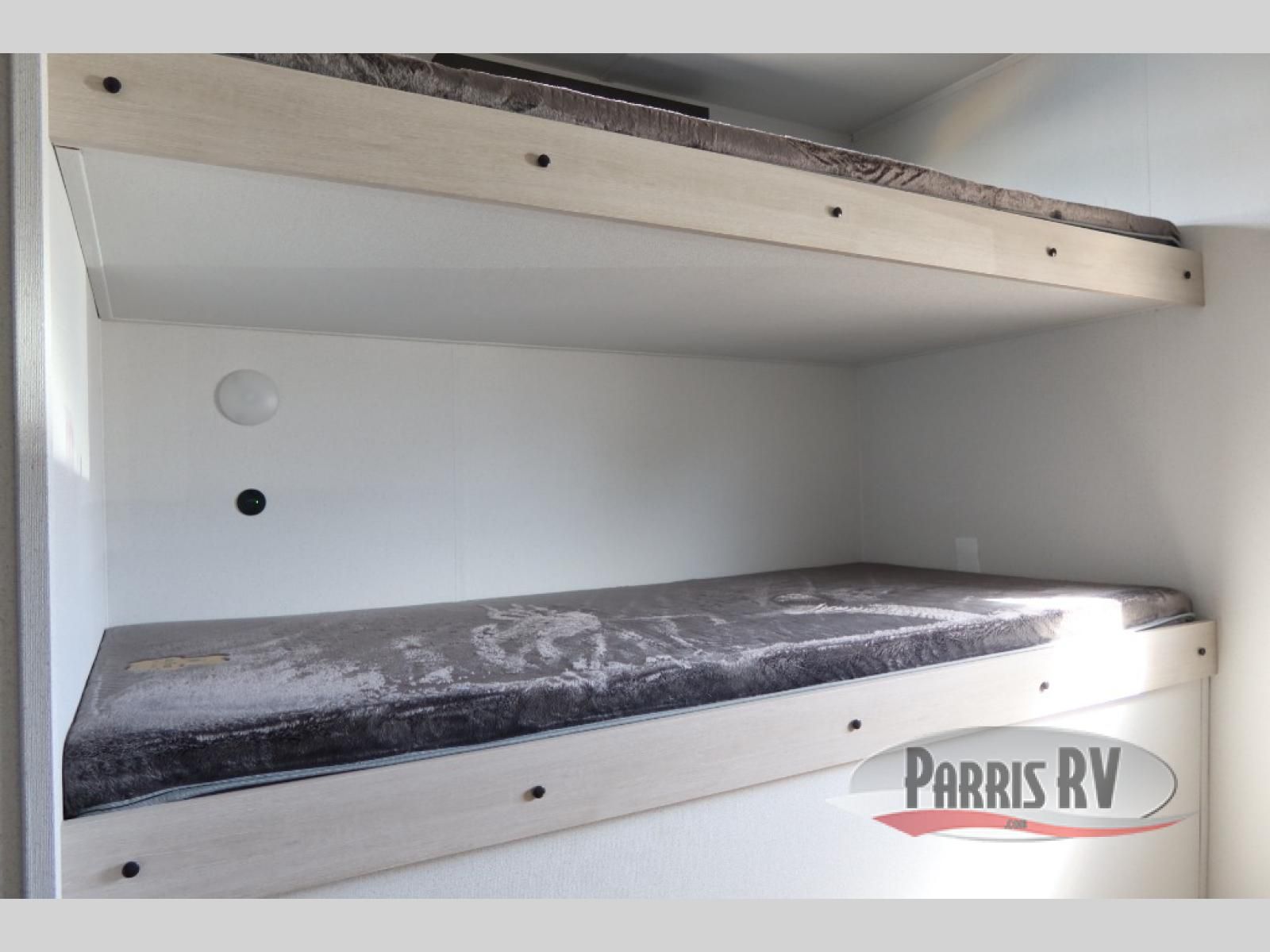 If you're looking for more space, this double axle, double slide out unit is perfect for your group of eight. Within the large slide in the living room, you'll find the booth dinette and sofa, which sit across from the optional TV if you want to enjoy movie nights. The full kitchen includes a microwave and three burner cooktop to make meals, plus a pantry and 12V refrigerator for food storage. And an optional outside mini kitchen with a grill can be added if you enjoy cooking outdoors! Your guests or littles are sure to enjoy the rear private bunkhouse that features a set of 38" x 76" bunks across from the third bunk and jiffy sofa within a slide out!