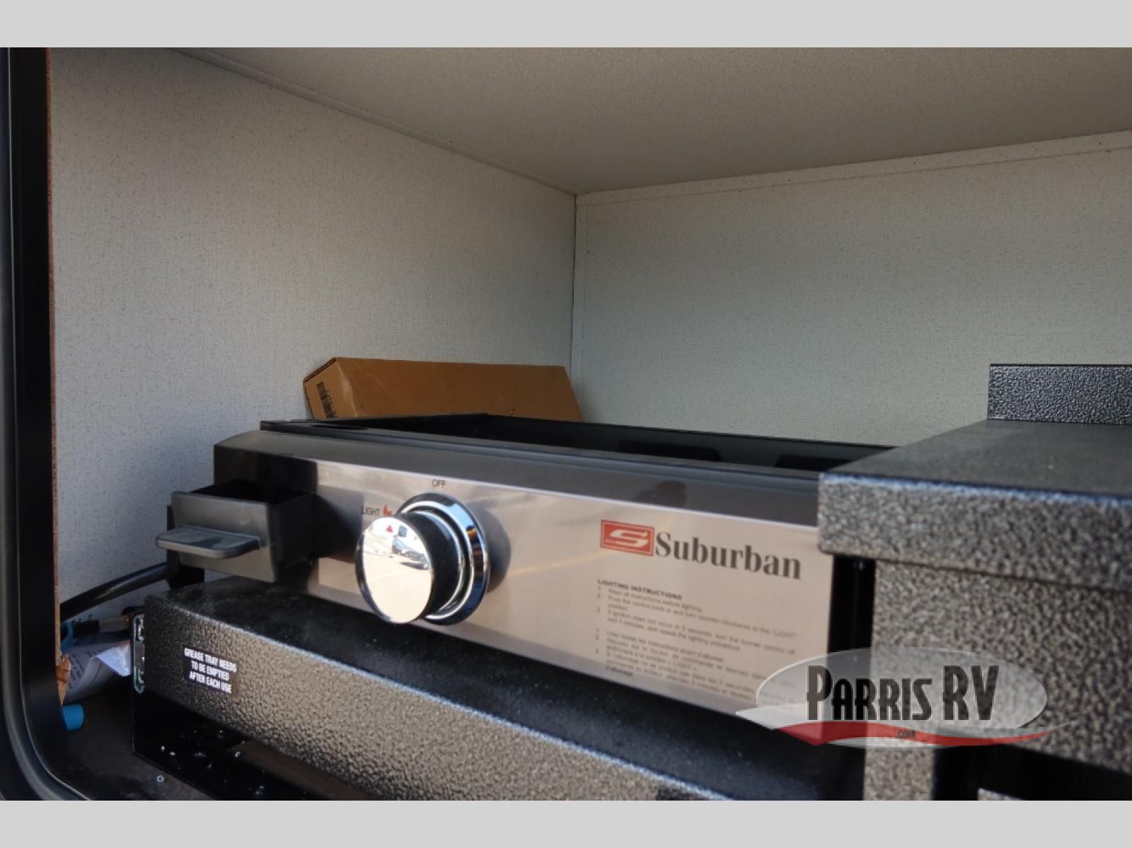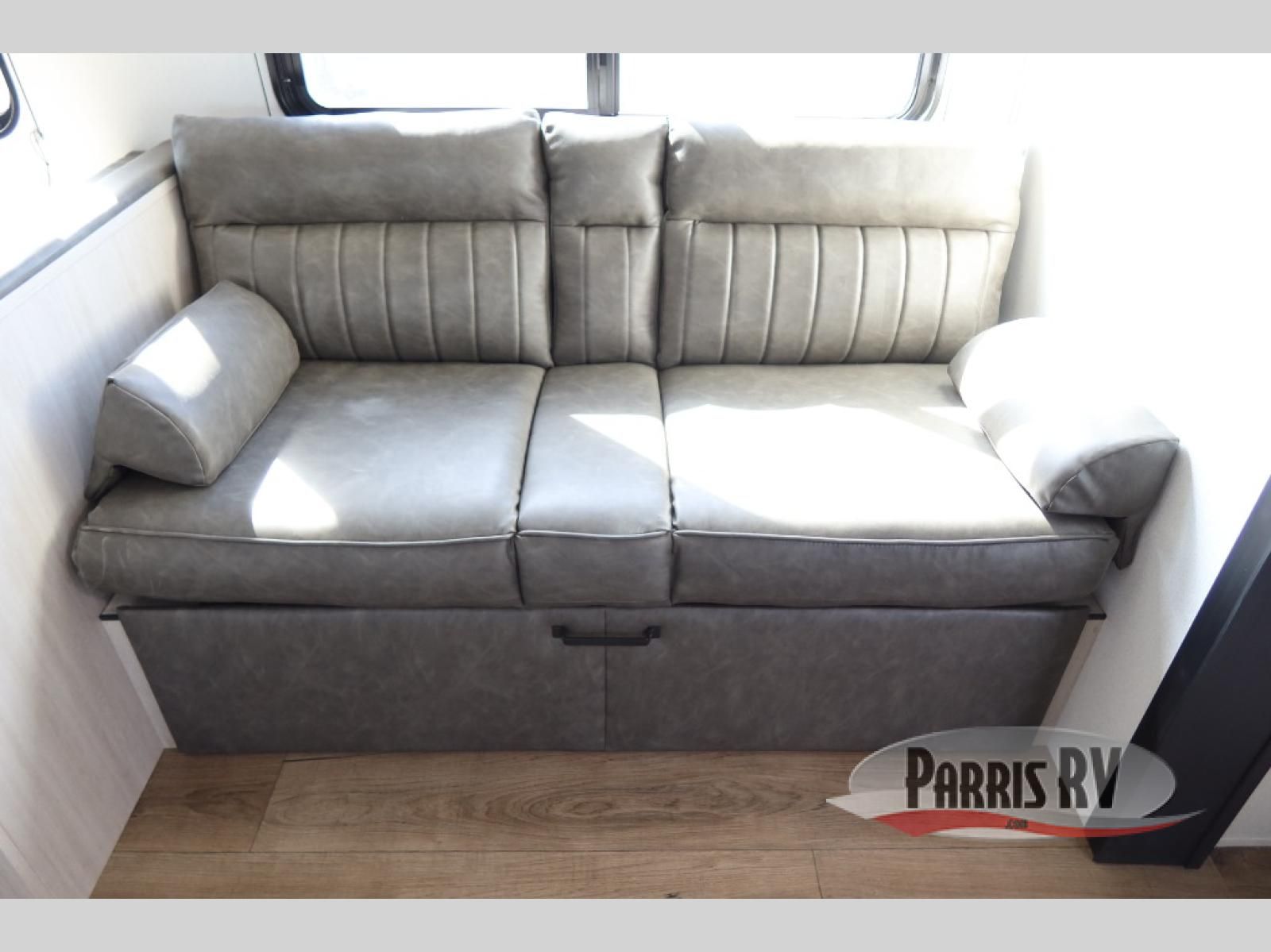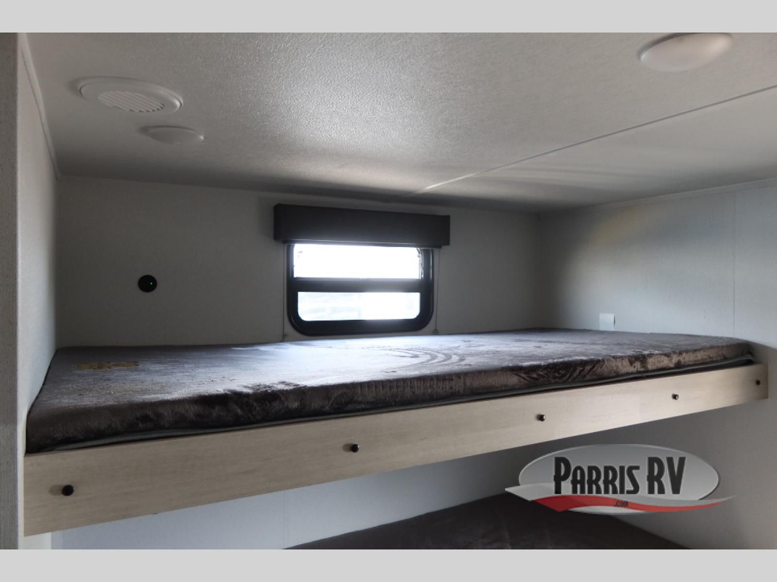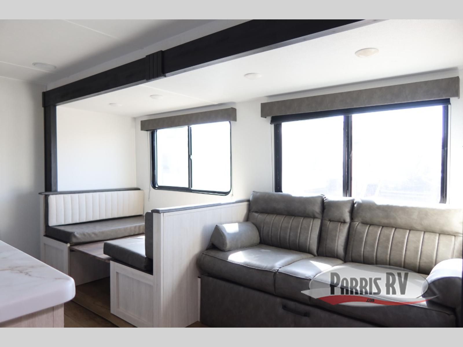 If you're looking for more space, this double axle, double slide out unit is perfect for your group of eight. Within the large slide in the living room, you'll find the booth dinette and sofa, which sit across from the optional TV if you want to enjoy movie nights. The full kitchen includes a microwave and three burner cooktop to make meals, plus a pantry and 12V refrigerator for food storage. And an optional outside mini kitchen with a grill can be added if you enjoy cooking outdoors! Your guests or littles are sure to enjoy the rear private bunkhouse that features a set of 38" x 76" bunks across from the third bunk and jiffy sofa within a slide out!