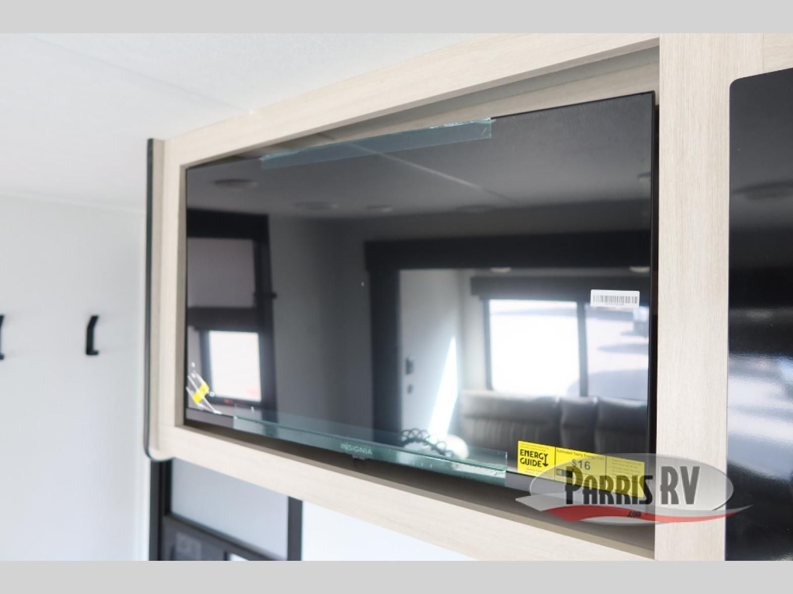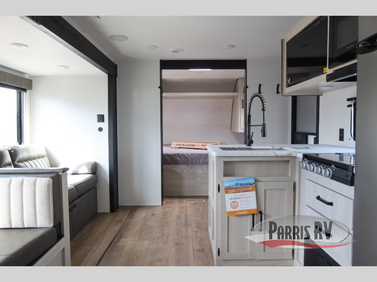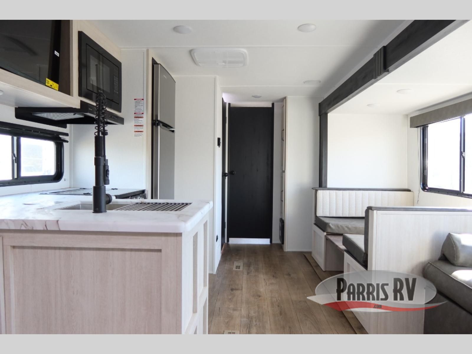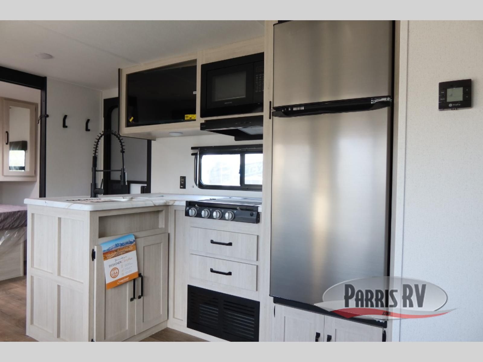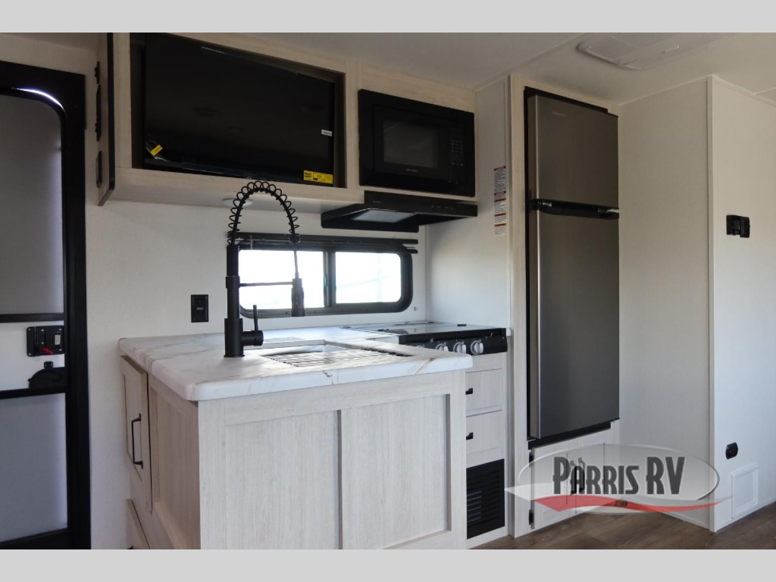 If you're looking for more space, this double axle, double slide out unit is perfect for your group of eight. Within the large slide in the living room, you'll find the booth dinette and sofa, which sit across from the optional TV if you want to enjoy movie nights. The full kitchen includes a microwave and three burner cooktop to make meals, plus a pantry and 12V refrigerator for food storage. And an optional outside mini kitchen with a grill can be added if you enjoy cooking outdoors! Your guests or littles are sure to enjoy the rear private bunkhouse that features a set of 38" x 76" bunks across from the third bunk and jiffy sofa within a slide out!