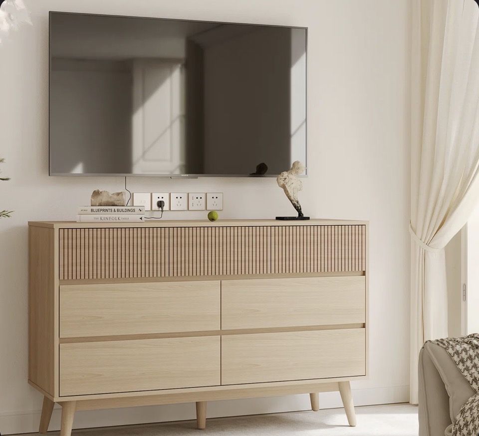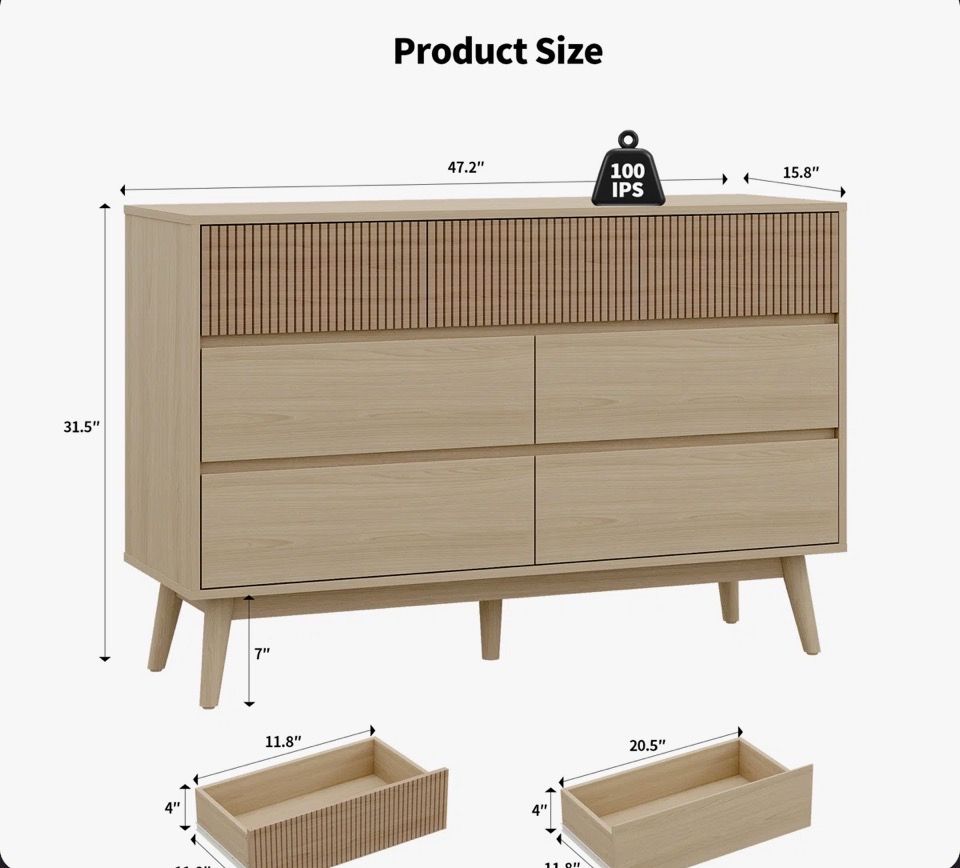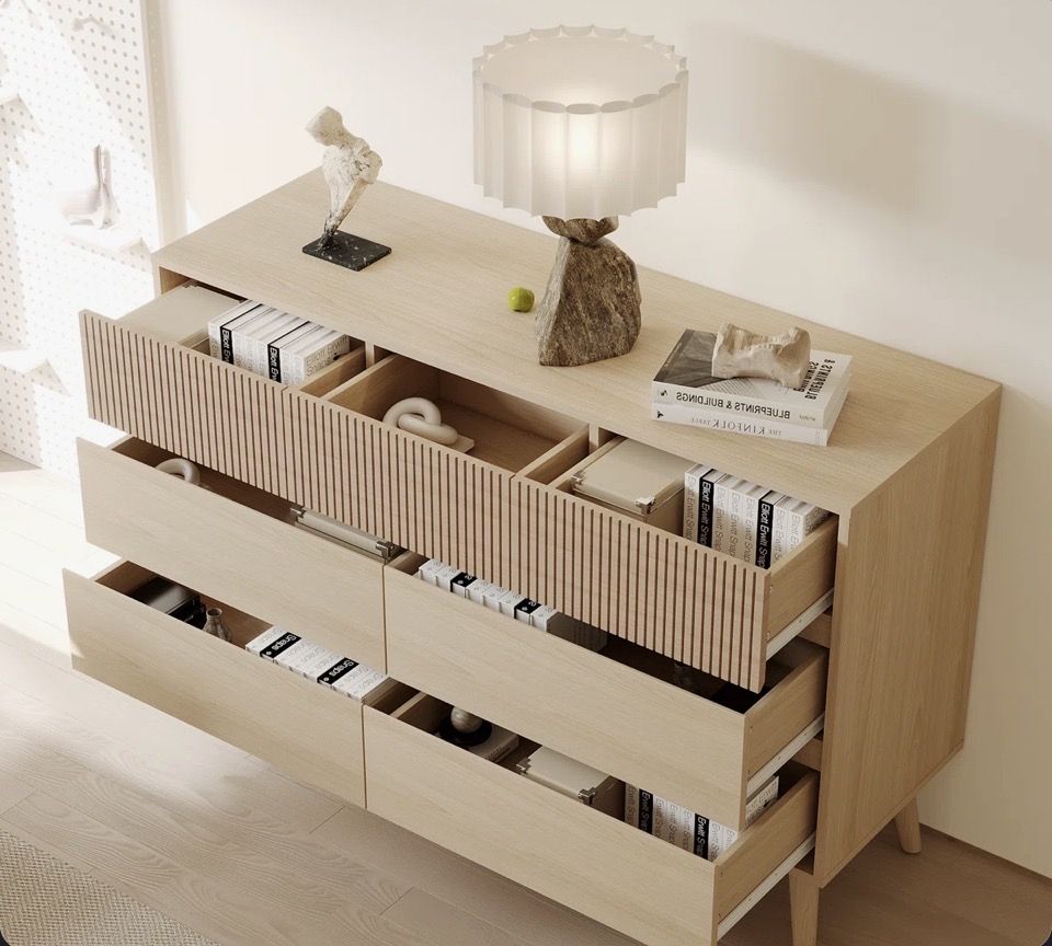 This 7-drawer dresser combines practicality with aesthetics. Its unique striped panel design shows the wood texture.The 7 spacious drawers provide ample storage space for clothes, books, toys and other daily necessities. Each drawer is equipped with high-quality hardware slides to ensure smooth opening. The cabinet is also equipped with an anti-tip device to ensure stability. In addition, the additional center leg support design further enhances the stability. Whether it is placed in the bedroom, living room or study, this 7-drawer cabinet will fit in perfectly and become part of your home decoration. Features Handle-Free Drawers: Innovative handle-free design simplifies the use experience, enhances the overall aesthetics of the cabinet. Large storage capacity: 7 spacious drawers provide ample storage space to easily organize clothes, books and other daily necessities. Durable Material: Made of high-quality wood to ensure the stability and durability of the cabinet, not easy to deform after a long time of use, suitable for daily use at home. Safety & Stability: Equipped with anti-tipping device and extra center leg support to ensure the safety and stability of the cabinet during use.