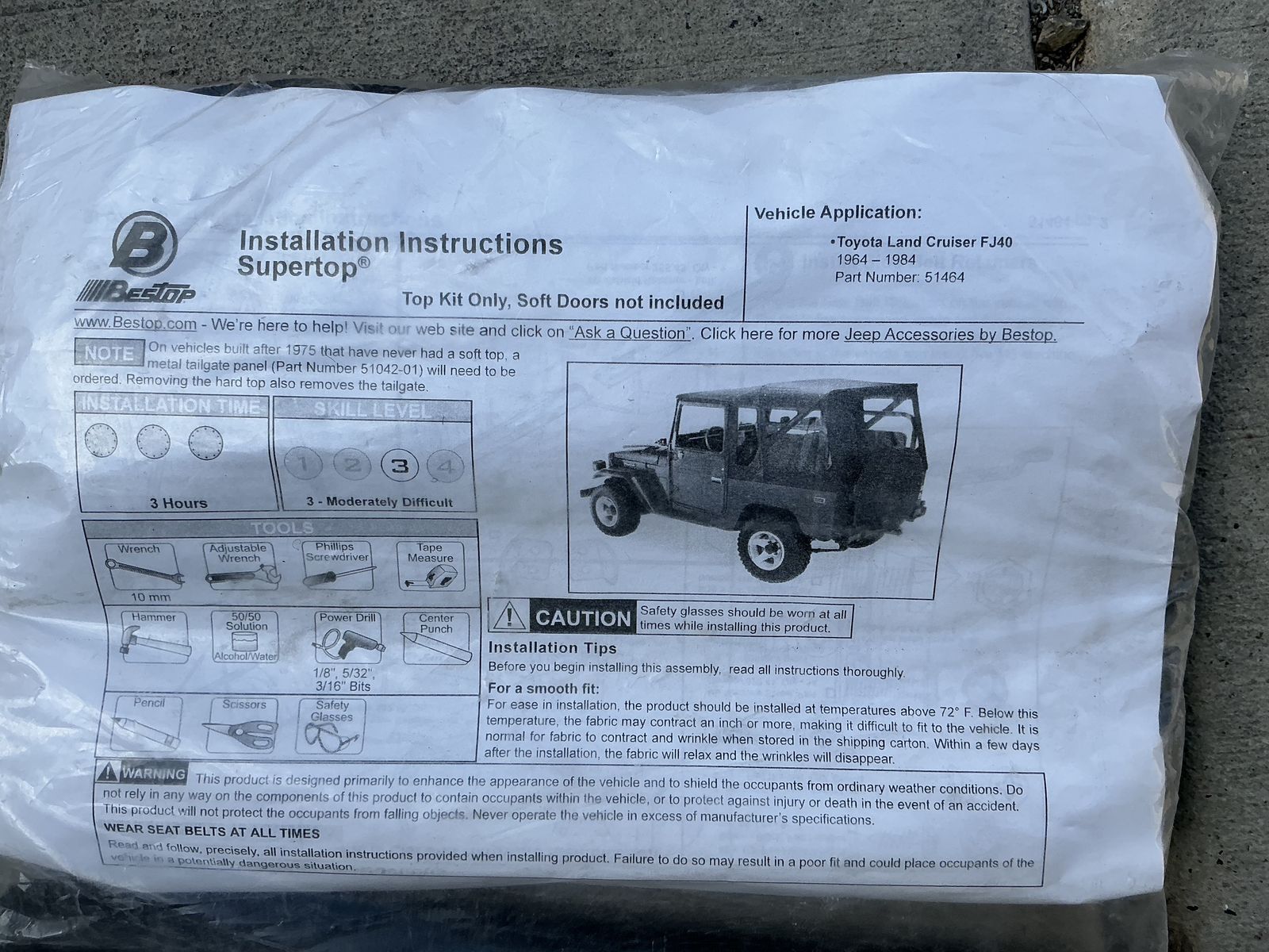 New unused soft top has been sitting in storage fits 1964 to 1983 FJ-40. Soft top does not include soft doors. It is made to be used with factory hard doors or soft doors if purchased .
