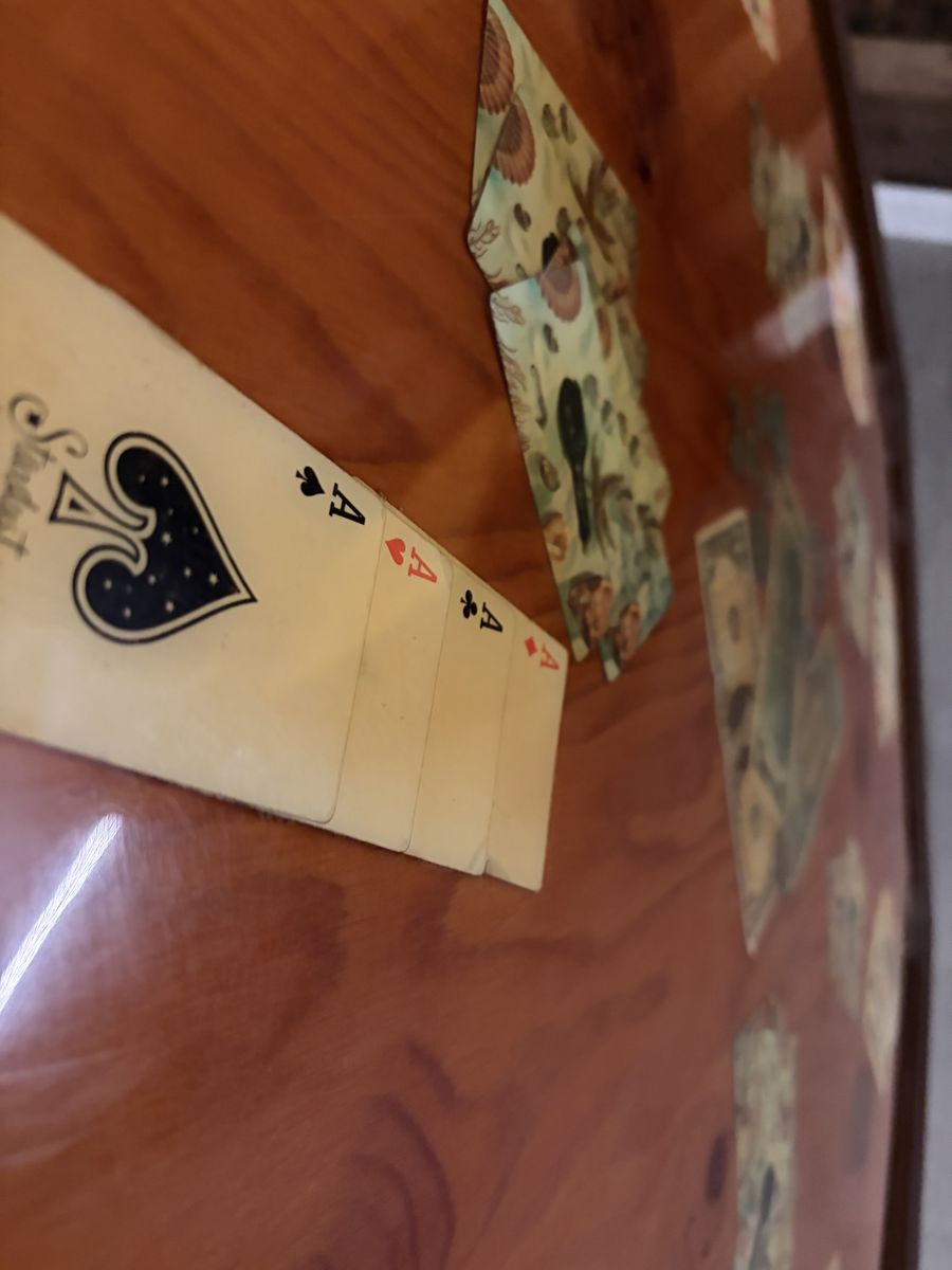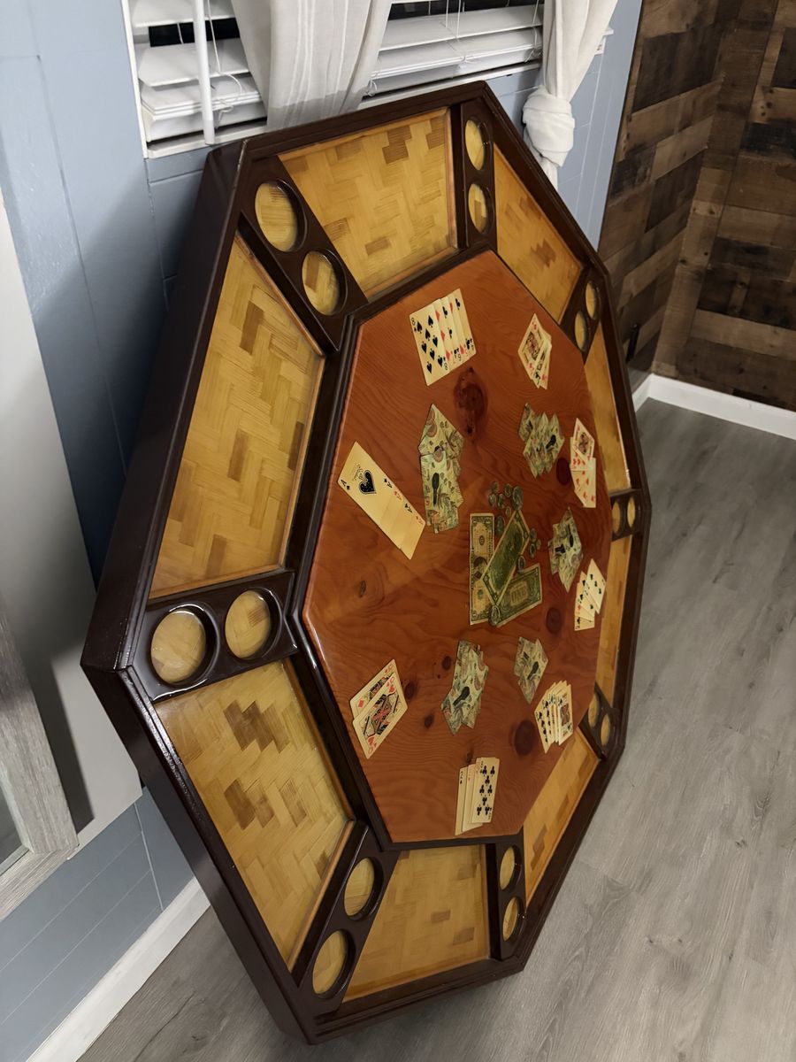 Beautiful vintage octagonal poker table top with a clear resin surface. Has built-in drink holders at each player position.