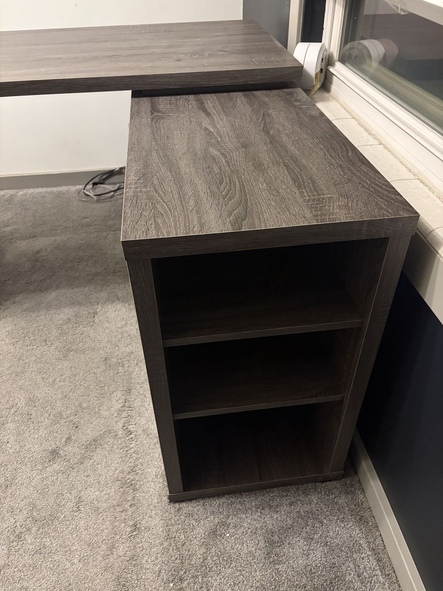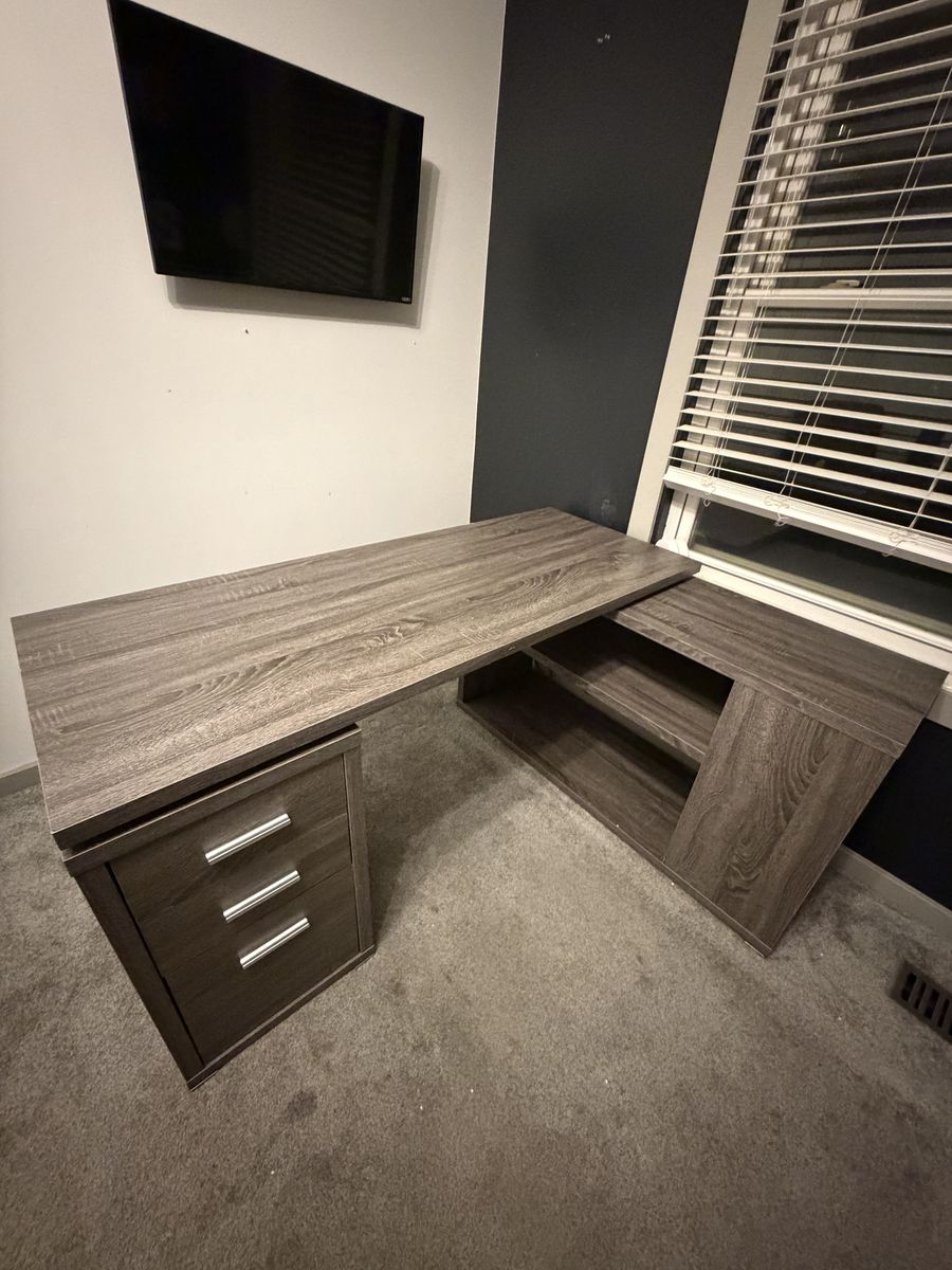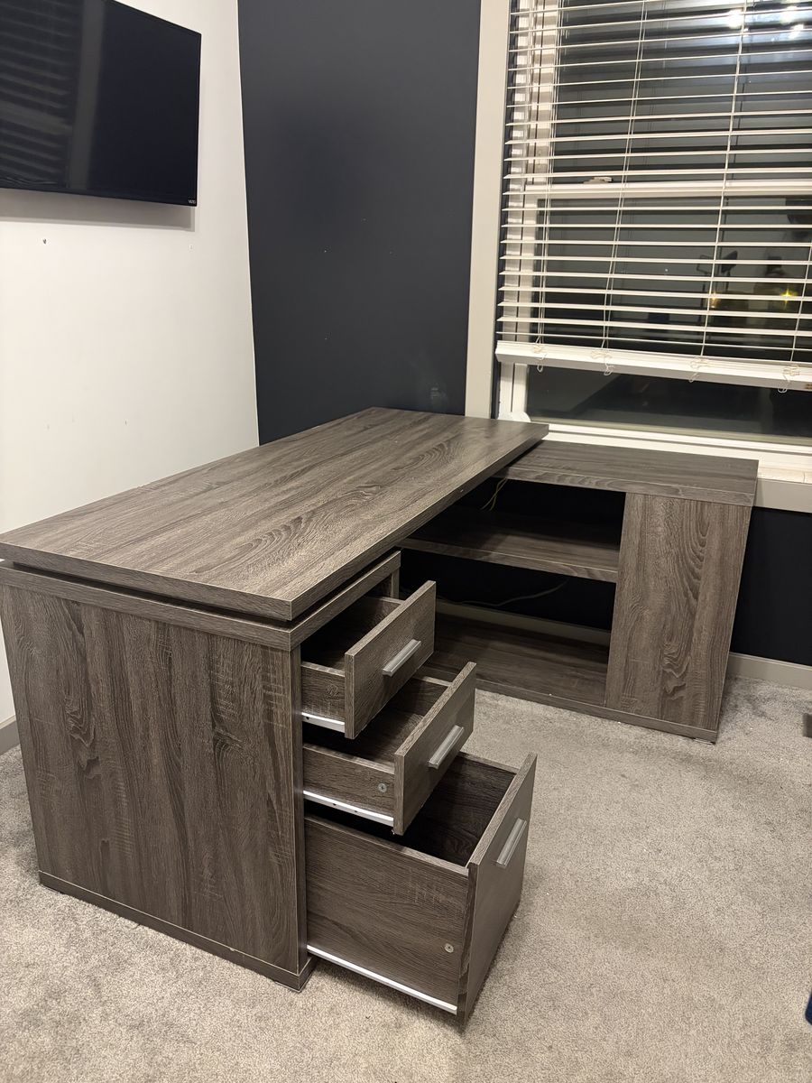 Gray/dark wood grain L-shaped desk in good used condition. Measures approximately 5 feet on the long side and 4 feet on the return, with a depth of about 2 feet. Features a 3-drawer pedestal on one side and open shelving cubby on the other. Some minor surface scratches and a couple of small chips on the edges visible in photos — priced accordingly. Sturdy and functional. Local pickup only.