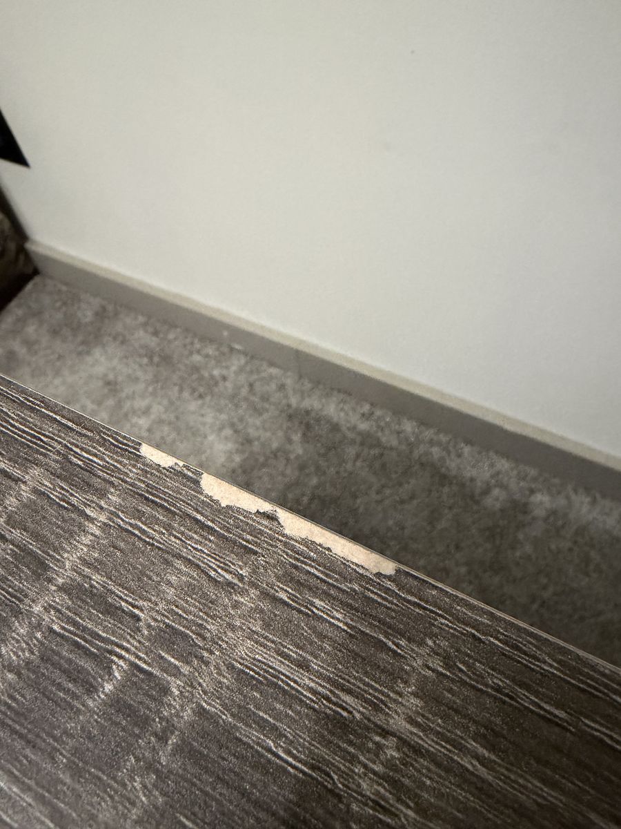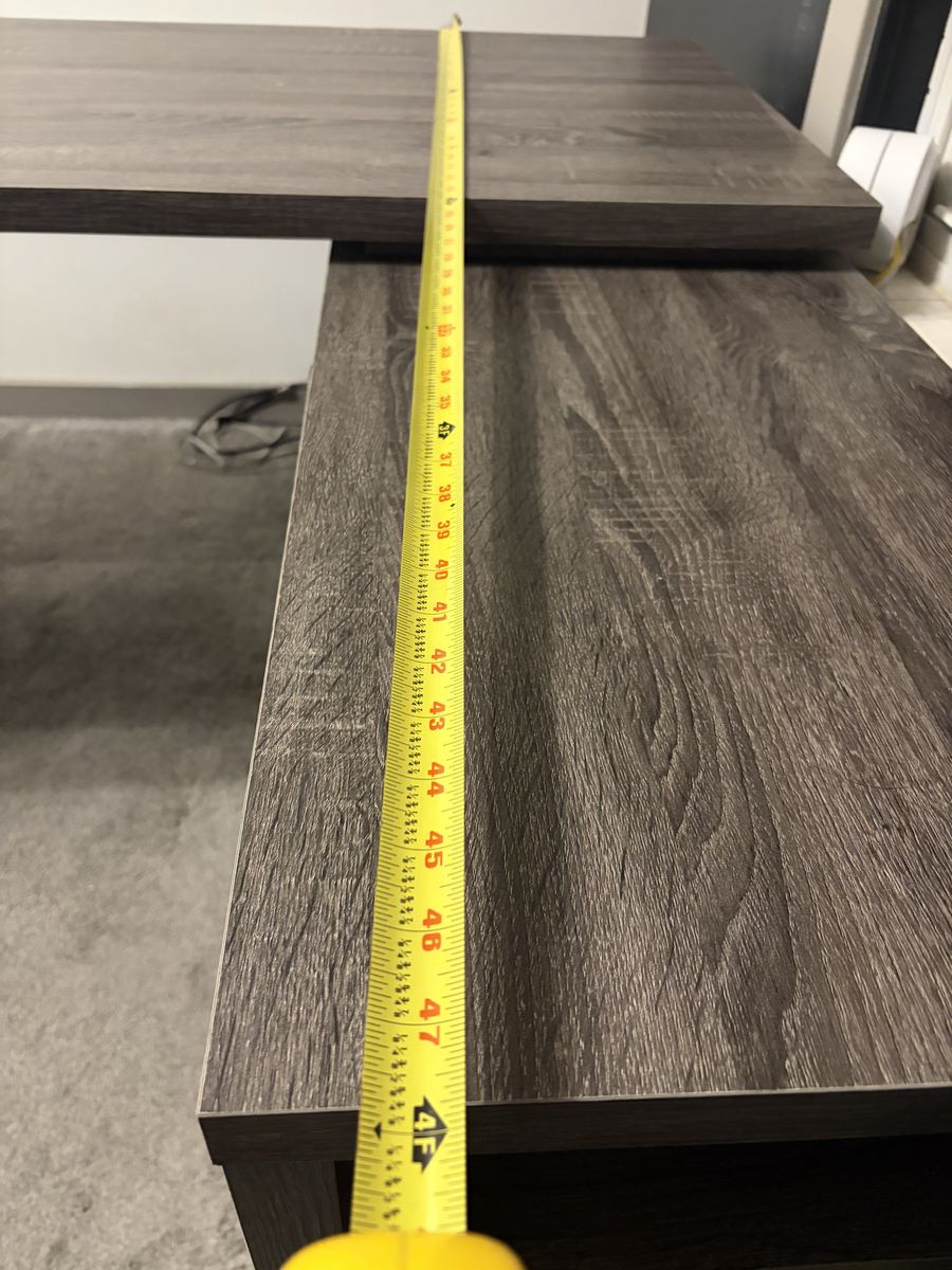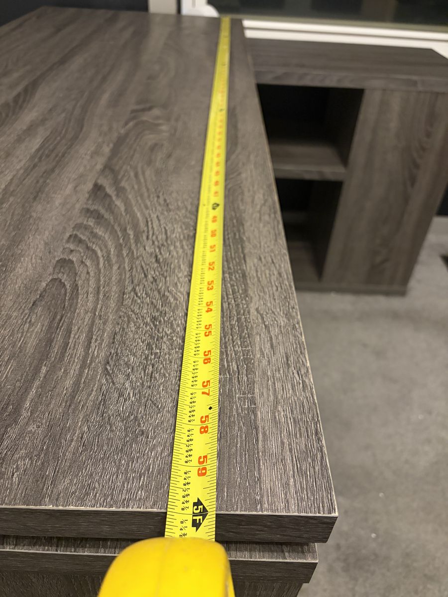 Gray/dark wood grain L-shaped desk in good used condition. Measures approximately 5 feet on the long side and 4 feet on the return, with a depth of about 2 feet. Features a 3-drawer pedestal on one side and open shelving cubby on the other. Some minor surface scratches and a couple of small chips on the edges visible in photos — priced accordingly. Sturdy and functional. Local pickup only.