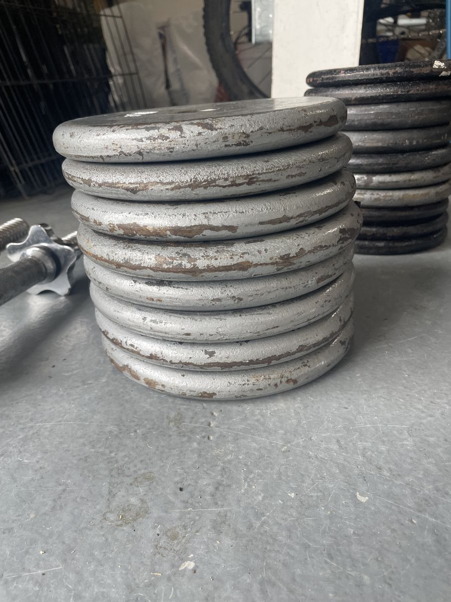 Each bar is long enough to hold up to four plates per side. Used but solid. Everything is metal, no plastic.