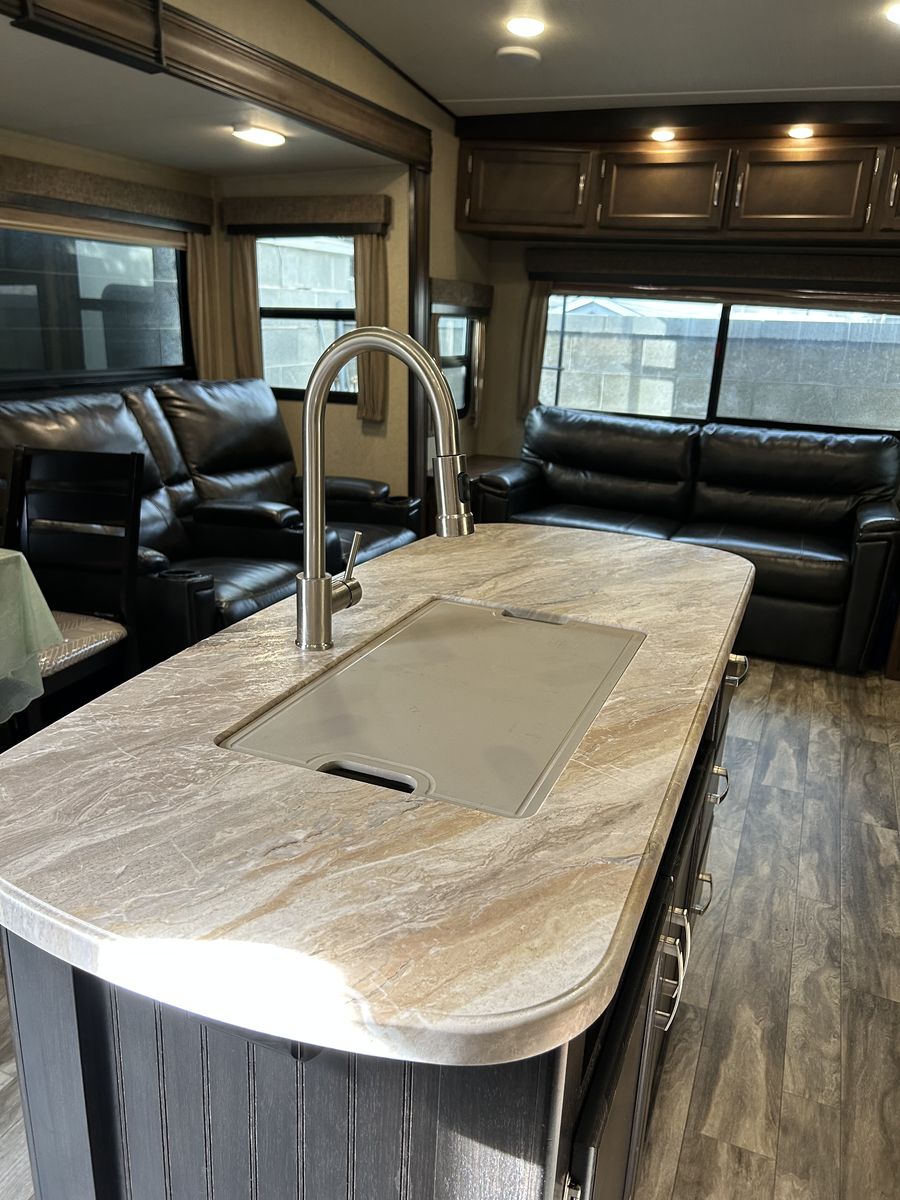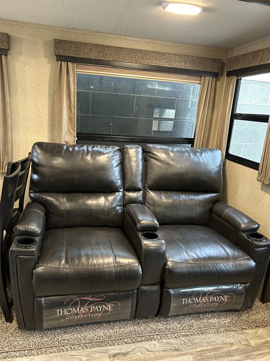 Center Island in Kitchen dining table with 4 chairs. Two leather recliners with heat and massage. Leather sofa that makes into a queen size bed. TV. /Fireplace.