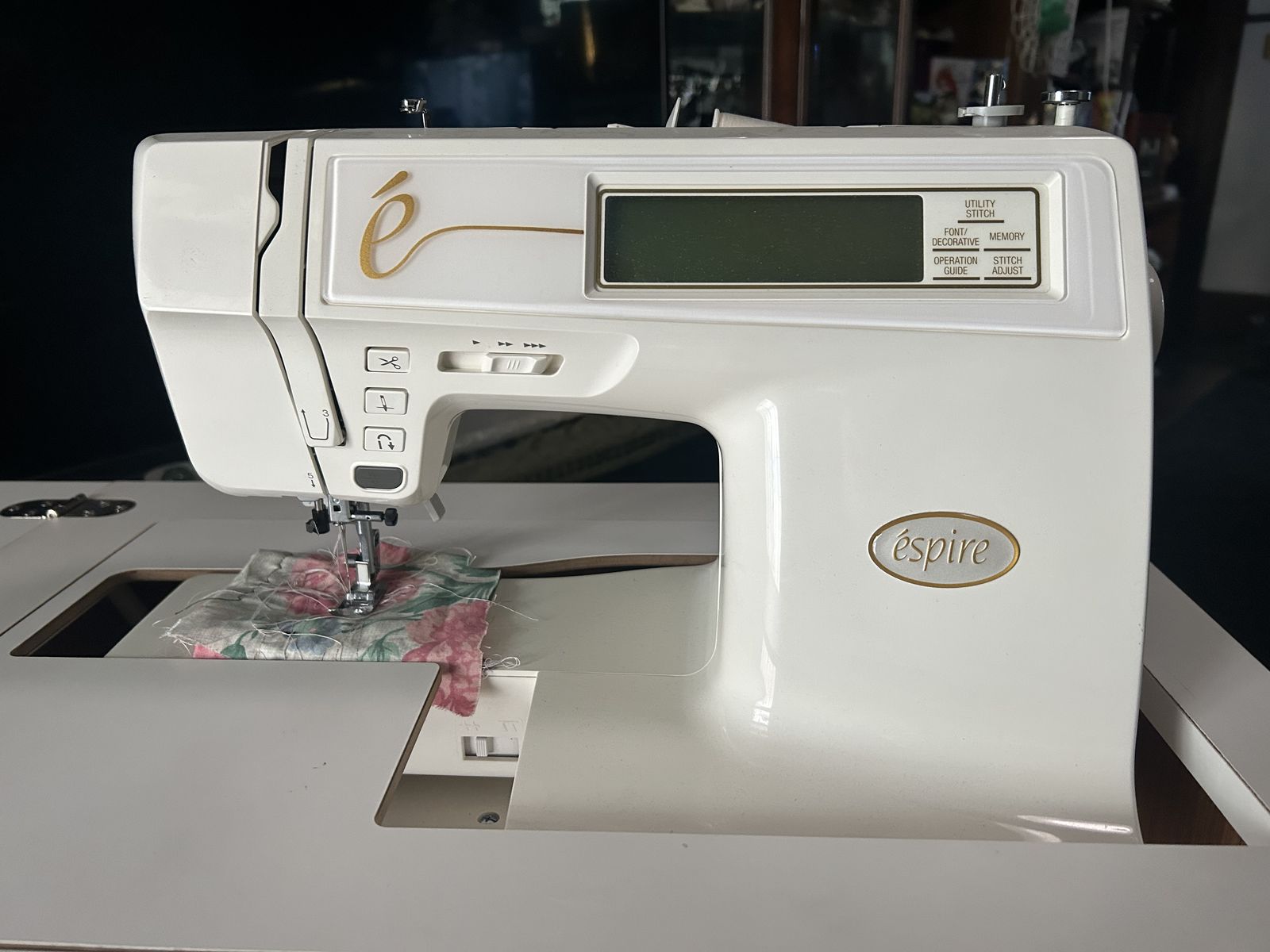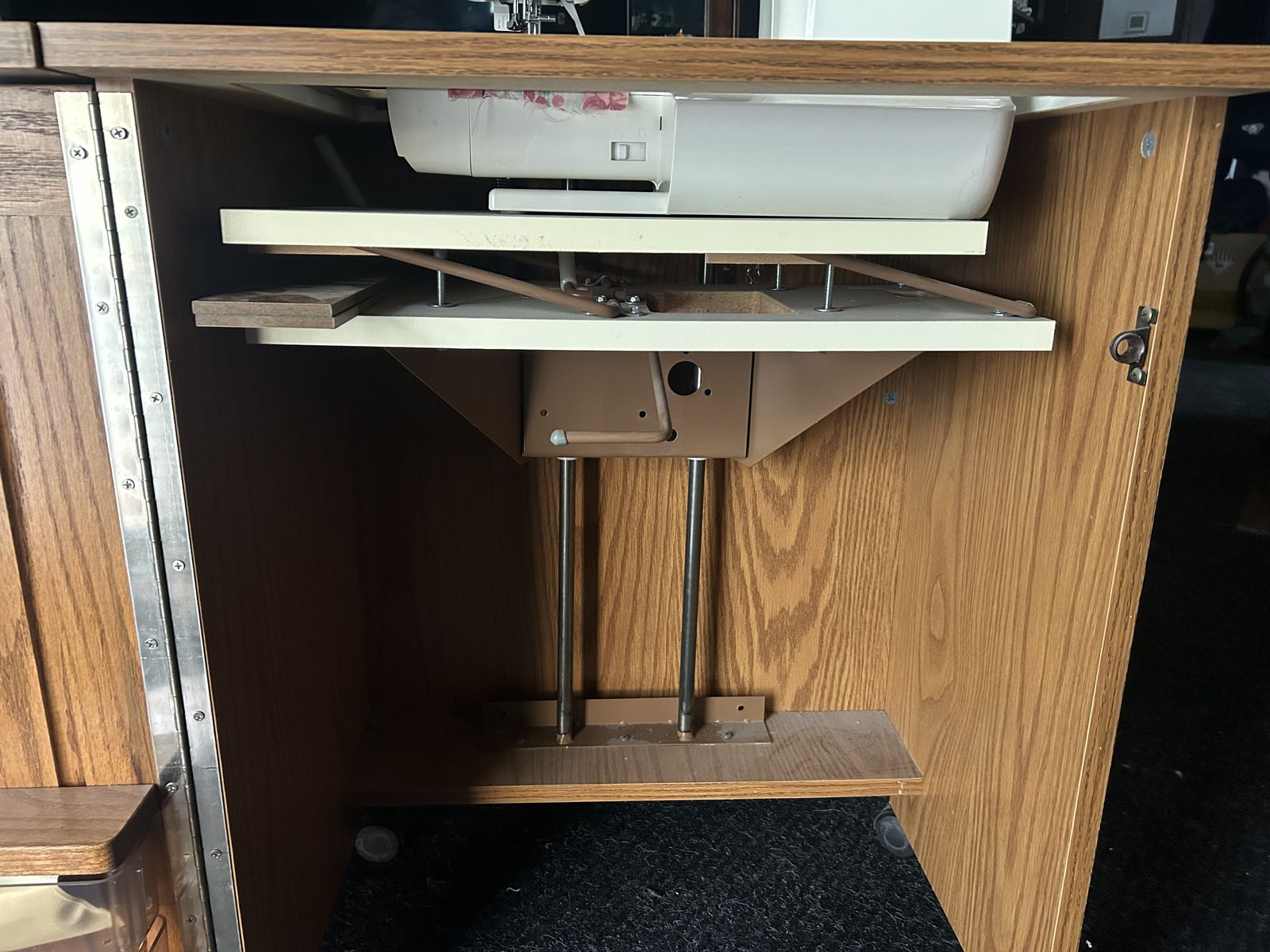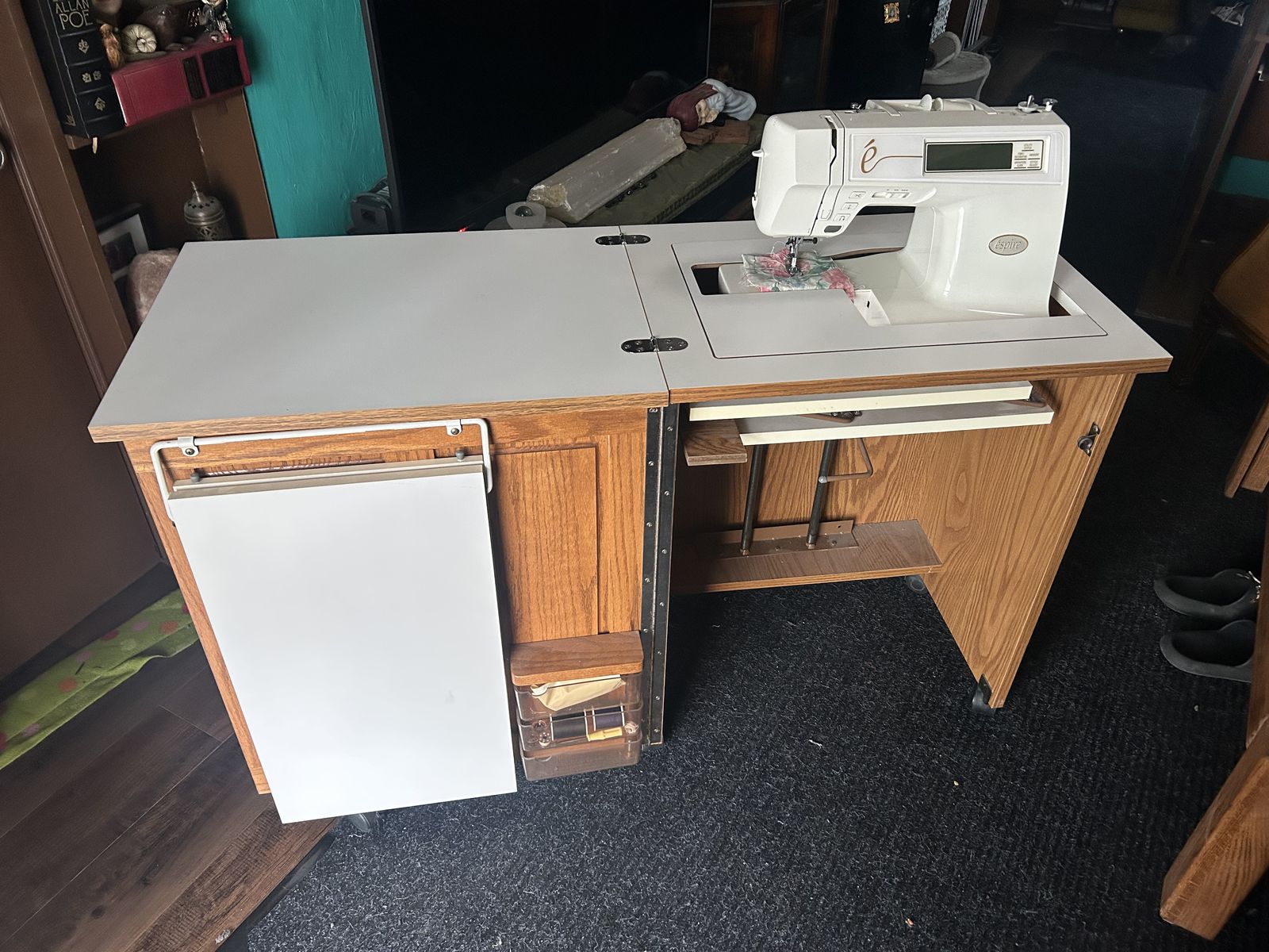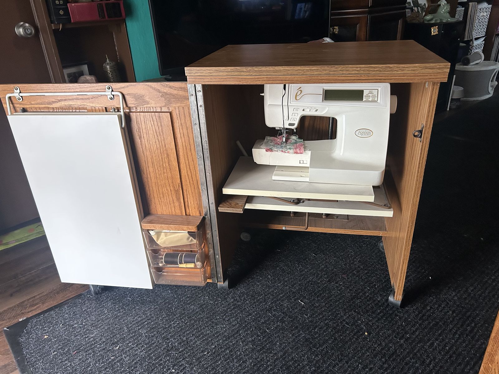 VenmoDigital sewing machine with cabinet for easy storage that has a side table and storage.