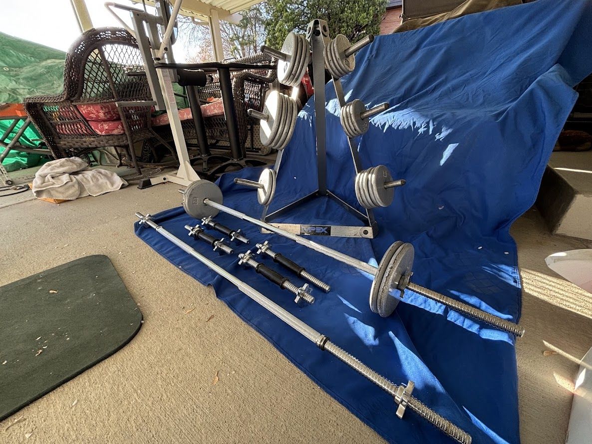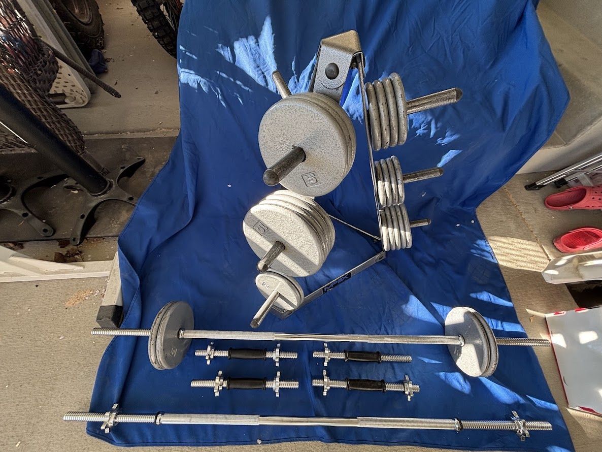VenmoSolid weights set with thread on collars. Set has (2) 5' barbells and (4) dumbbell bars. There are (8) 10 lb. plates, (11) 5 lb. plates & (8) 2 1/2 lb. plates, total 155 lbs. not including the bars. Also includes a MPX Pyramid weight rack. Everything is in very good cond., no surprises. Selling because I don't have the room for them anymore. $200 Call or Text Dana 801-599-4700. Cash or Venmo.